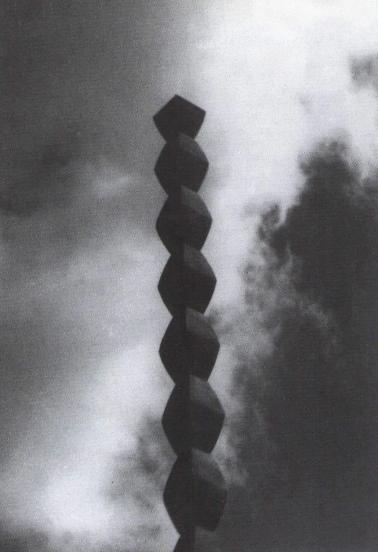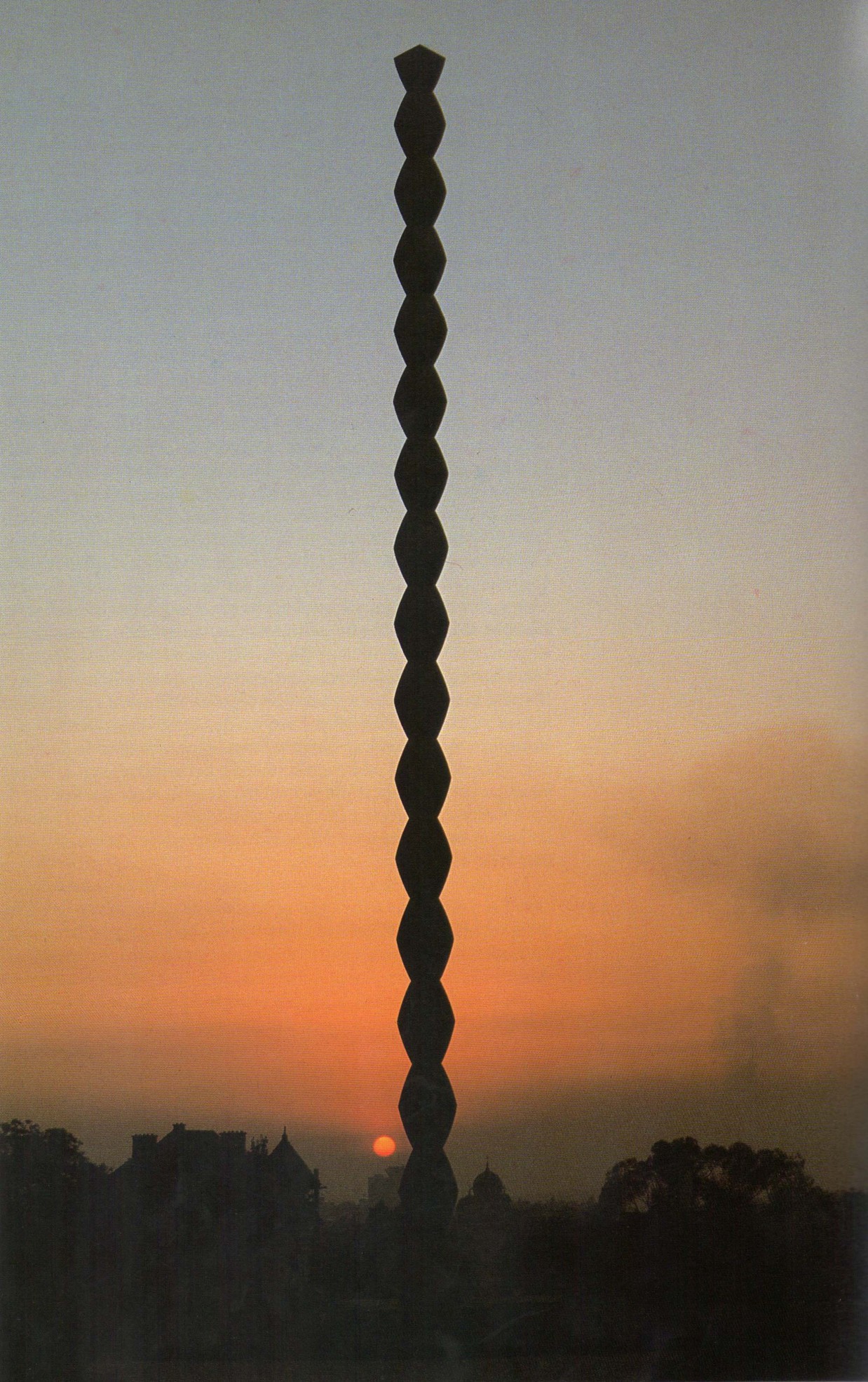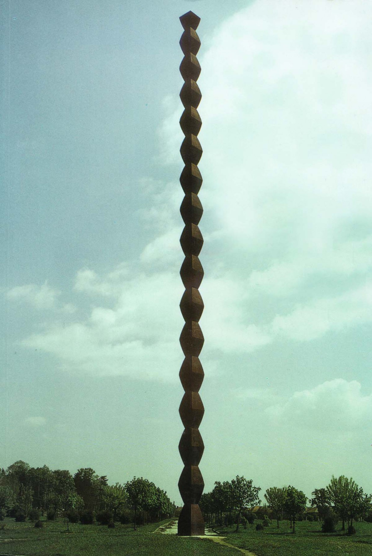 Em 1937, Brancusi concluía a sua Coluna Infinita (Coloana infinitului) em Tîrgu Jiu na Romênia. Situada num lugar aberto dos arredores da cidade, um objeto se impõe solitário no espaço: a escultura de extrema simplicidade compositiva, por sua pura existência, parece unir o céu a terra. Anuncia uma poética quase dramática, na tentativa de compreender onde o monumento se inicia e encerra, fazendo-nos olhar para sua base e, lentamente, percorrermos sua espantosa verticalidade até chegarmos ao seu extremo superior. Esta trajetória visual, incapaz de abarcar o objeto numa única mirada, coloca-nos numa condição imóvel no tempo e no espaço. Imóveis perante um monumento de aproximadamente 30 metros de altura, cuja única referência física aparente é a de cada um dos elementos que o compõe, equivalentes a altura de um ser humano. Constituído por estas unidades de ferro fundido, cujo acabamento dourado original refletia intensamente a luz do sol, a abstração de sua forma faz com que toda a mensagem que carrega se detenha em outros aspectos: um objeto que nasce diretamente da paisagem, sem uma base ou apoio que o sustente, e do qual presenciamos somente sua matéria crescente definida pela simples repetição vertical de uma unidade inalterável. Peças sobre peças dão origem a um todo do qual se desconhece o começo ou fim, colocando-nos perante uma longa sombra que persiste como retrato de nossa própria existência.