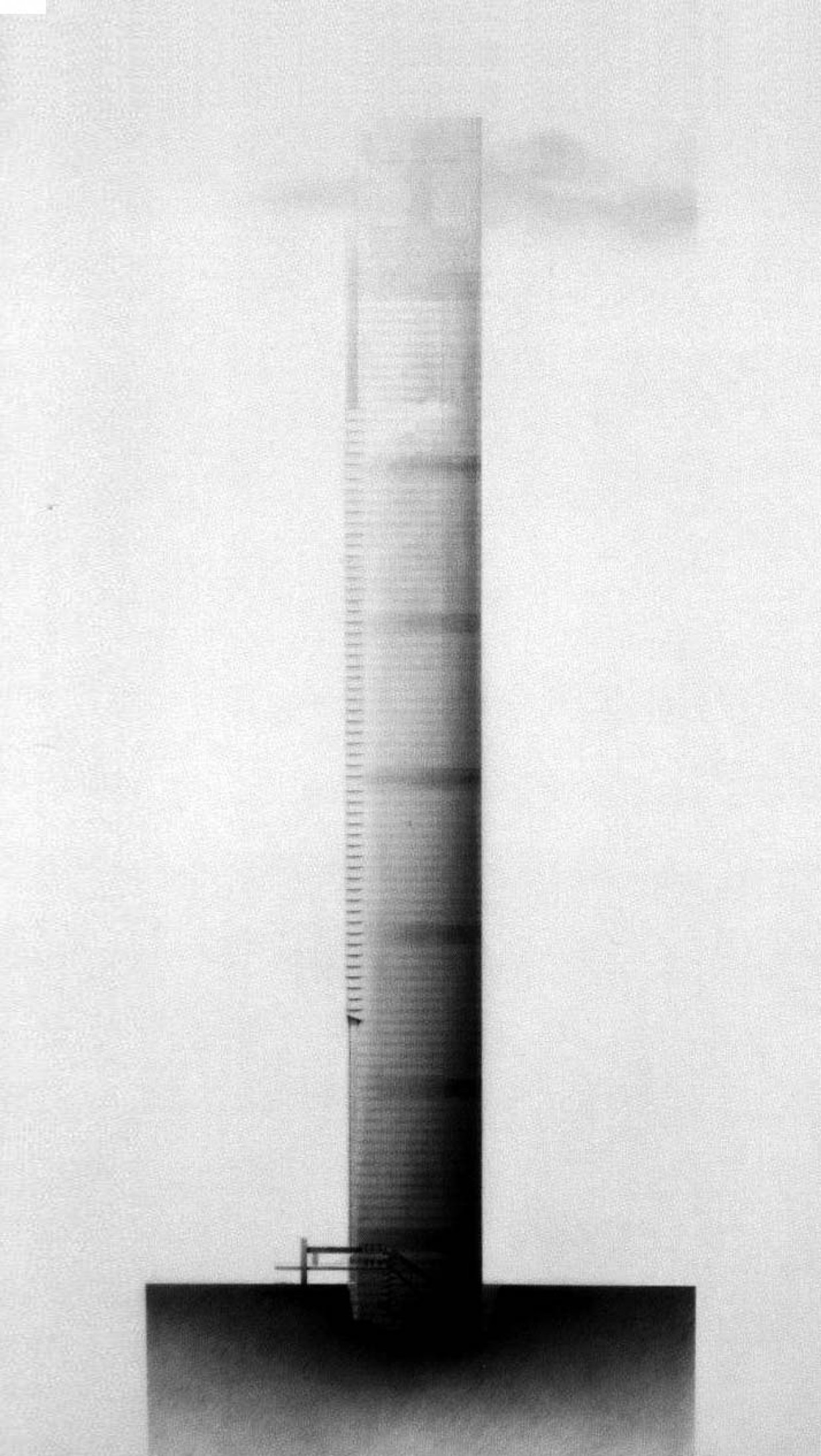 Para tanto, a força deste monumento não poderia ser pouca. Nouvel imaginava construir um enorme cilindro definido por uma verticalidade descomunal, com mais de 450 metros de altura. Uma forma sem arestas que, através de sua geometria circular, já nos colocaria diante um mistério ao impedir que se desvendassem seus limites. Como a obra anterior, este imenso menir contemporâneo não nos contaria sobre seu começo ou fim. Se Brancusi o faz através da forma de seus elementos, Nouvel o reinventa através de sua materialidade. Para quem se aproximasse da Torre Sem Fim, encontraria a base de seu monólito revestida por pedras negras - escuras como a profunda cratera da qual estaria emergindo de forma incompreensível. À medida que ascendesse seu olhar, este mesmo volume sólido, se esvaeceria em uma transparência crescente até se confundir com a própria luminosidade do céu. Da base opaca de pedra ao vidro que gradualmente se tornaria cada vez mais transparente até desaparecer, o arquiteto nos coloca diante de nossa realidade física e espiritual. A expressão da matéria descreve a maneira que o tempo age sobre essas manifestações humanas, tornando-se uma metáfora sobre como o tempo age sobre nós mesmos. A eternidade que este objeto transfere para sua escala e forma imutáveis é também contraposta aos momentos em que presenciamos a mudança de sua composição. Sua arquitetura passa a se compor de uma materialidade eterna, mas ao mesmo tempo, inconstante: a luz, o céu, a noite. A construção é modificada a cada instante, instaurando o mistério do imprevisível através de seus reflexos.