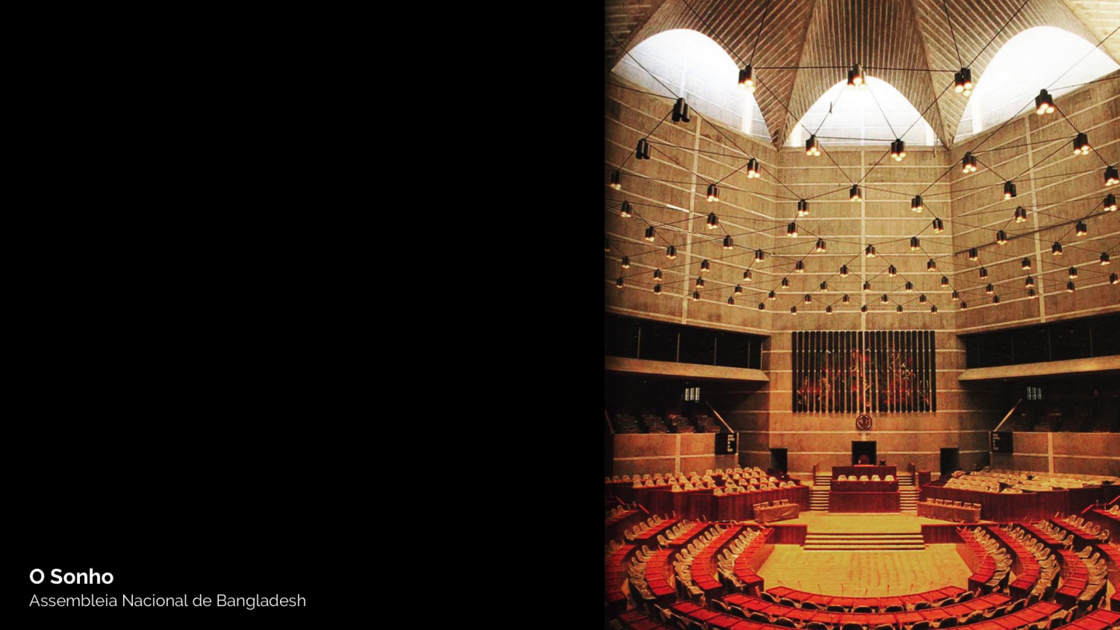 Era intimidadora a violência daquele mundo exterior: social, econômica, militar, urbana. Era inadmissível de todos os jeitos. De fato, como o arquiteto um dia explicou, o que se construía ali era uma fortaleza medieval, guardada por muros atrás de muros. Era esse o lugar que um dia mais desejei estar. Muros, portas, barreiras, pontes, corredores e vazios. Após transpor cada um deles já num deleite arquitetural sem precedente, encontrava-me então diante da pequena porta que me levaria ao centro da fortaleza. Pelo acaso, estando o parlamento vazio, permitiriam meu acesso e de minha esposa, desde que acompanhados por dois soldados de farda marrom e armados com armas e olhares. Deixei que todos entrassem antes e solitariamente transpus a pequena porta ao lado da plenária central. Chegava no lugar devotamente sonhado: seria pretencioso descrever o indizível. O que posso dizer é que, naquele dia em Daca, aqueles dois homens possivelmente não tenham entendido porque eu chorava tanto e porque os agradecia fervorosamente. Mas quero crer que tenham percebido que aquilo que protegiam, aquele lugar, aquela arca, aquela arquitetura, alcançava para alguém a condição de sagrado. Espantavam-se, talvez, com a possibilidade simples de se emocionar.