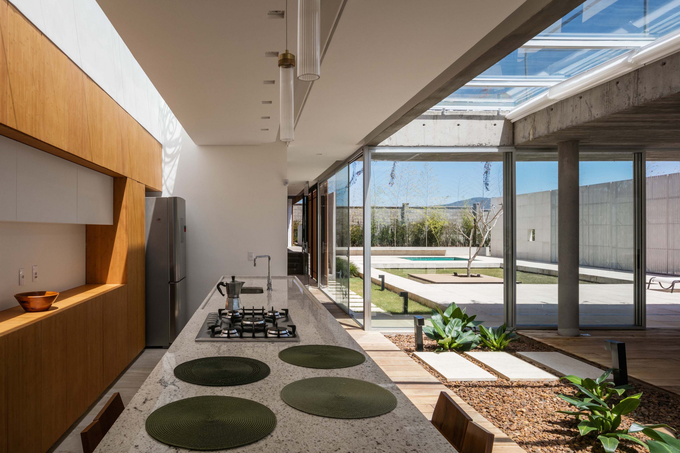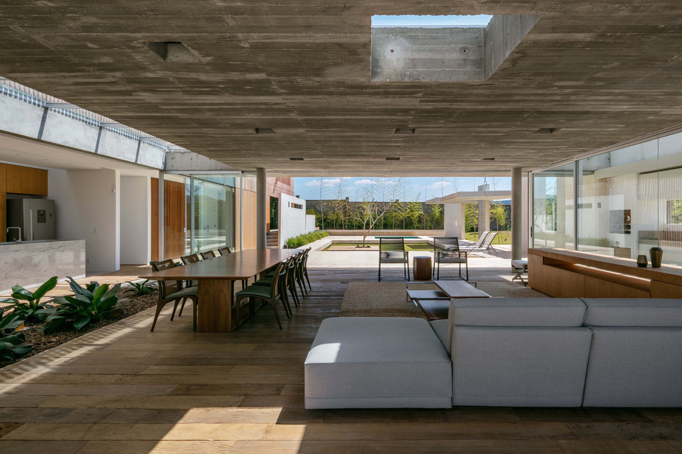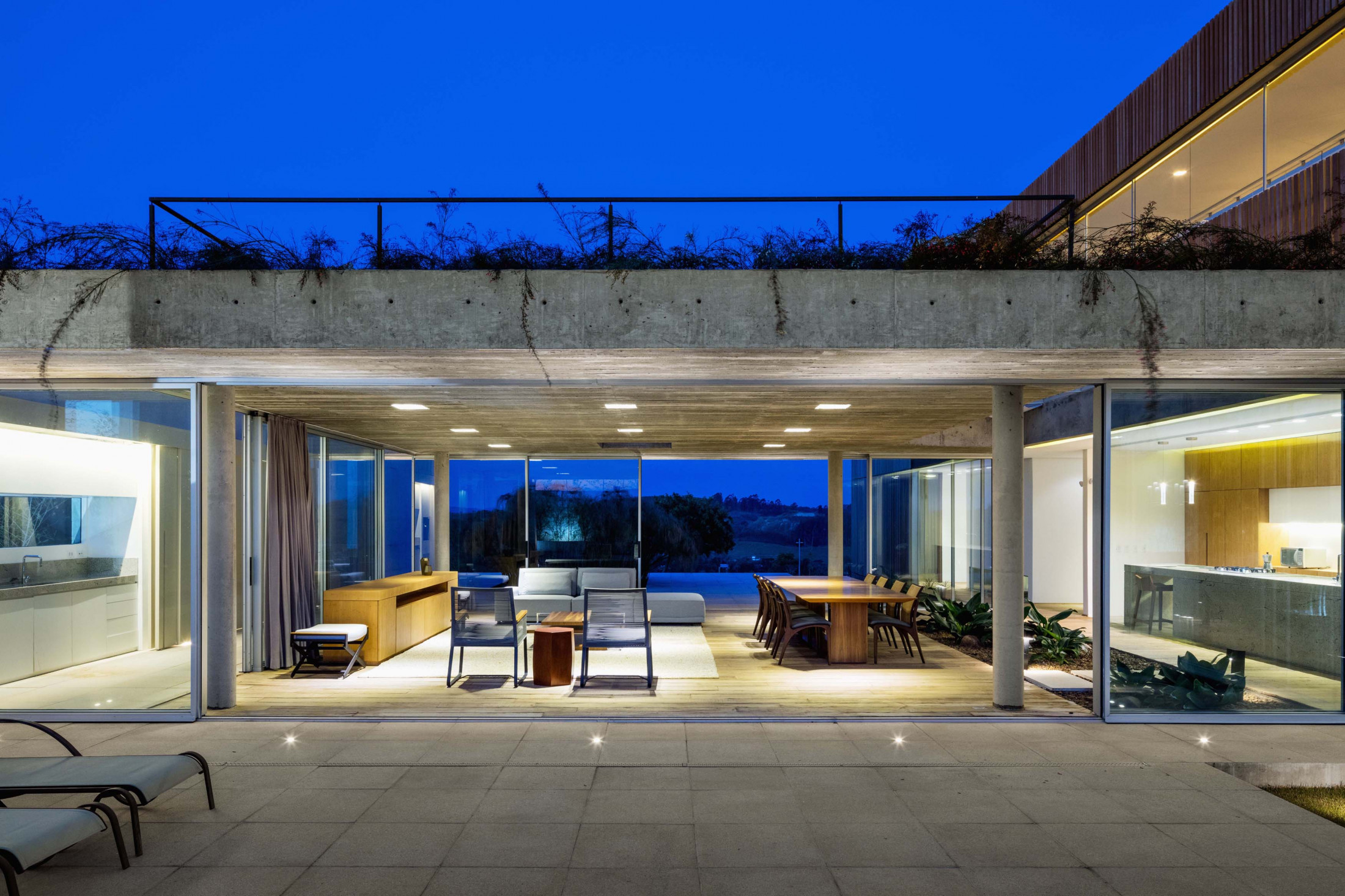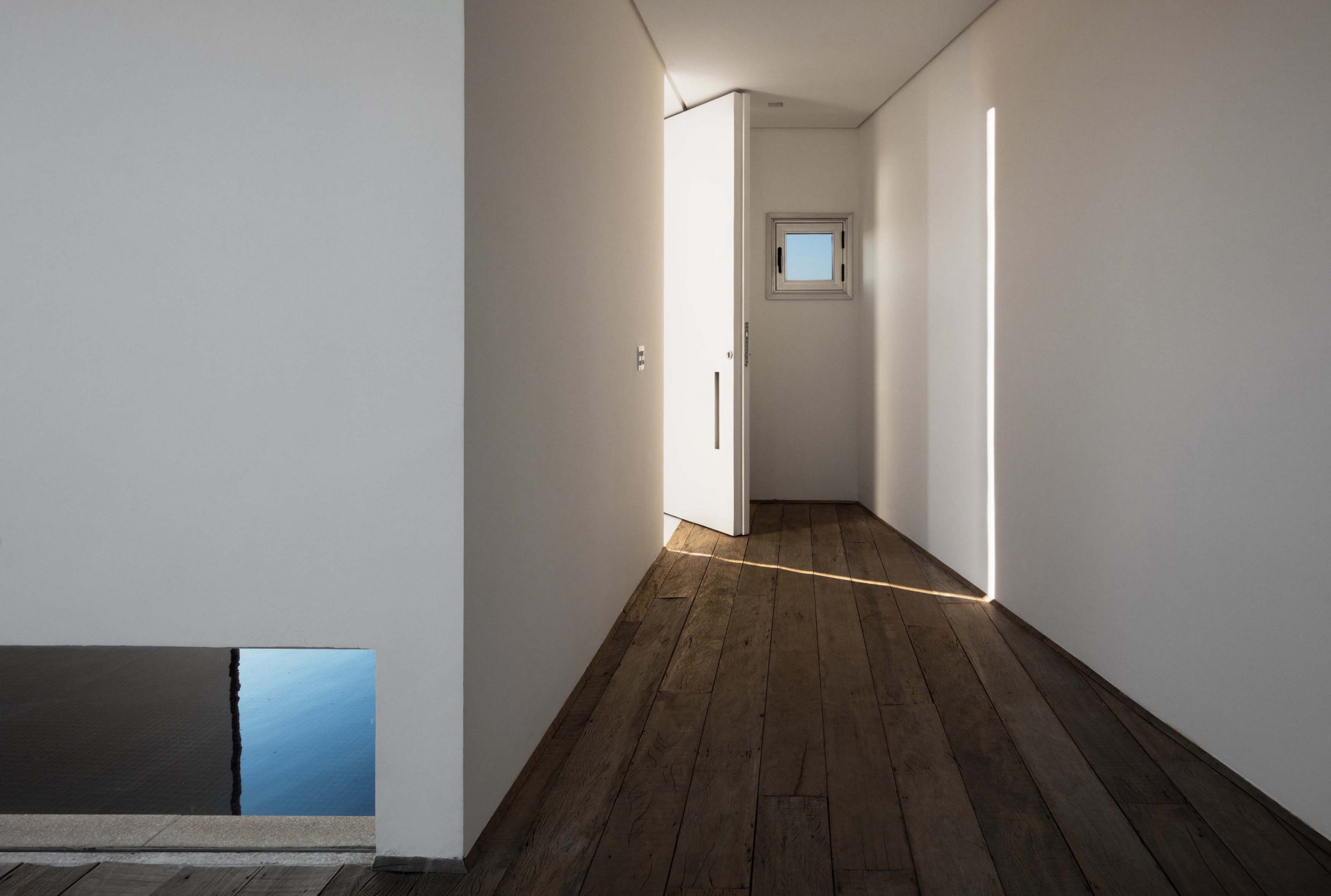 As if carved from the inside out, the main volume is 35 meters long and has a series of moments and voids ranging from the patio – designed not as a door but as a transition between the outside world and the inside – to a sequence of spaces that accommodate much of a traditional house program. Other subtractions gradually unfold within and are associated to a kind of 'window-ode' in which its facades are transformed: countless openings of different sizes, layers and functioning carefully frame the surrounding landscape, bringing it in and creating living pictures at every moment on is circulating inside.