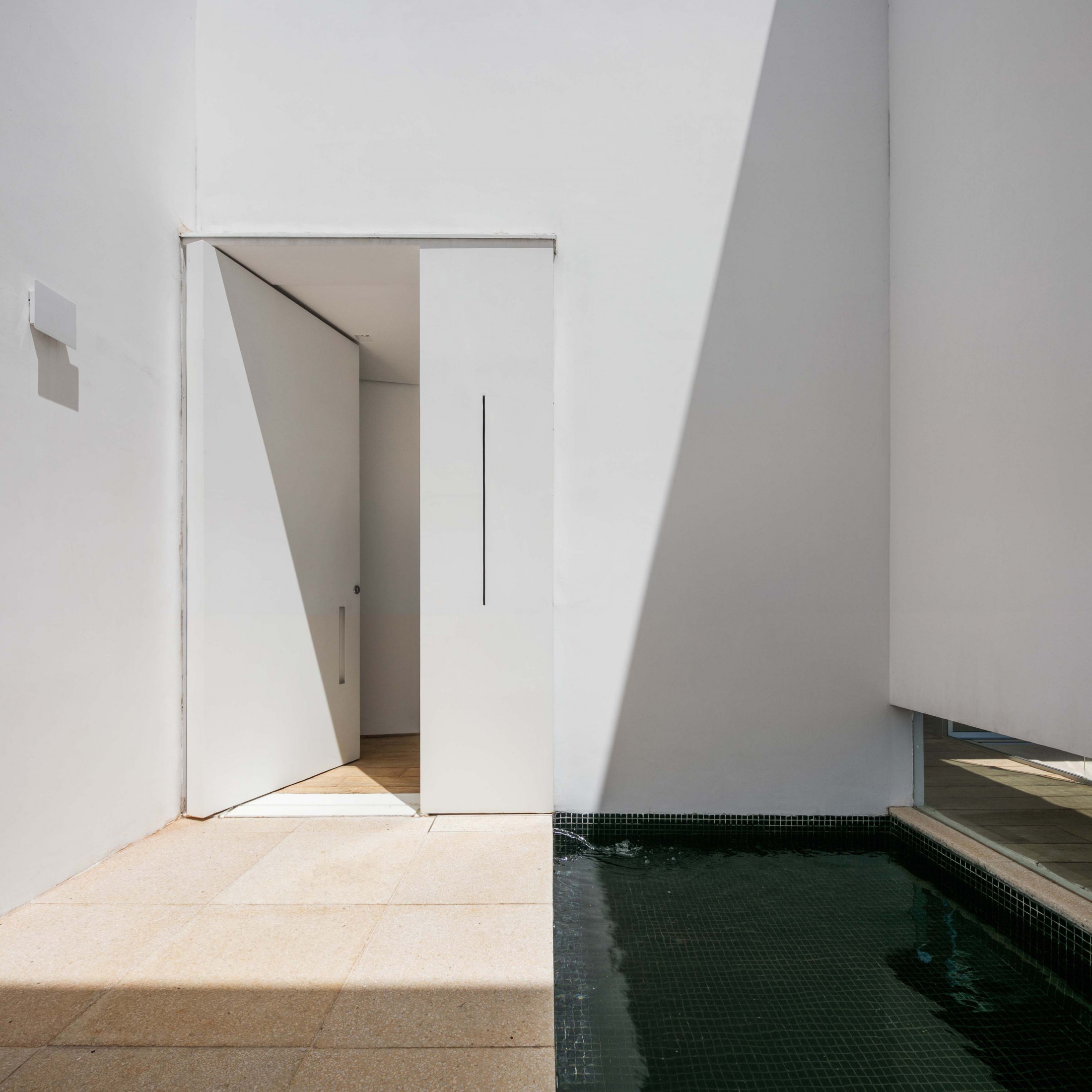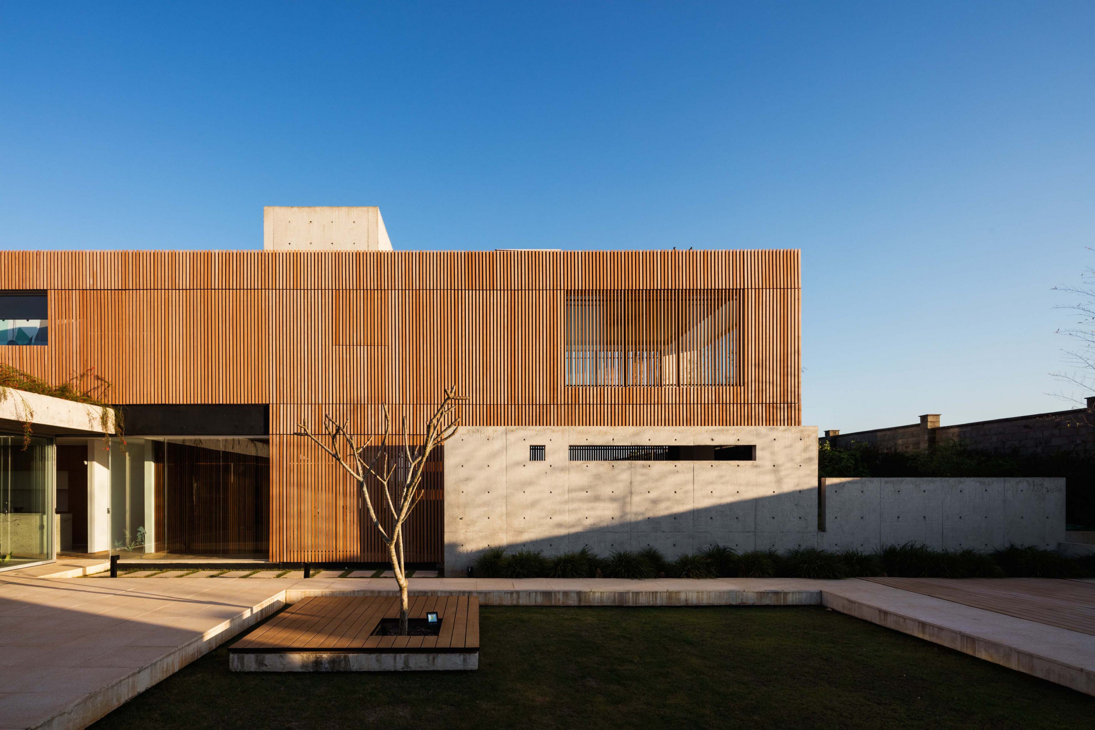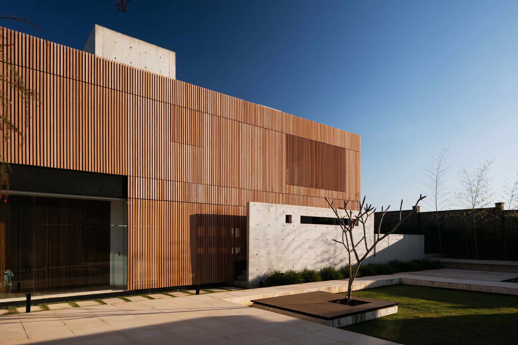 Situated on a privileged corner condition this house makes use of its two fronts to organize and reveal itself. The compositional synthesis that defines it has two moments: a monolithic volume anchored to earth and a set of slightly suspended perpendicular planes. The first emerges from the topography, the second floats over it. Without resorting to the modern stylistic models of the glass box, the structural supports or the excessive cantilevers, there is no excess but the precise positioning of elements that configure a spatiality of its own.