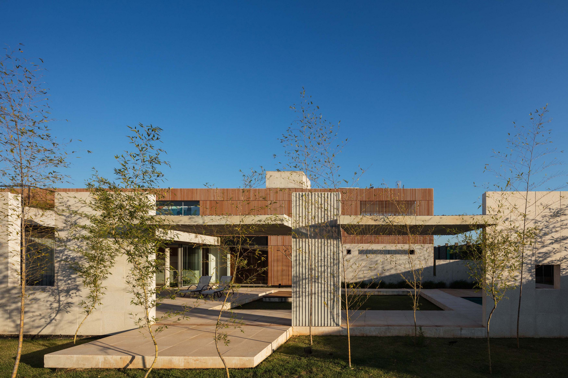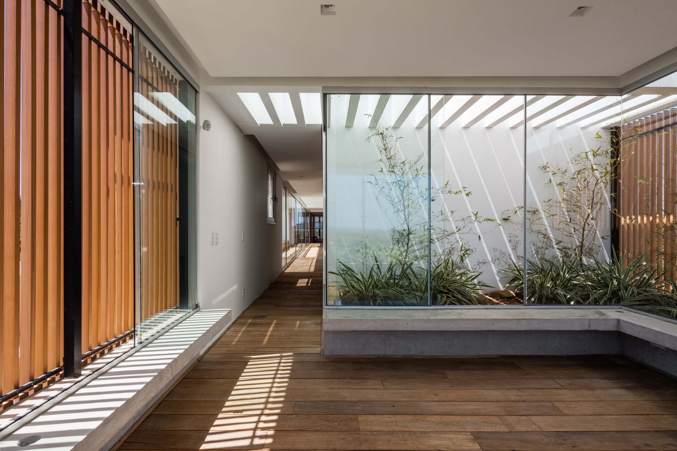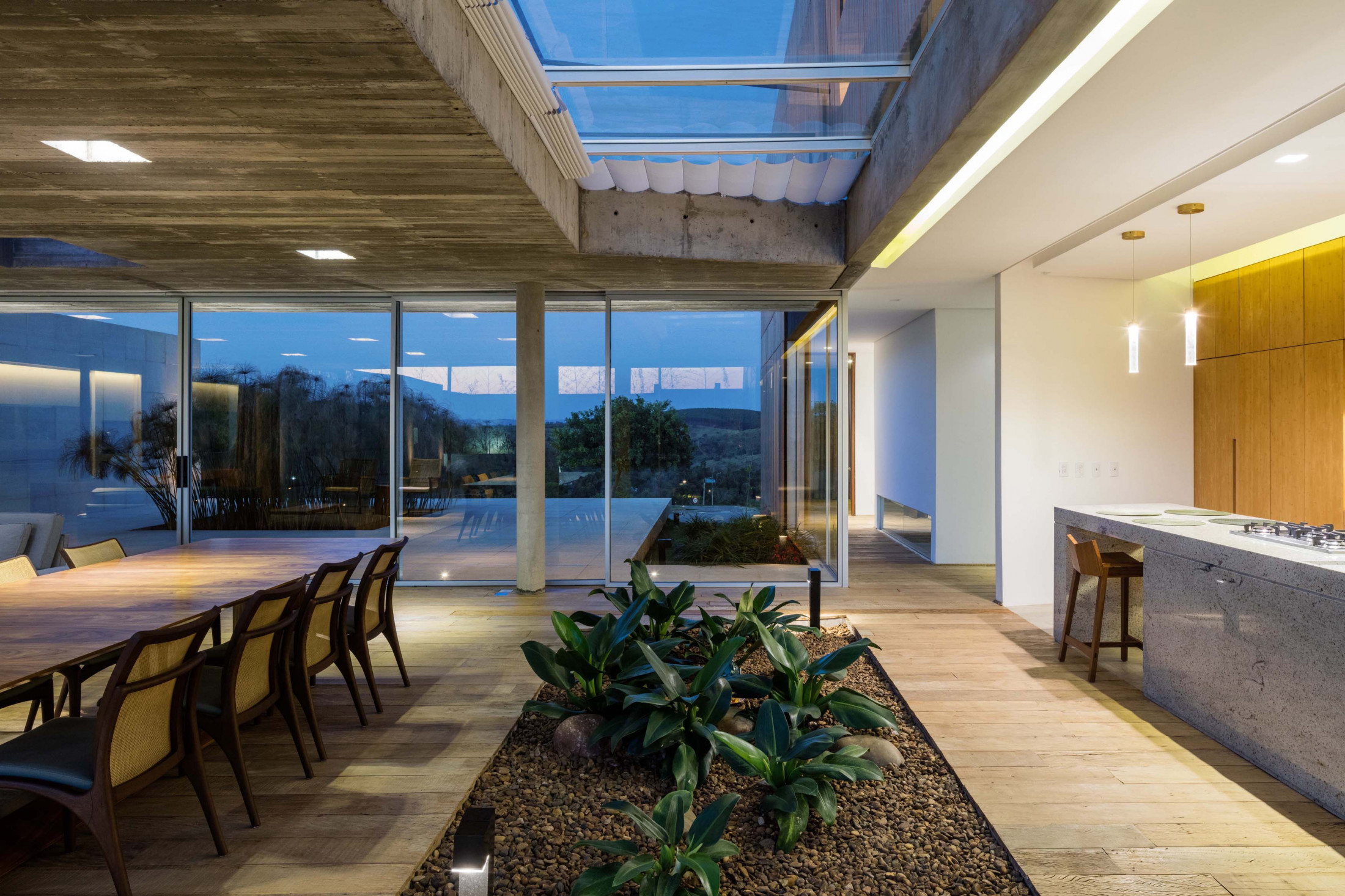 The second moment of construction is defined by two plans, a horizontal one and a vertical one, reflecting the master volume settings. In it we see the central living room, still an interior space but fully open to the specific set of outer spaces. A sequence of courtyards and gardens set their relations with the landscape and with the different dimensions of coexistence that they configure: from the social courtyard that faces the mountains, to the courtyard that is designed as an internal square, we see family life happening. Sunny or shaded, dry or green, with different types of vegetation and water, these squares accumulate the possibilities of living in a house added to the raised terrace on the roof of the central living room.