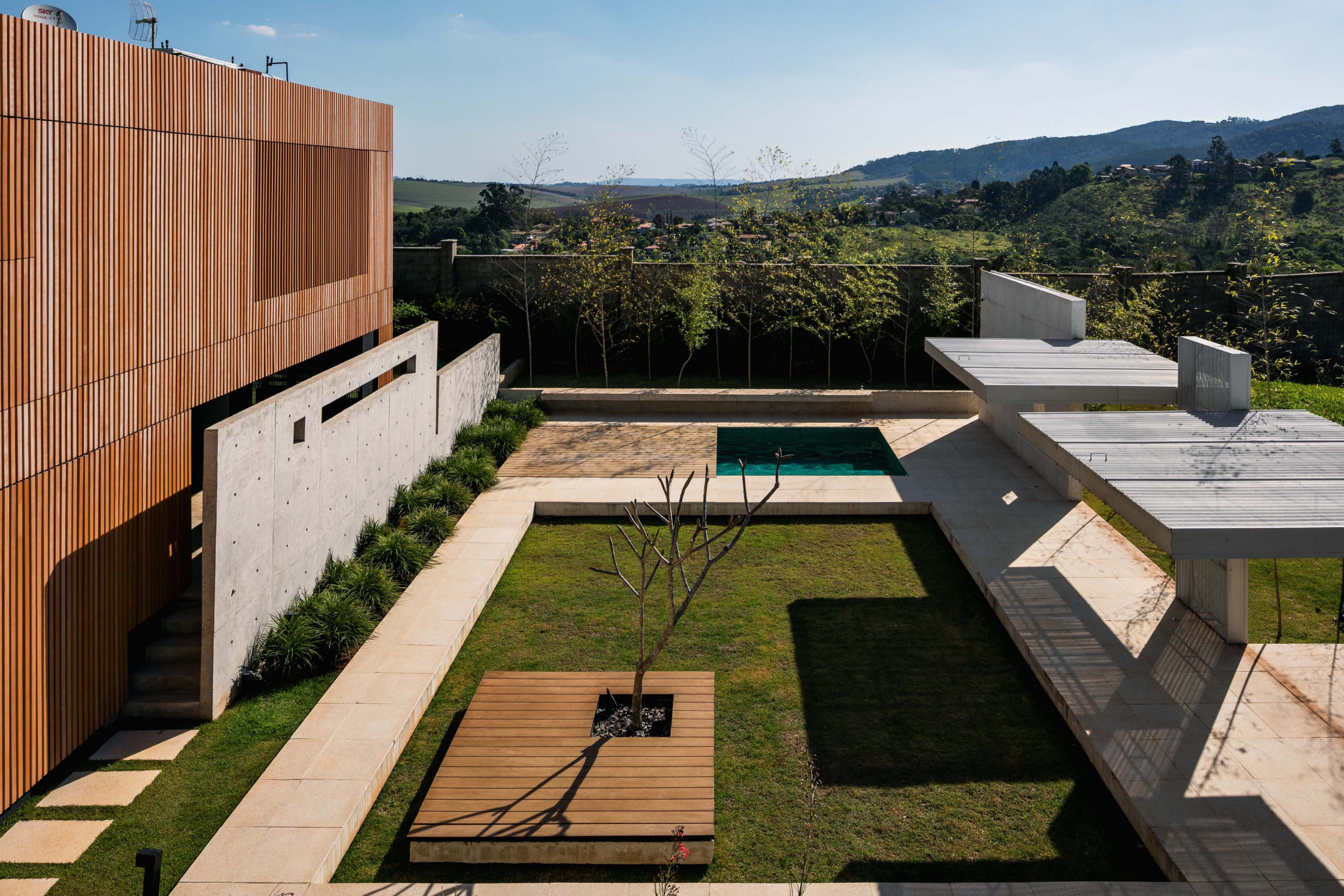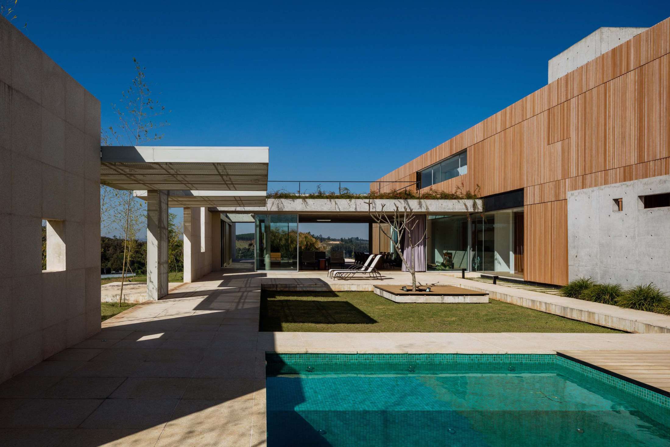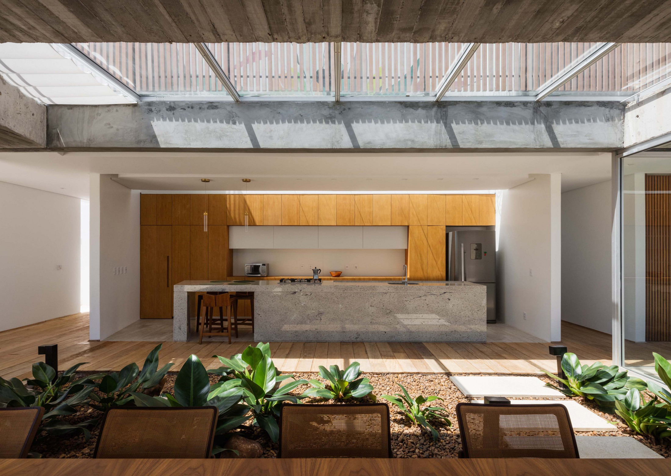 The second moment of construction is defined by two plans, a horizontal one and a vertical one, reflecting the master volume settings. In it we see the central living room, still an interior space but fully open to the specific set of outer spaces. A sequence of courtyards and gardens set their relations with the landscape and with the different dimensions of coexistence that they configure: from the social courtyard that faces the mountains, to the courtyard that is designed as an internal square, we see family life happening. Sunny or shaded, dry or green, with different types of vegetation and water, these squares accumulate the possibilities of living in a house added to the raised terrace on the roof of the central living room.