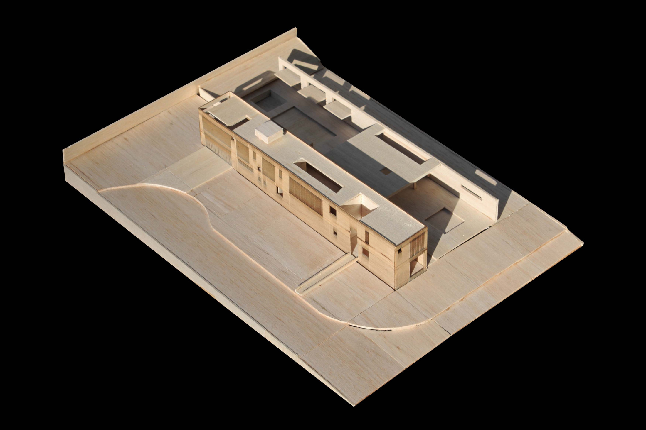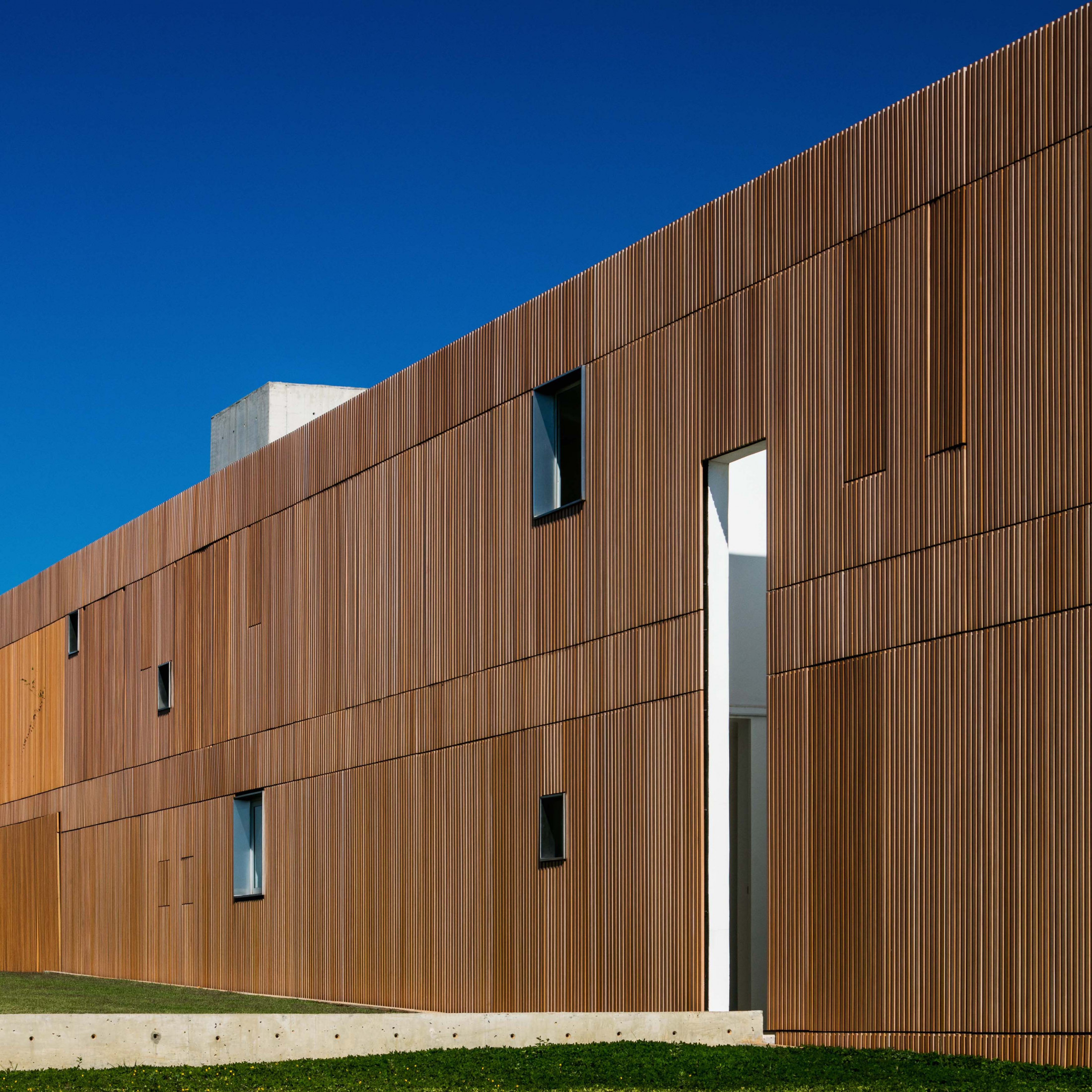 The materiality of the building is defined by a reinforced concrete structural system and a series of lightweight steel and ecological wood elements that cover the façades of the main volume giving it substantial thermal protection as a ventilated double façade system. These elements enable the manufacturing of various shutters and openings that allow users to control their privacy, natural ventilation, luminosity and visuals. Outside, two large movable metal panels have the same flexible character being able to stand upright (which defines the boundary plane), or horizontally shading the inner courtyards as large umbrellas manually and lightly controlled through their counterweights.