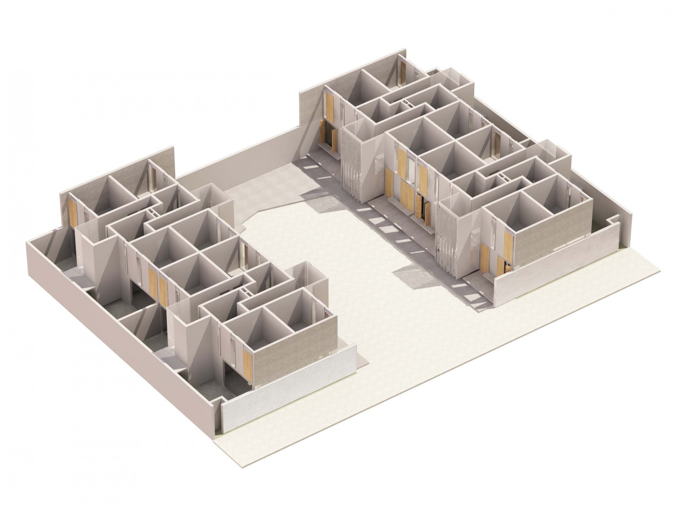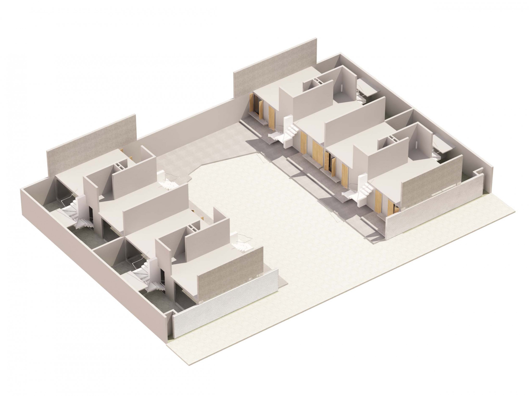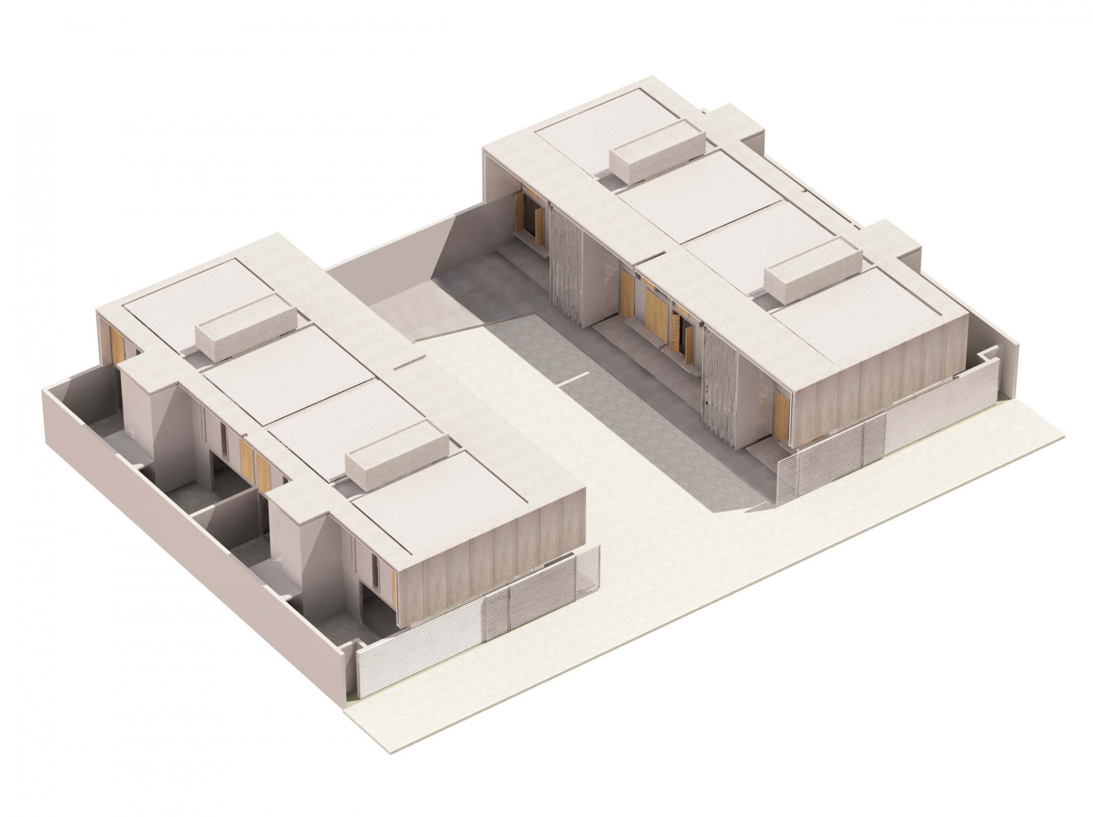 Voltadas para o pátio coletivo, as unidades contemplam, desde suas varandas, um espaço que trás a vizinhança para o seu interior, transpondo os limites que poderiam caracterizar este conjunto residencial como propriedades fragmentadas. A área central se destina ao potencial de sua flexibilidade como espaço para, atividades comuns, reuniões, automóveis, etc.