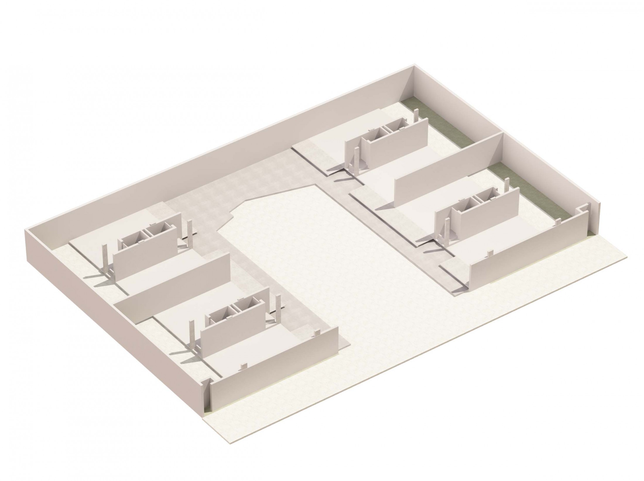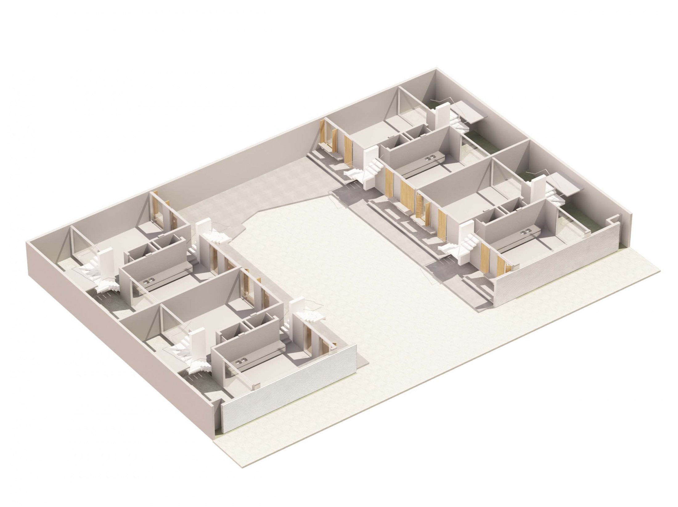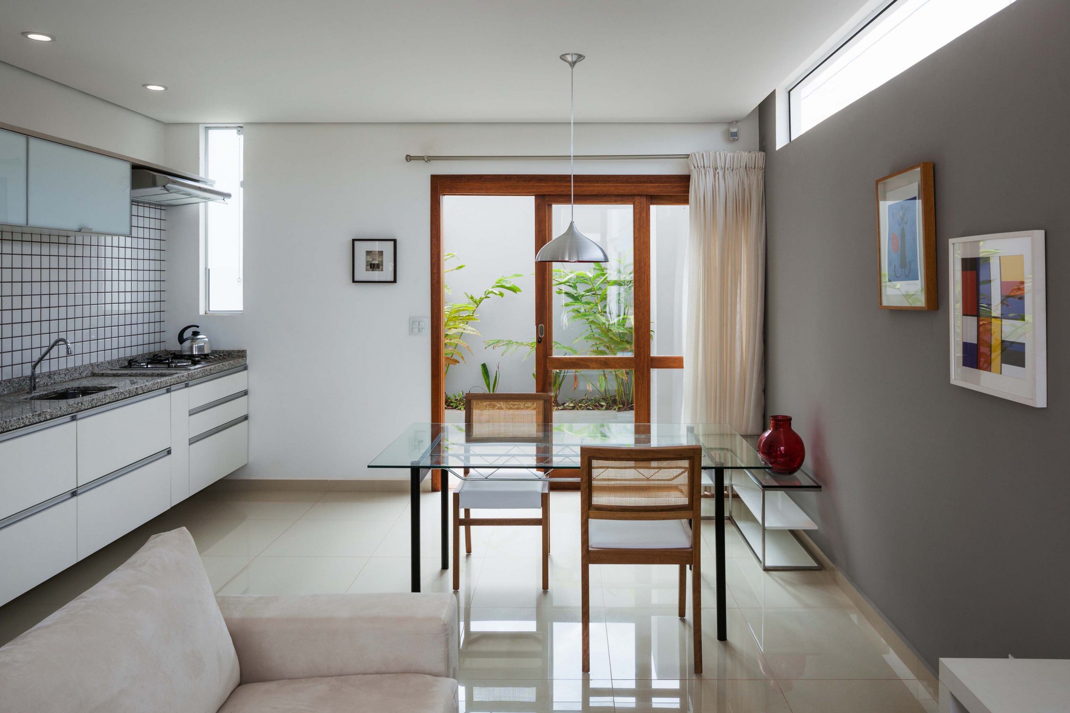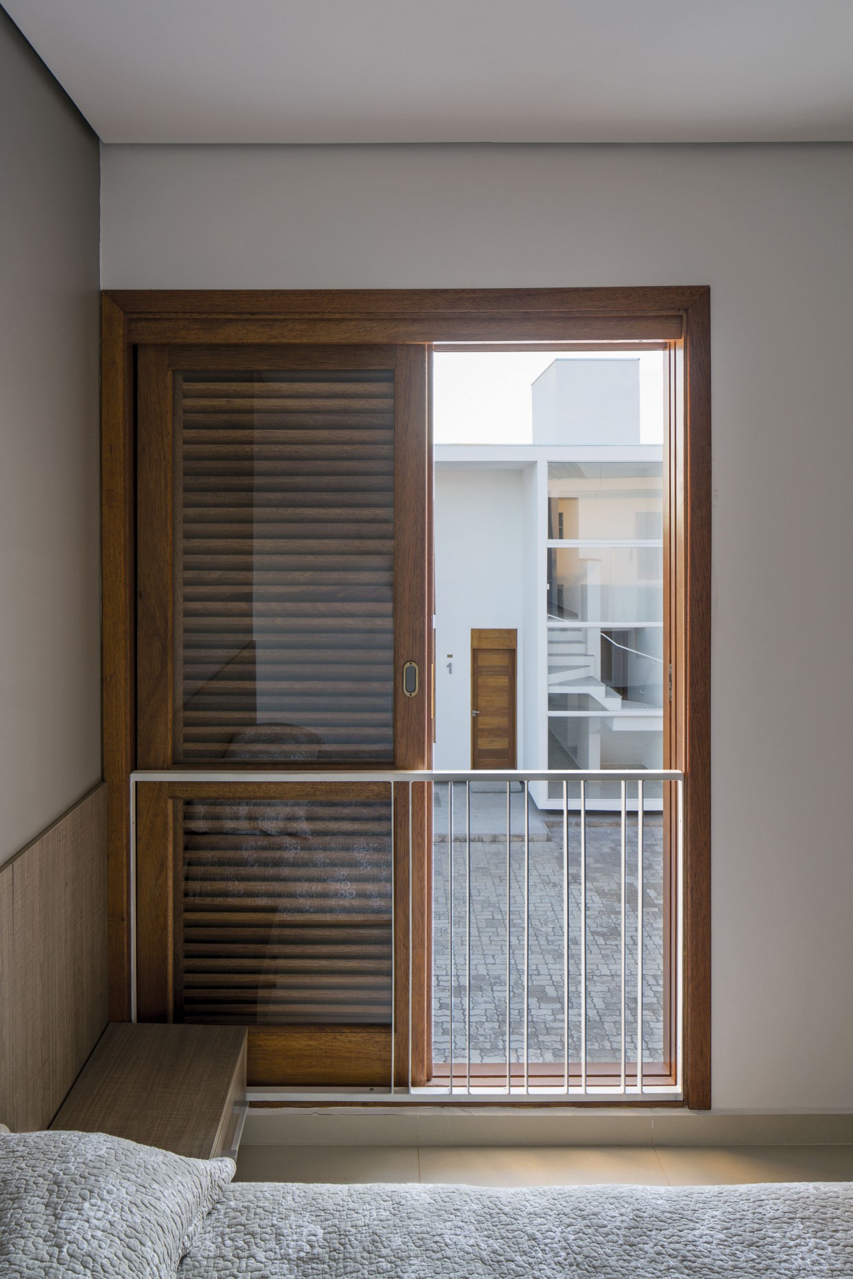 Voltadas para o pátio coletivo, as unidades contemplam, desde suas varandas, um espaço que trás a vizinhança para o seu interior, transpondo os limites que poderiam caracterizar este conjunto residencial como propriedades fragmentadas. A área central se destina ao potencial de sua flexibilidade como espaço para, atividades comuns, reuniões, automóveis, etc.