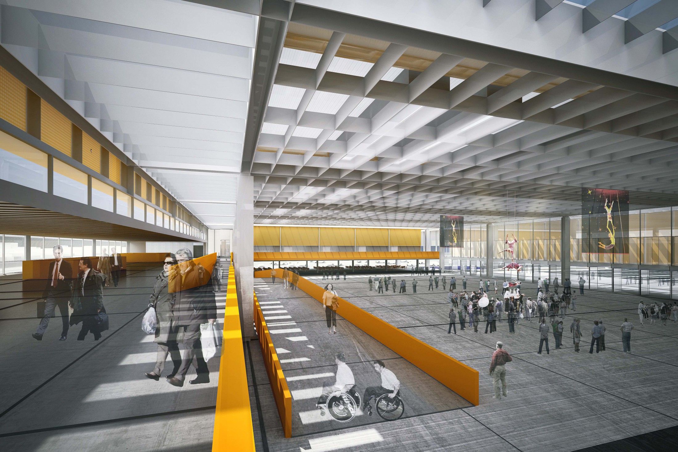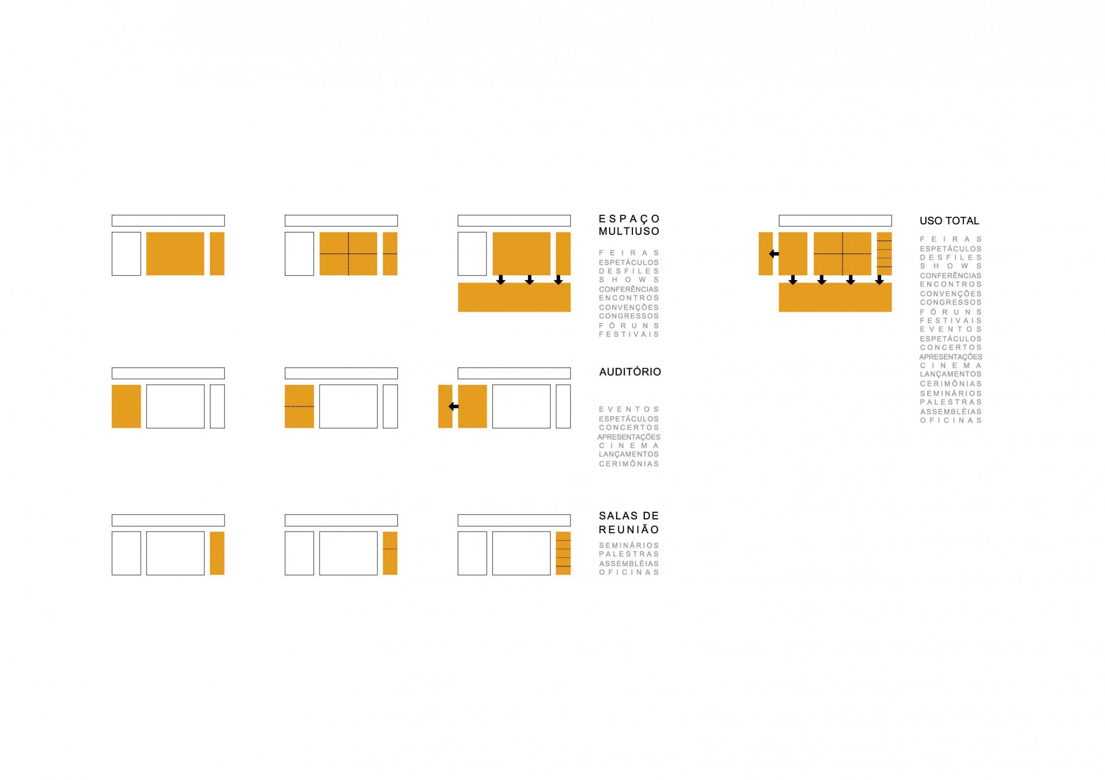 Os espaços para a cultura, eventos e exposições serão dotados de total flexibilidade, adaptabilidade e controle, possibilitando a sua autonomia segundo a demanda de cada tipo de situação abrigada. Através do controle de iluminação, ventilação, ar-condicionado e divisórias móveis, o CCEE poderá fazer com que todos os seus espaços assumam diferentes tamanhos e configurações, separados ou unidos. A ligação com as áreas técnicas, armazenamento e doca se dará diretamente no nível principal. A versatilidade dos espaços também é possível pelo próprio conceito estrutural do edifício que apresenta um vão livre de grandes proporções. Quando necessário, a grelha estrutural poderá servir de ponto de apoio e suporte para peças de pequeno ou grande porte. O circuito de visitação reflete o conceito de flexibilidade adotado, definindo uma variedade de fluxos que buscam atender toda a versatilidade do prédio. Operações de entradas e saídas poderão ser feitas por ambos os níveis, sendo trabalhados em função da independência do número de pessoas ou das atividades acolhidas. O projeto permite acessibilidade total com relação ao público especial. A liberdade dos diversos deslocamentos possíveis vislumbra espacialidades e sensações variadas, envolvida pela luminosidade controlada e dinâmica de suas fachadas e cobertura. São propostos espaços que sejam também fisicamente diversificados, permitindo eventos interiores e exteriores de feiras, congressos, exposições, seminários, shows etc.