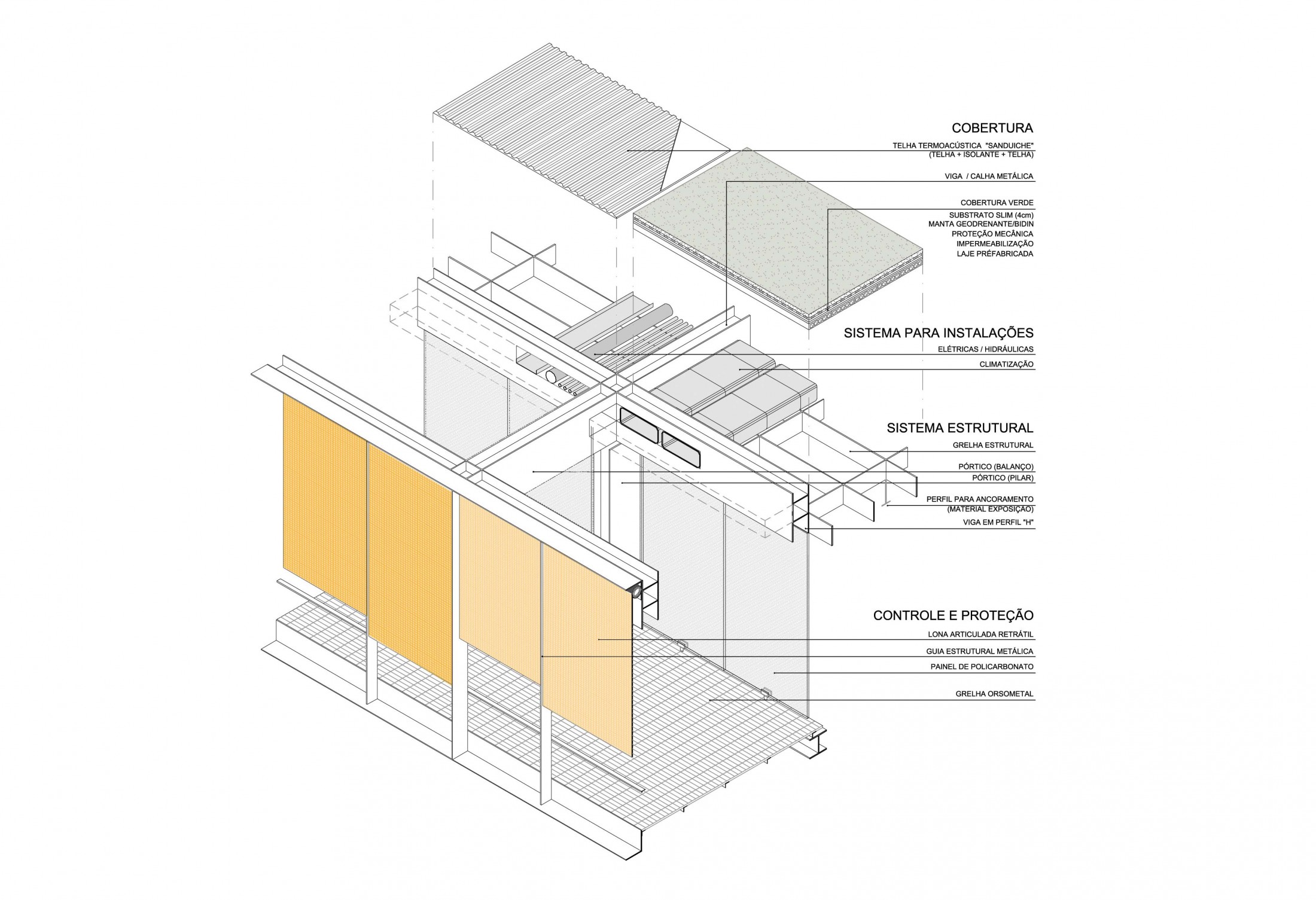 As instalações hidráulicas e elétricas estão configuradas para fácil manutenção e acesso, fazendo uso do sistema estrutural proposto. Os reservatórios de água situados próximos e sobre o volume principal atenderão a demanda do edifício tanto para água servida como para sistemas de incêndio. As instalações elétricas visam reduzir ao máximo o consumo de energia considerando a possibilidade do uso de luz natural. Pontos de luz, energia e água solicitados para os espaços de exposição e eventos estão previstos para serem implantadas nas áreas de forro e piso atendendo com liberdade total de modulação e adaptação, para pontos. O uso de climatização no edifício torna-se complementar considerando que a proposta arquitetônica é capaz de manter os interiores em condições adequadas de conforto térmico por boa parte do ano. No entanto, para atender às condições climáticas extremas e à especificidade dos espaços o edifício prevê instalações de ar-condicionado, baseado na economia, controle e flexibilidade. Através das grandes vigas longitudinais, o sistema funciona como ramificação atendendo a cada espaço independentemente.