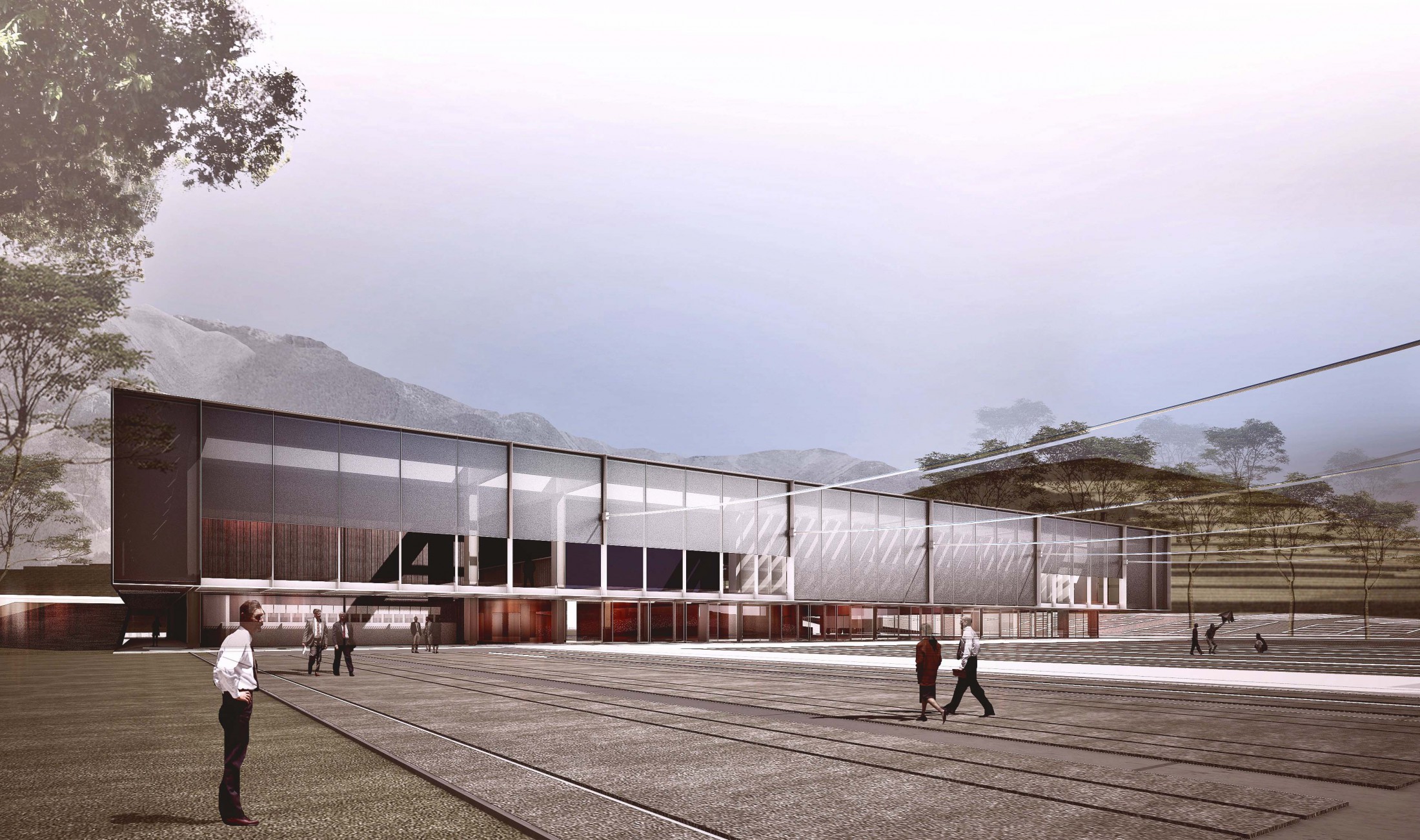 A estratégia de implantação busca fortalecer a presença do CCEE na paisagem a qual se soma, estimulando o desenvolvimento ao seu redor. O projeto se insere no terreno através de um volume horizontal que se acomoda na topografia potencializando a apreensão do visual panorâmico montanhoso e verde em toda sua extensão e também sendo visível como marco referencial na rodovia. O CCEE está contido numa única faixa onde o programa se distribui em espaços e condições distintos. A chegada dá-se através de uma praça monumental que leva o público à área coberta de acolhimento capaz de abrigar uma grande quantidade de usuários e distribuir os públicos em dois níveis distintos. O agenciamento dos espaços se faz por acessos e controles que delimitam áreas de atividades que podem ser abertas autonomamente: pelo nível superior se acessam as Salas de Reuniões e pelo inferior Espaço Multiuso e Auditório. Priorizando sempre uma relação contínua e inseparável entre exterior e interior, o edifício se define como um intermediário entre os programas nele abrigados e as áreas externas propostas preparadas para eventos de grande escala, além de vislumbrar a paisagem. As expansões previstas poderão se localizar na porção norte do terreno, não interferindo na volumetria principal e possíveis de serem acessadas separadamente.