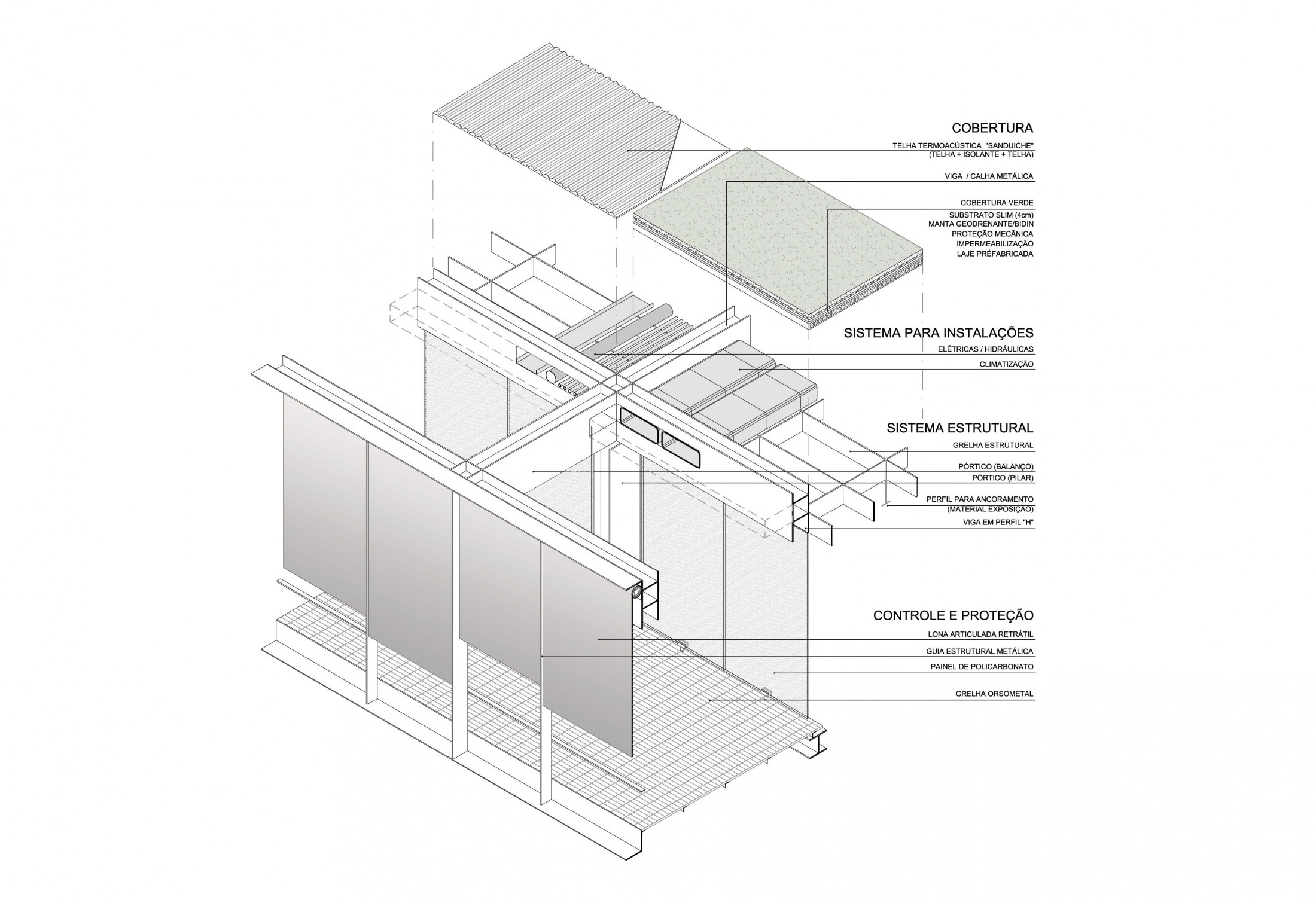 As instalações hidráulicas e elétricas estão configuradas para fácil manutenção e acesso, fazendo uso do sistema estrutural proposto. Os reservatórios de água situados próximos e sobre o volume principal atenderão a demanda do edifício tanto para água servida como para sistemas de incêndio. As instalações elétricas visam reduzir ao máximo o consumo de energia considerando a possibilidade de uso de luz natural. Ambas estão previstas para serem implantadas nas áreas de forro e piso atendendo com liberdade total de modulação e adaptação, seja para iluminação, pontos de energias ou água solicitados para os espaços de exposição e eventos. O uso de climatização no edifício torna-se complementar considerando que a proposta arquitetônica é capaz de manter os interiores em condições adequadas de conforto térmico por boa parte do ano. No entanto, para atender às condições climáticas extremas e à especificidade dos espaços o edifício prevê instalações de ar-condicionado, baseado na economia, controle e flexibilidade. Através das grandes vigas longitudinais o sistema funciona como ramificação atendendo a cada espaço independentemente.