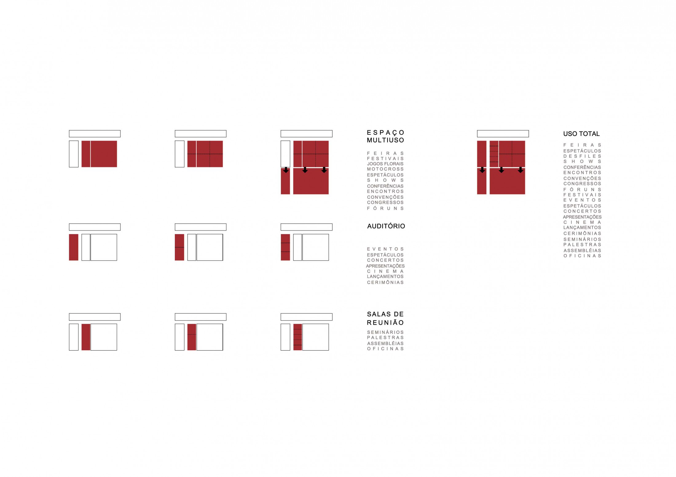 Os espaços para a cultura, eventos e exposições serão dotados de total flexibilidade, adaptabilidade e controle, possibilitando a sua autonomia segundo a demanda de cada tipo de situação abrigada. Através do controle de iluminação, ventilação, ar-condicionado e divisórias móveis, o CCEE poderá fazer com que todos os seus espaços assumam diferentes tamanhos e configurações, separados ou unidos. A ligação com as áreas técnicas, armazenamento e doca se dará diretamente no nível principal. A versatilidade dos espaços também é possível pelo próprio conceito estrutural do edifício que apresenta um vão livre de grandes proporções. Quando necessário, a grelha estrutural poderá servir de ponto de apoio e suporte para peças de pequeno ou grande porte. O circuito de visitação reflete o conceito de flexibilidade adotado definindo uma variedade de fluxos que buscam atender toda a versatilidade do prédio. Operações de entradas e saídas poderão ser feitos por ambos os níveis, sendo trabalhados em função da independência das atividades ou do número de pessoas acolhido. O projeto permite a acessibilidade total com relação ao público especial. A liberdade dos diversos deslocamentos possíveis vislumbra espacialidades e sensações variadas, envolvida pela luminosidade controlada e dinâmica de suas fachadas e cobertura. São propostos espaços que também fisicamente sejam diversificados permitindo os eventos interiores e exteriores de feiras, congressos, exposições, seminários, shows, etc., e inclusive esportivos.