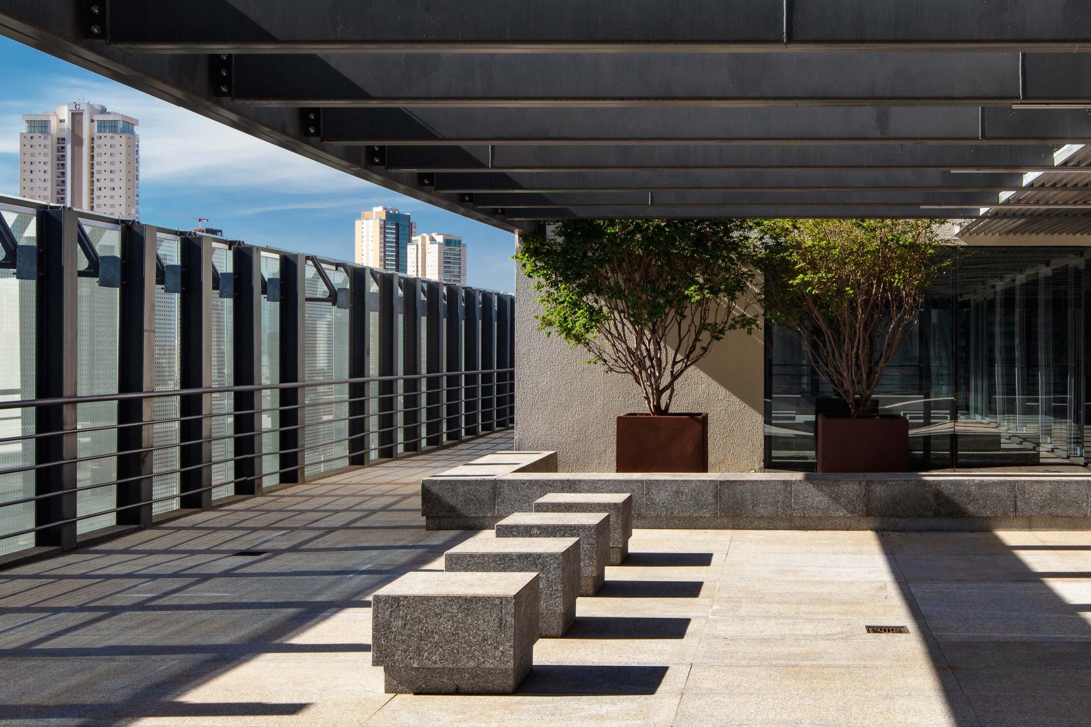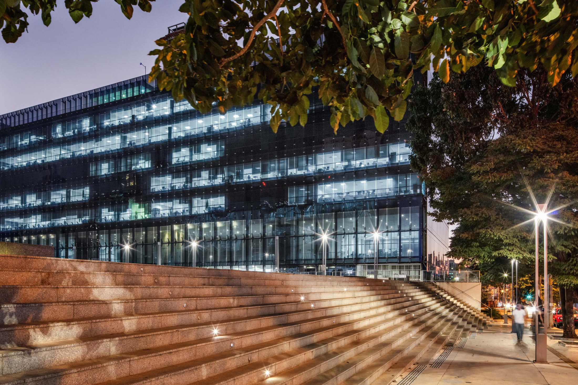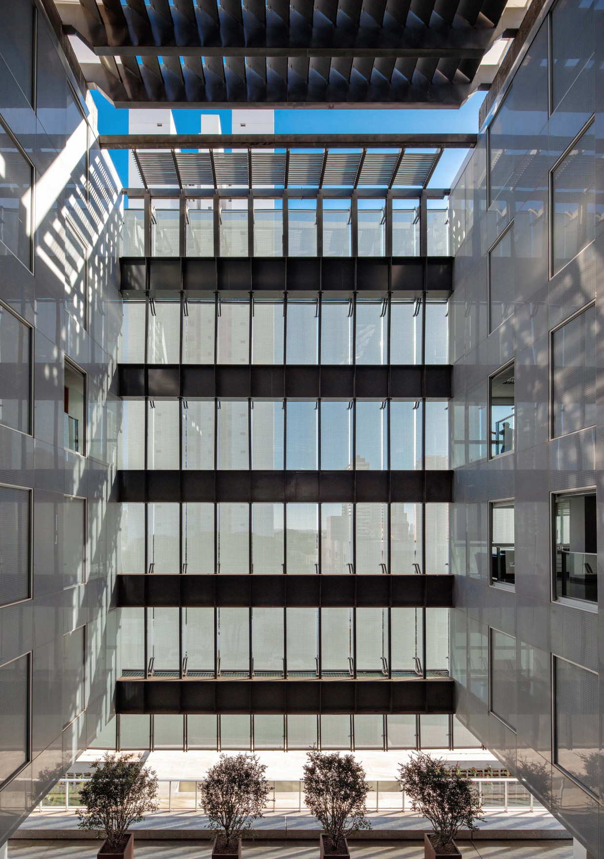 A proposta leva em consideração todos os aspectos referentes aos temas mencionados, desde a acessibilidade universal de todo o complexo até a economia de recursos. O projeto privilegia claramente a qualidade do estar dos espaços de trabalho, solucionando de modo bastante único, comparado a outros projetos de programa similar, problemas de iluminação e ventilação natural. O pé-direito livre de 2.70m, somado com praticamente todas as salas dispostas diretamente nas fachadas, acarreta numa redução significativa da utilização de energia devido ao alto aproveitamento da luz natural. A versátil utilização do recurso da pele de vidro faz com que o edifício mantenha sua força e sobriedade formal, aparentemente igual em todas as fachadas, porém internamente solucionado de modo distinto em cada caso. Enquanto nas fachadas sul e nas voltadas ao pátio interno, utiliza-se uma única pele; nas fachadas norte somam-se, internamente, uma segunda pele criando uma eficiente proteção contra radiação solar, além do uso de brises interiores de desenho inovador, também colaborando para a eficiência energética e imagem da arquitetura. As fachadas leste e oeste, de dimensões reduzidas compõem-se das duas soluções. Sendo assim, minimiza-se de modo significativo o uso do ar condicionado. A reutilização de águas servidas é feita através de espelhos d’água na cobertura dos edifícios e áreas impermeabilizadas, sendo providas de tecnologia de tratamento e reserva para sua devida reutilização. O projeto contempla ainda a possibilidade de gênese de recursos de energia renovável, seja através da cobertura ou até mesmo das próprias fachadas.