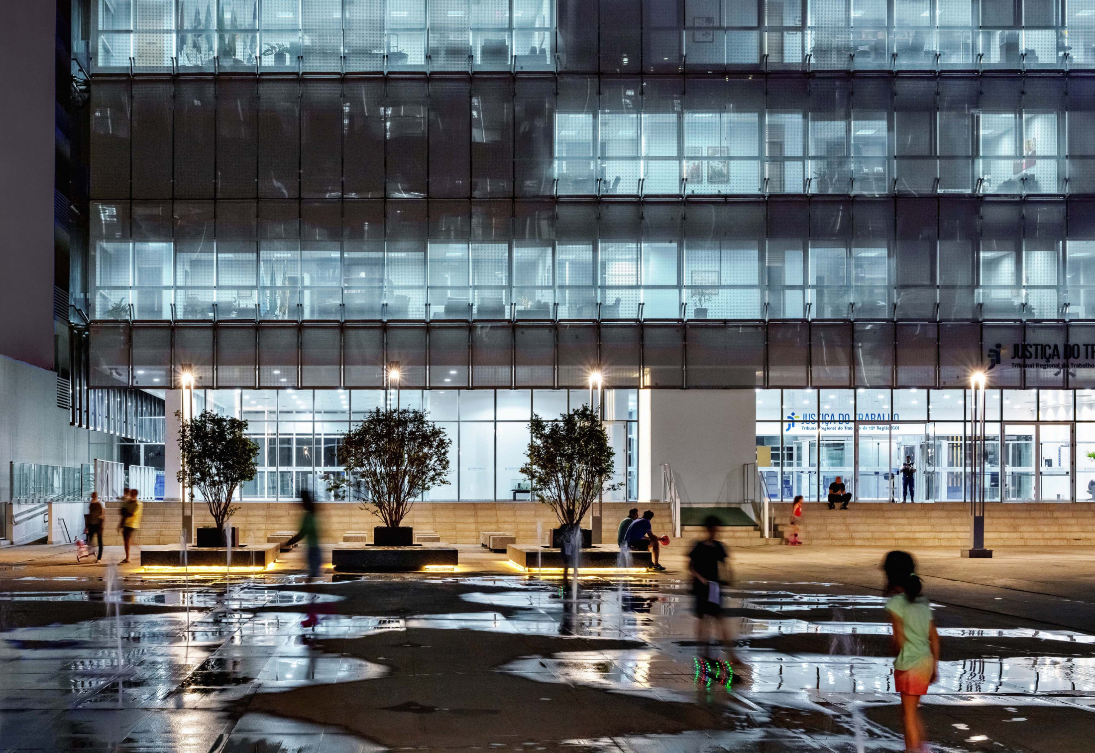 Ordenadora de todo o complexo, e de fácil acesso, sua implantação se acomoda da maneira mais adequada, tirando partido do desnível existente para articular-se com o entorno e também comunicar todas as edificações onde foram distribuídas as etapas do programa, conforme edital. Criada em dois níveis, é na cota +791.50 que se estabelece o principal acesso ao Complexo do TRT conectando também a Avenida T-1 à Rua T-29. Nessa mesma cota se encontra o acesso principal ao edifício da Etapa 1, que além deste, conta também com um acesso secundário pela rua T-51. Já o segundo nível da praça, estabelecido na cota +793.00 comunica a praça à Rua Orestes Ribeiro e também os acessos aos edifícios da Etapa 2, 3 e 4.