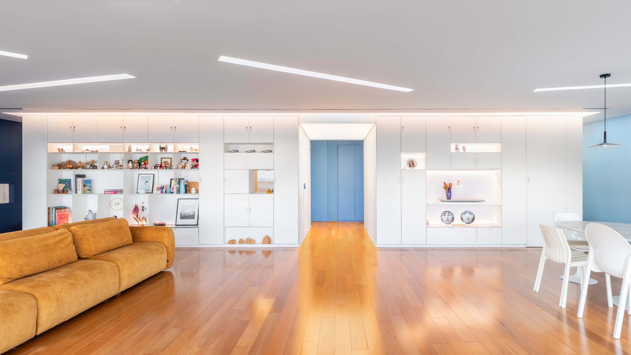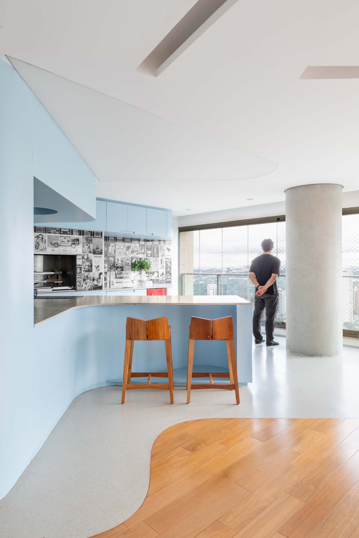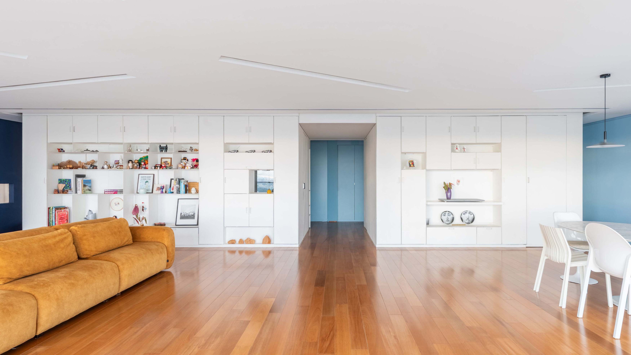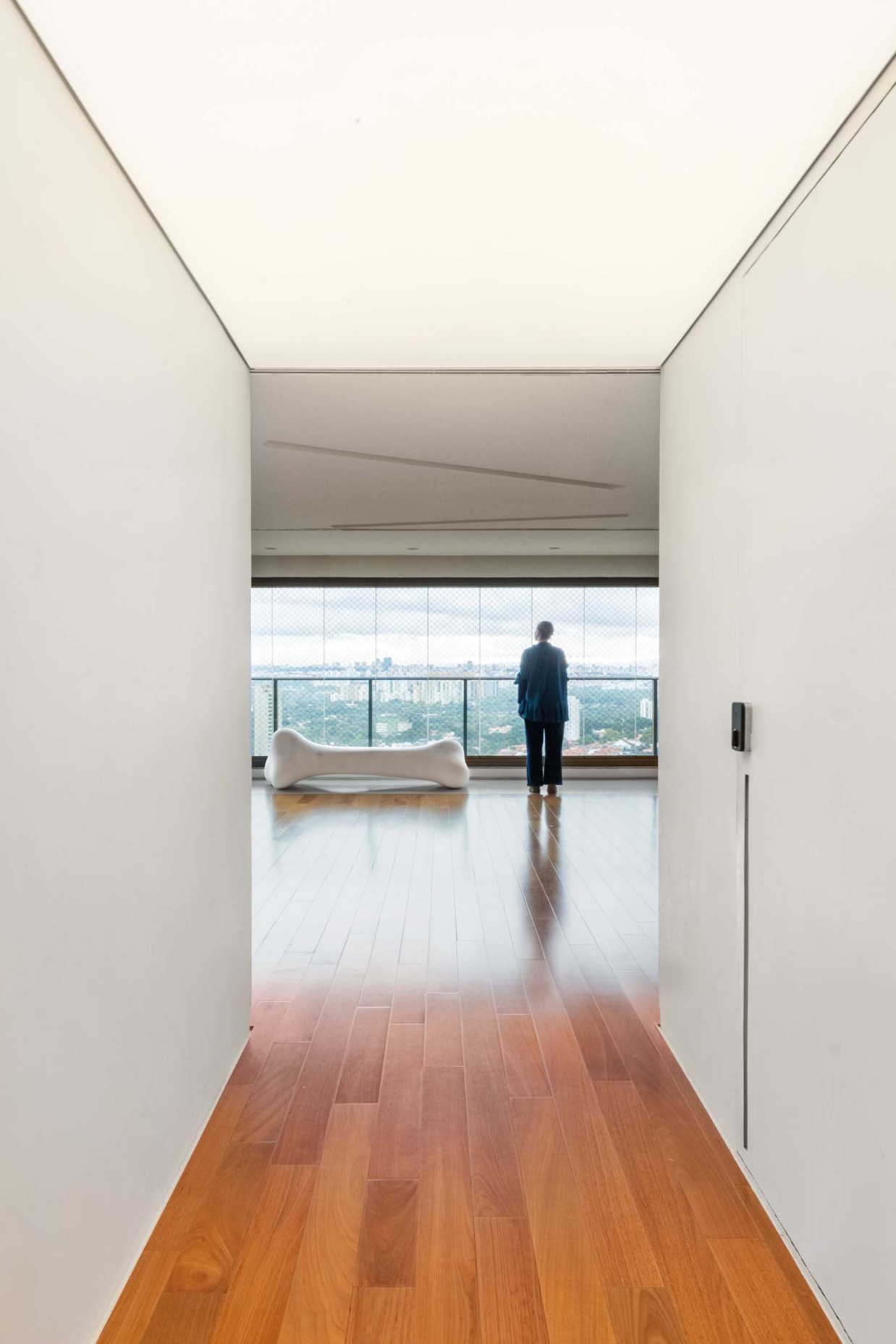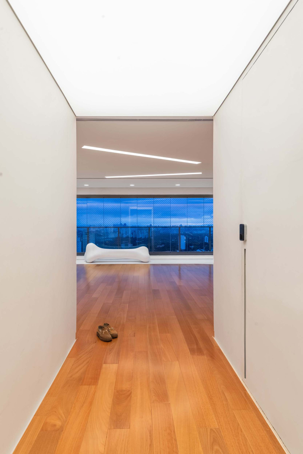 For all those who inhabit increasingly denser cities, where land is rare and their relations with the landscape are scarce, there is not a more common way of living than that of superimposed spaces isolated from an external dimension of the world. It is this experience that we look to recover here. Considering the unity’s generous proportions, the large opening to a privilege view and the habits of the family that will be living there, we started the project by reducing its divisions to the minimum. Understanding the apartment as a brute stone, a central solid is defined in its interior housing the access tunnel and significant part of its services. Around it, three other solids – for the couple, the daughters and the kitchen – are arranged in such a way that the most important space rises precisely from the void between them: free places for different interactions and movements, spaces inside spaces in a dialogue of “intimate solids” and “collective voids”. This collective place is pretended to attend the intense and generous social life of the family, guided by hospitality, music and, above all, cooking. Therefore, it’s from the kitchen’s solid – fluid form unique – that breaks out the sinuous counter around which a vivid and everyday appropriation is imagined, extending along the entire facade as a transitional floor between inside and out. Architecture and design come together in the versatile metal and wood furniture, in the subtle graduation of colors and in the constant diffused light. A belvedere house above the city landscape waiting everyday for the sunset.