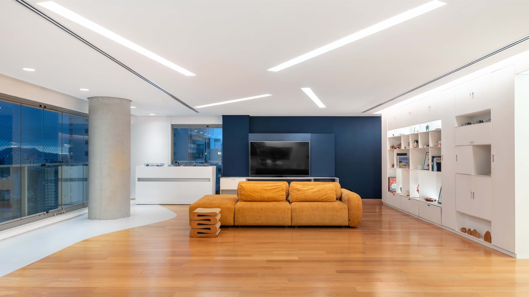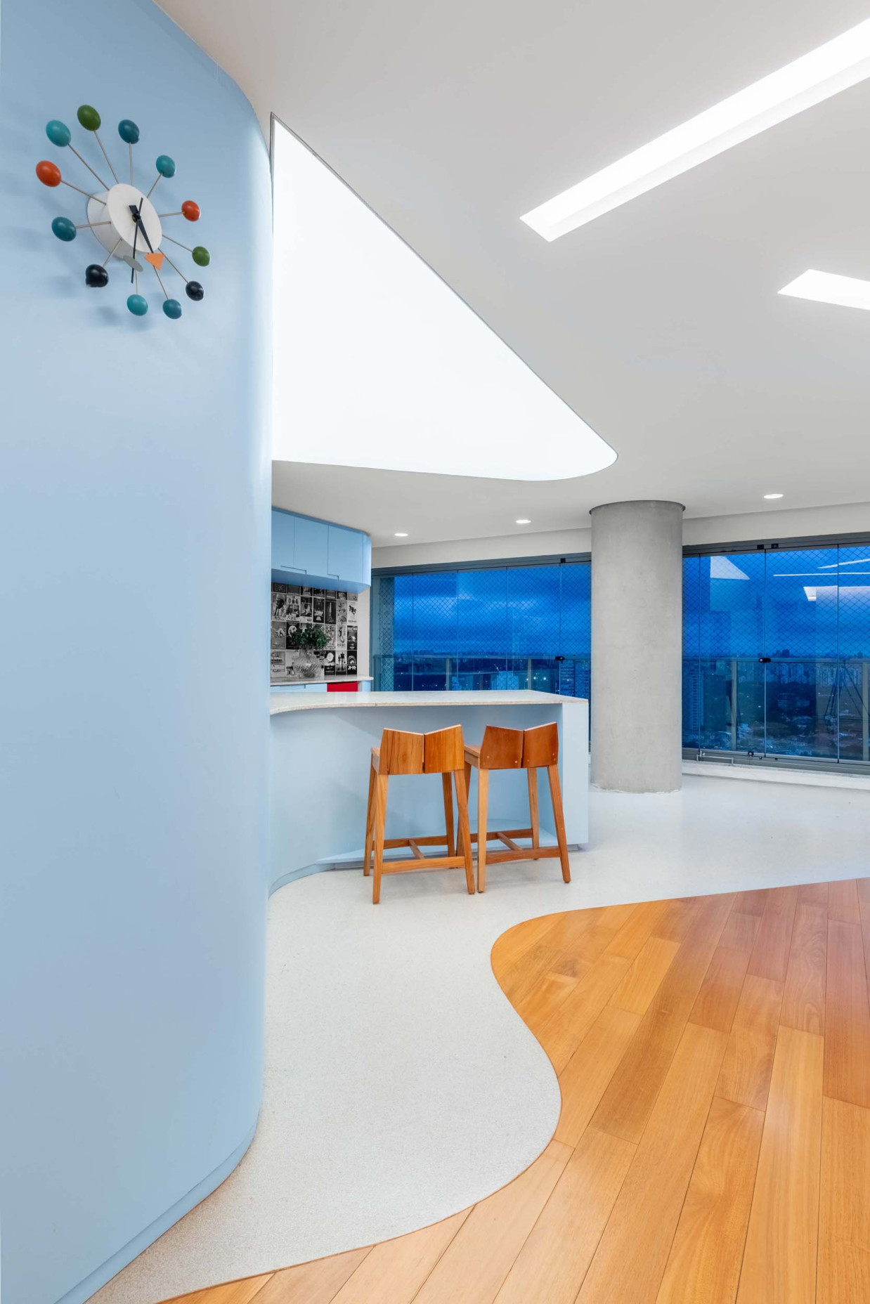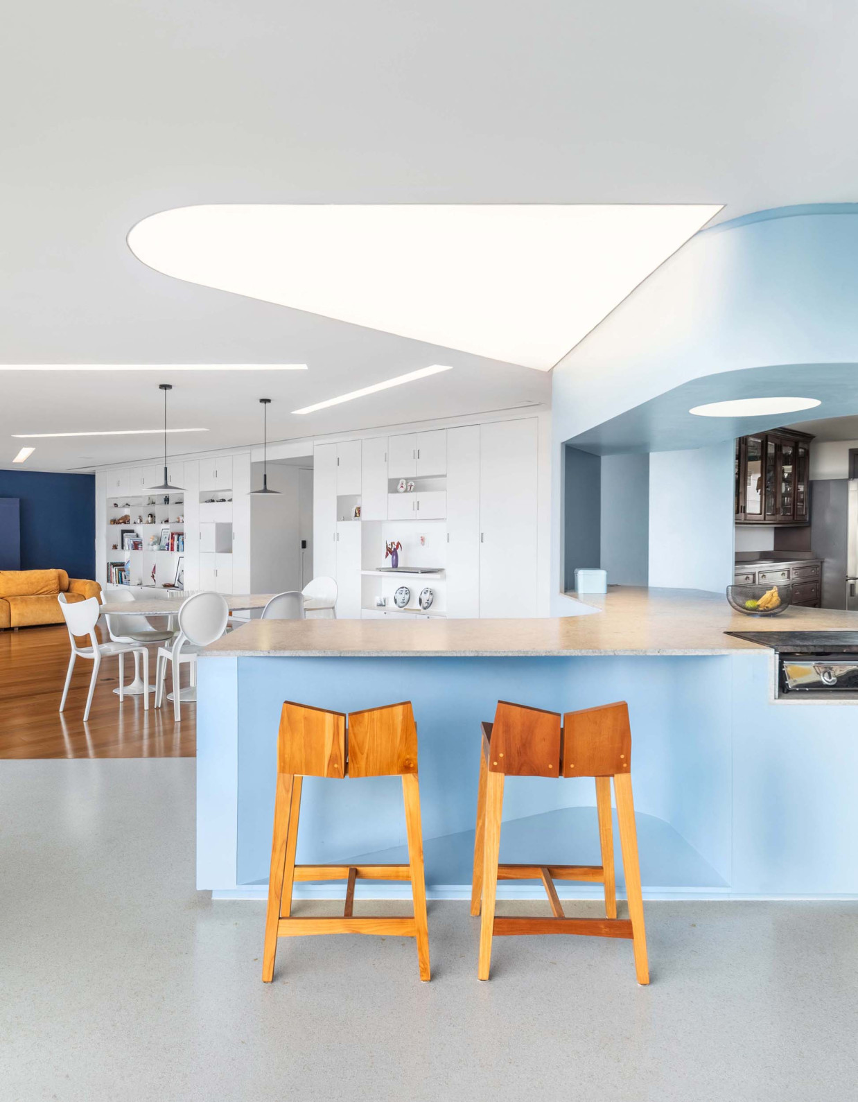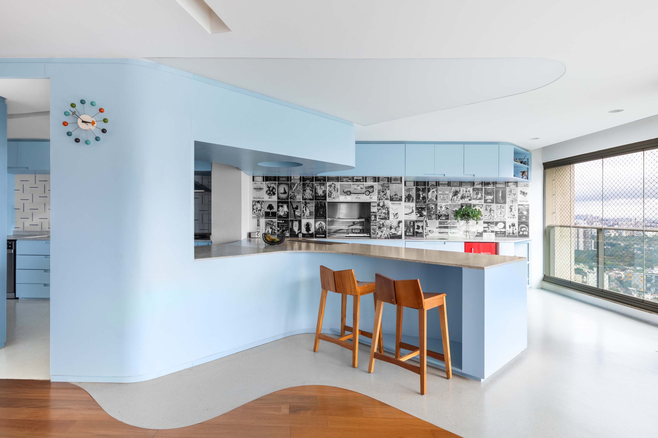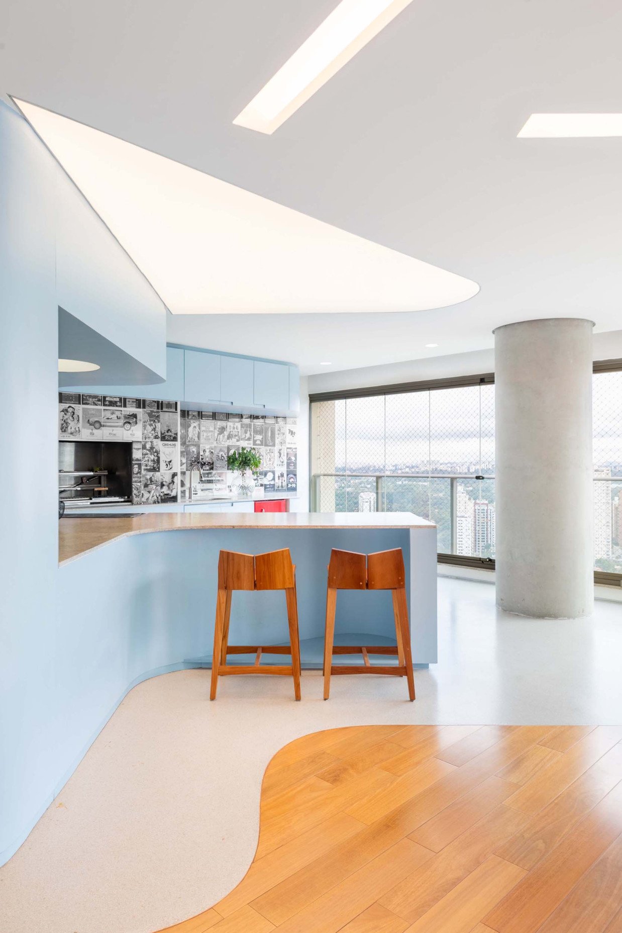 For all those who inhabit increasingly denser cities, where land is rare and their relations with the landscape are scarce, there is not a more common way of living than that of superimposed spaces isolated from an external dimension of the world. It is this experience that we look to recover here. Considering the unity’s generous proportions, the large opening to a privilege view and the habits of the family that will be living there, we started the project by reducing its divisions to the minimum. Understanding the apartment as a brute stone, a central solid is defined in its interior housing the access tunnel and significant part of its services. Around it, three other solids – for the couple, the daughters and the kitchen – are arranged in such a way that the most important space rises precisely from the void between them: free places for different interactions and movements, spaces inside spaces in a dialogue of “intimate solids” and “collective voids”. This collective place is pretended to attend the intense and generous social life of the family, guided by hospitality, music and, above all, cooking. Therefore, it’s from the kitchen’s solid – fluid form unique – that breaks out the sinuous counter around which a vivid and everyday appropriation is imagined, extending along the entire facade as a transitional floor between inside and out. Architecture and design come together in the versatile metal and wood furniture, in the subtle graduation of colors and in the constant diffused light. A belvedere house above the city landscape waiting everyday for the sunset.