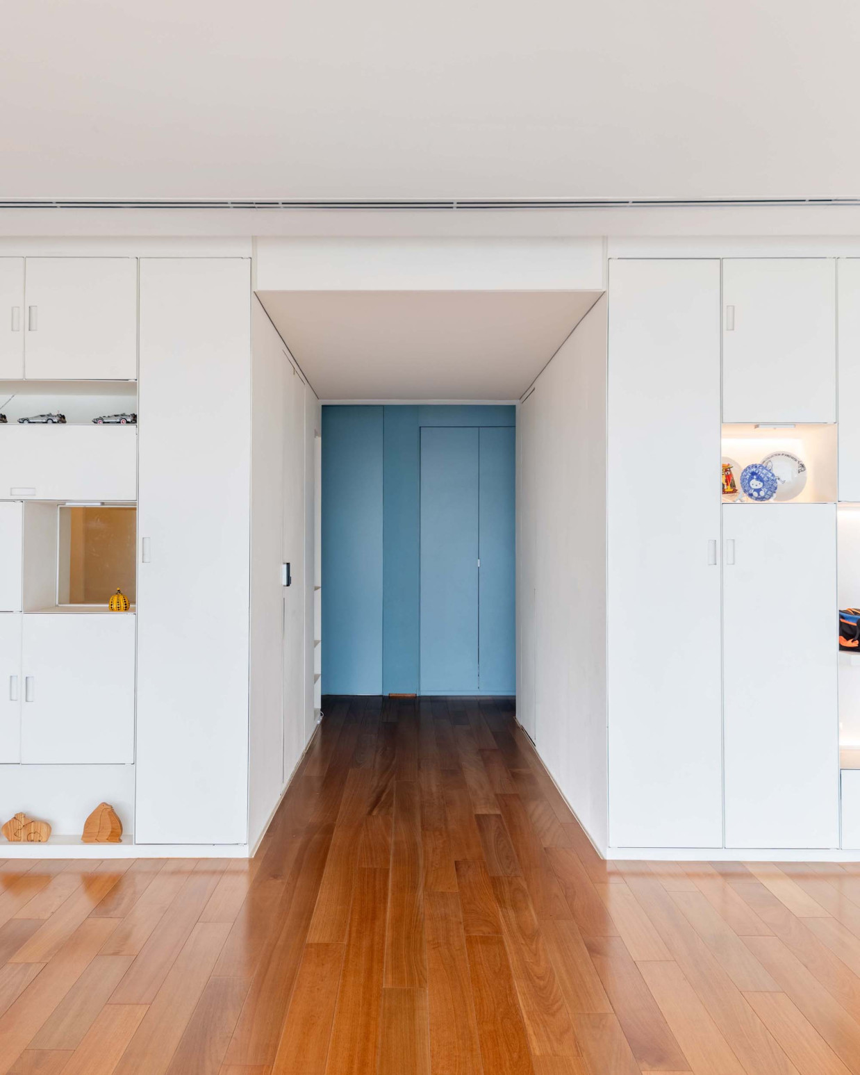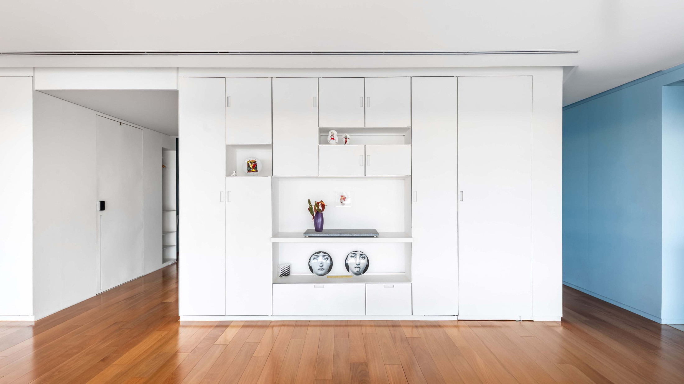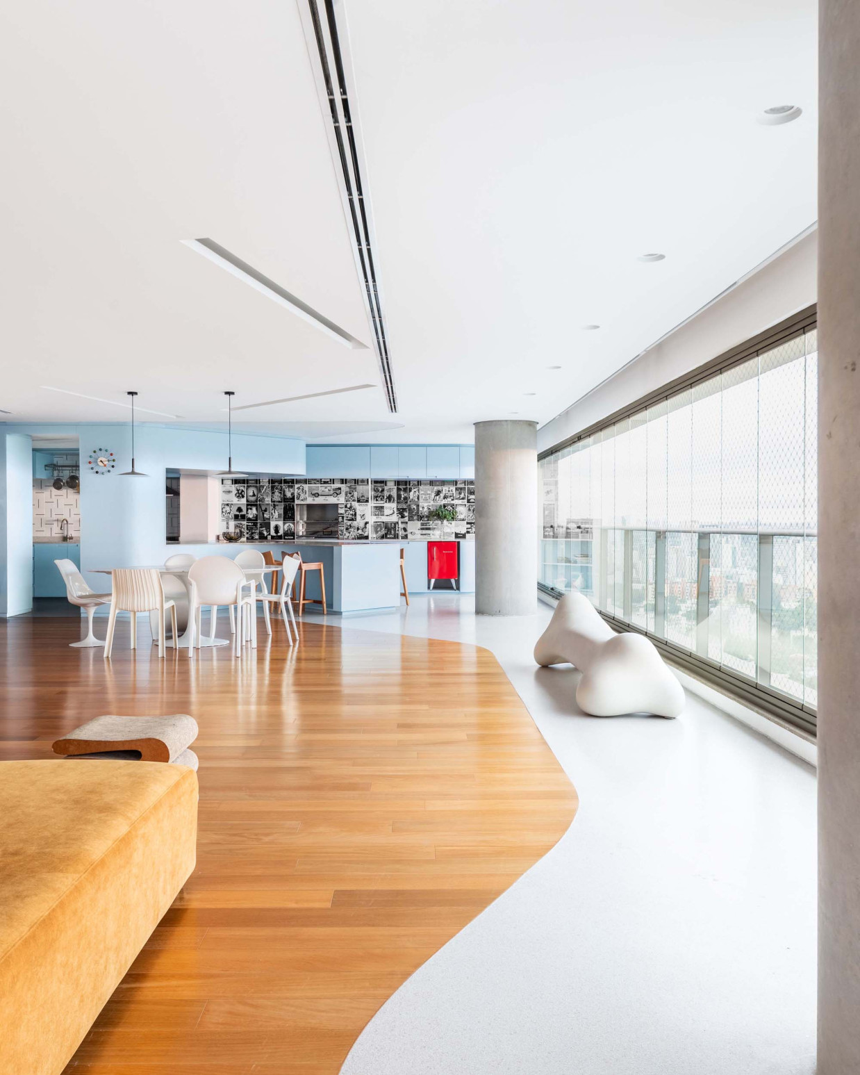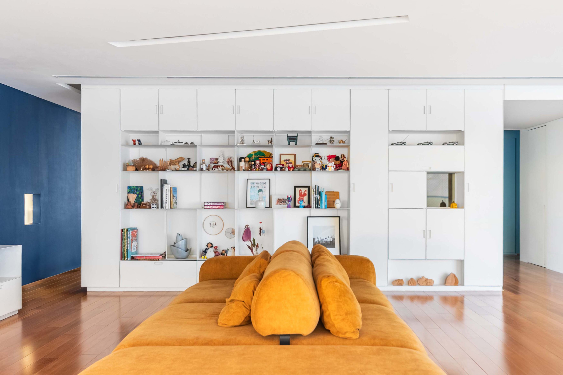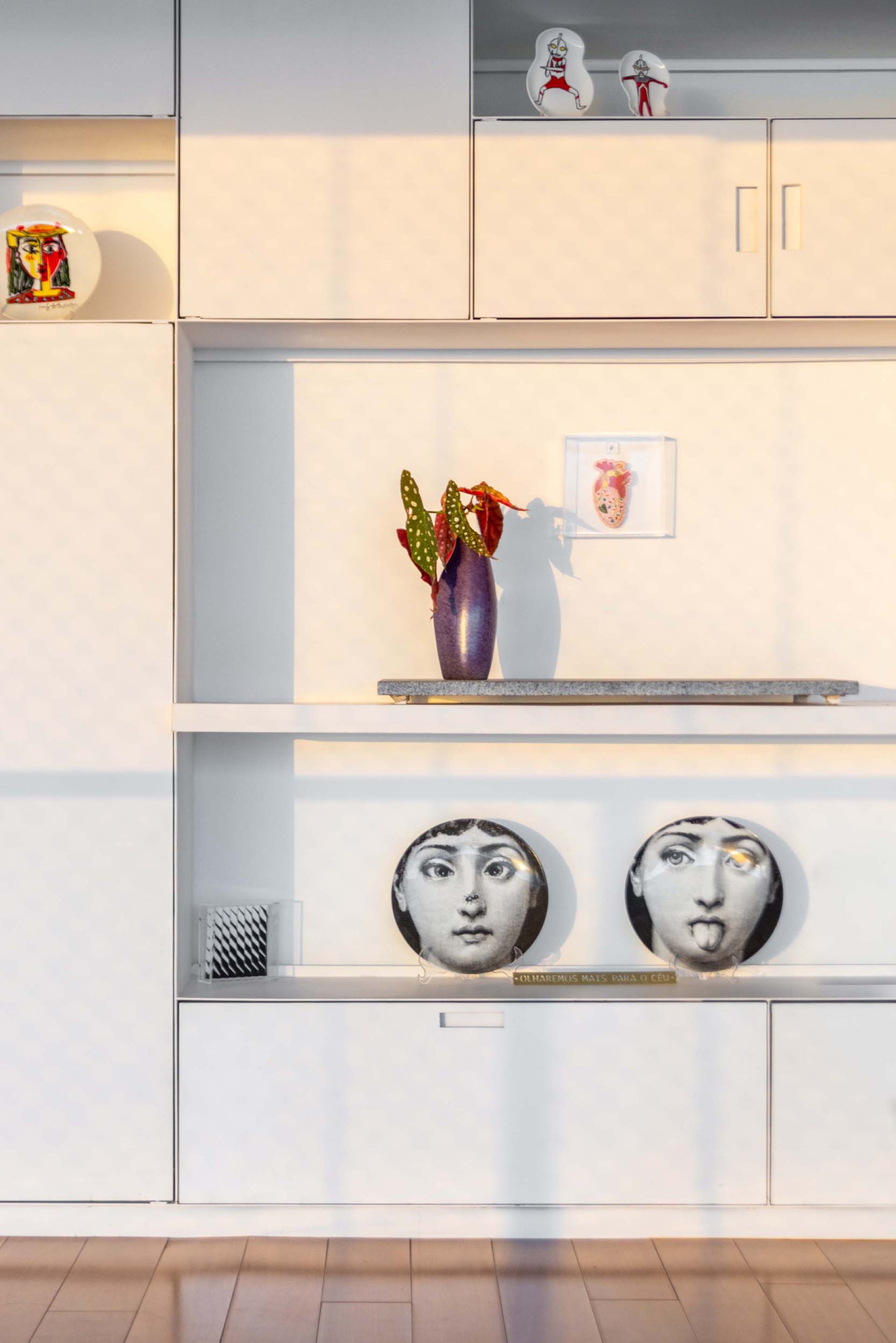For all those who inhabit increasingly denser cities, where land is rare and their relations with the landscape are scarce, there is not a more common way of living than that of superimposed spaces isolated from an external dimension of the world. It is this experience that we look to recover here. Considering the unity’s generous proportions, the large opening to a privilege view and the habits of the family that will be living there, we started the project by reducing its divisions to the minimum. Understanding the apartment as a brute stone, a central solid is defined in its interior housing the access tunnel and significant part of its services. Around it, three other solids – for the couple, the daughters and the kitchen – are arranged in such a way that the most important space rises precisely from the void between them: free places for different interactions and movements, spaces inside spaces in a dialogue of “intimate solids” and “collective voids”. This collective place is pretended to attend the intense and generous social life of the family, guided by hospitality, music and, above all, cooking. Therefore, it’s from the kitchen’s solid – fluid form unique – that breaks out the sinuous counter around which a vivid and everyday appropriation is imagined, extending along the entire facade as a transitional floor between inside and out. Architecture and design come together in the versatile metal and wood furniture, in the subtle graduation of colors and in the constant diffused light. A belvedere house above the city landscape waiting everyday for the sunset.