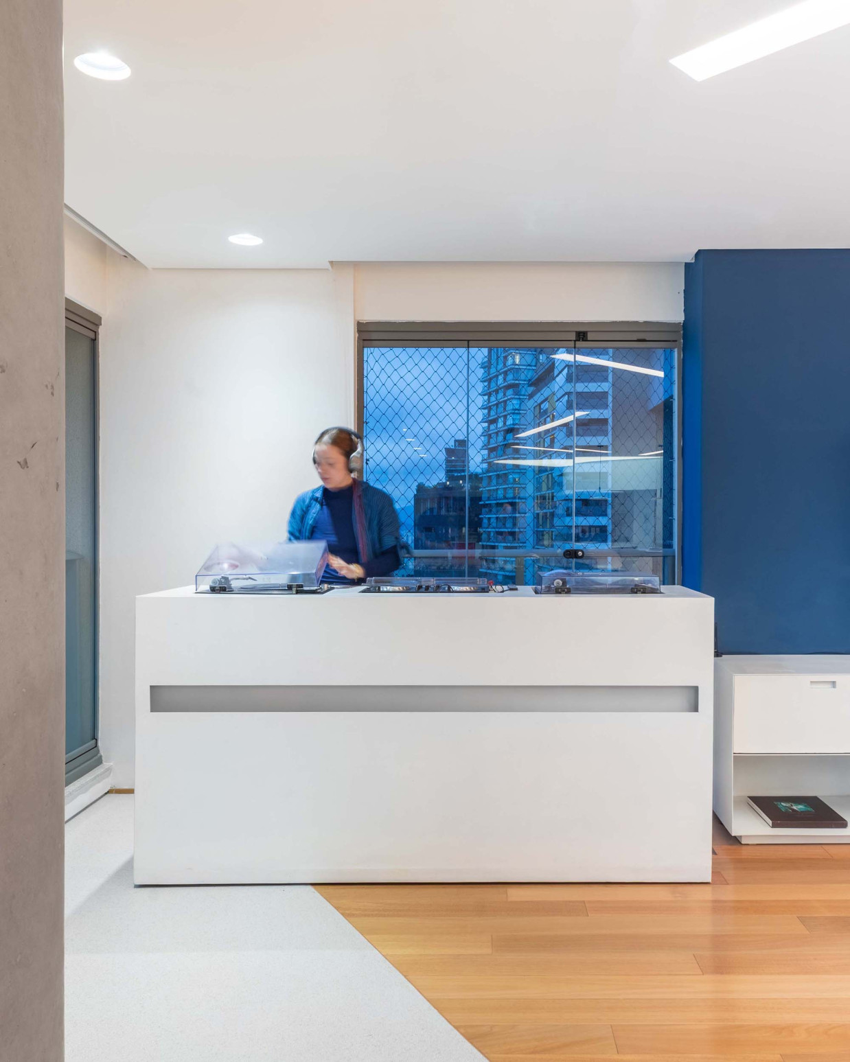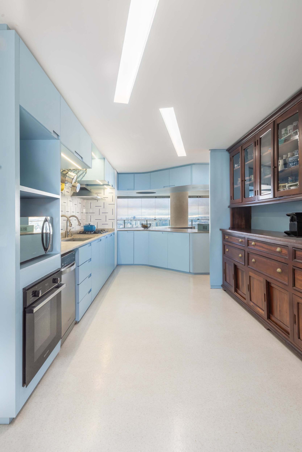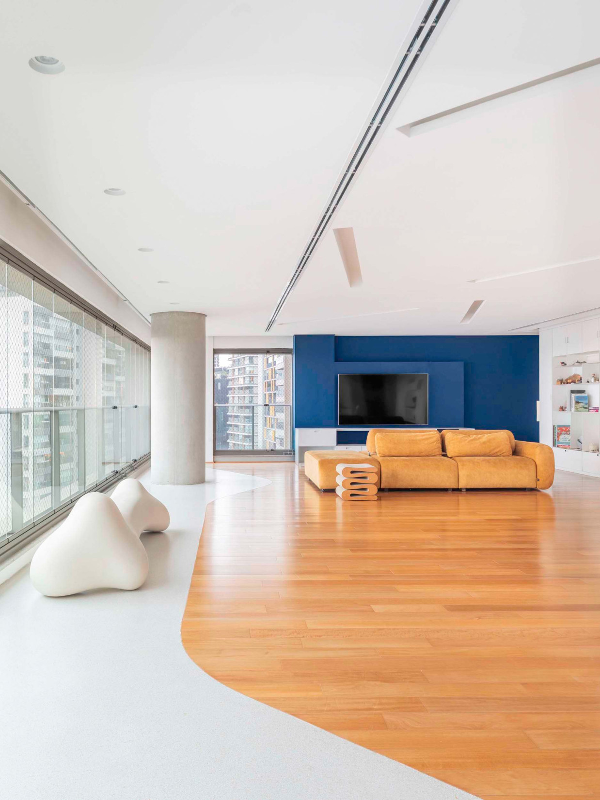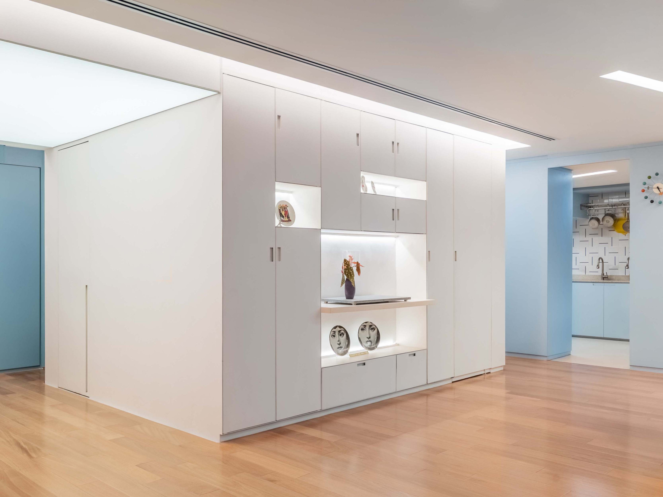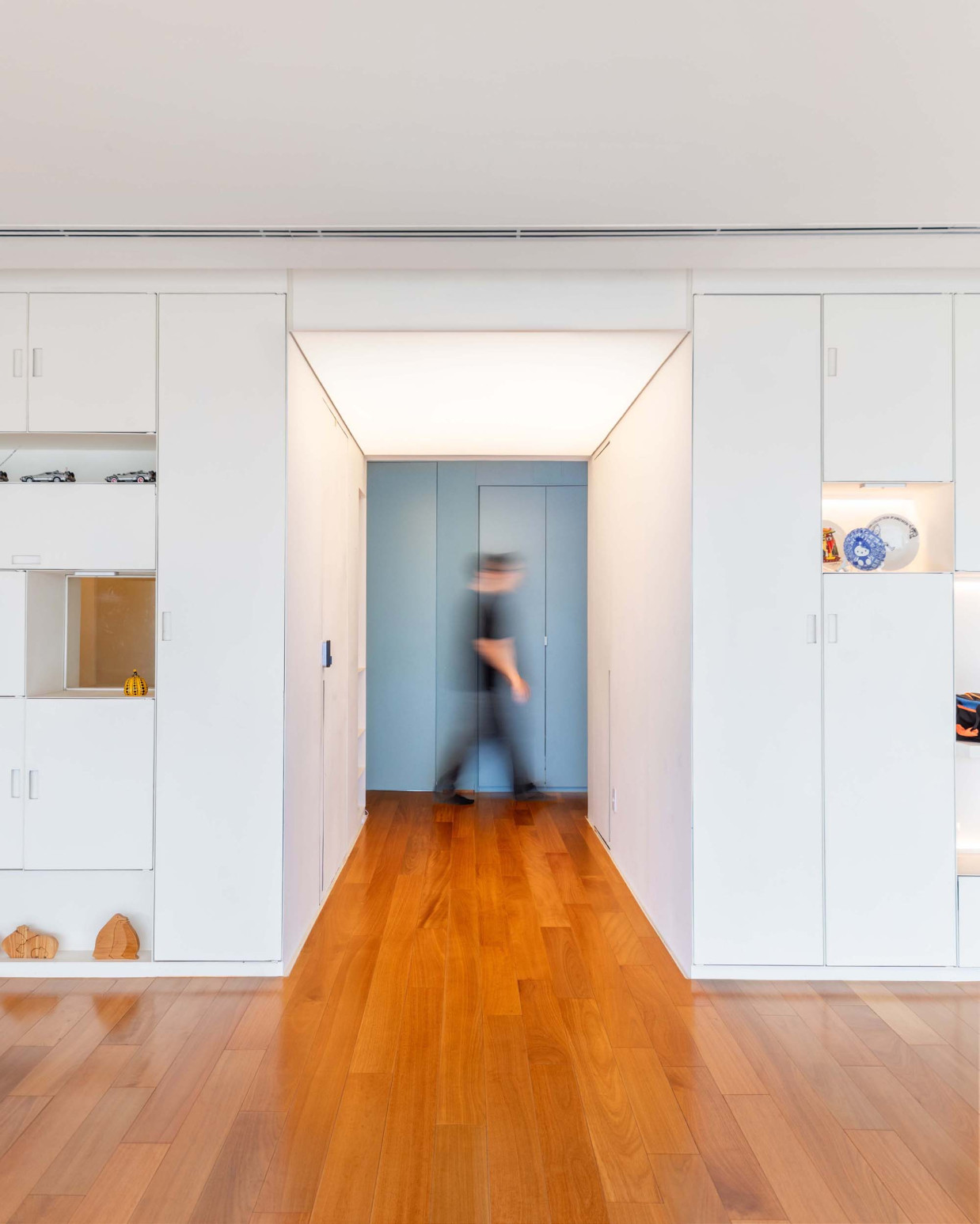 For all those who inhabit increasingly denser cities, where land is rare and their relations with the landscape are scarce, there is not a more common way of living than that of superimposed spaces isolated from an external dimension of the world. It is this experience that we look to recover here. Considering the unity’s generous proportions, the large opening to a privilege view and the habits of the family that will be living there, we started the project by reducing its divisions to the minimum. Understanding the apartment as a brute stone, a central solid is defined in its interior housing the access tunnel and significant part of its services. Around it, three other solids – for the couple, the daughters and the kitchen – are arranged in such a way that the most important space rises precisely from the void between them: free places for different interactions and movements, spaces inside spaces in a dialogue of “intimate solids” and “collective voids”. This collective place is pretended to attend the intense and generous social life of the family, guided by hospitality, music and, above all, cooking. Therefore, it’s from the kitchen’s solid – fluid form unique – that breaks out the sinuous counter around which a vivid and everyday appropriation is imagined, extending along the entire facade as a transitional floor between inside and out. Architecture and design come together in the versatile metal and wood furniture, in the subtle graduation of colors and in the constant diffused light. A belvedere house above the city landscape waiting everyday for the sunset.