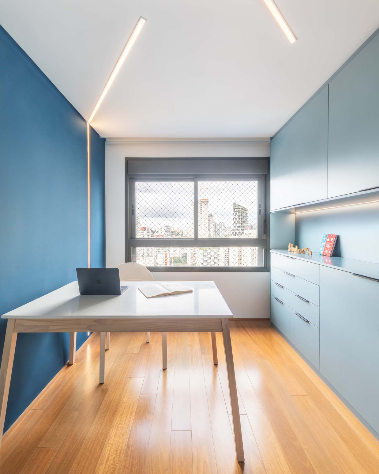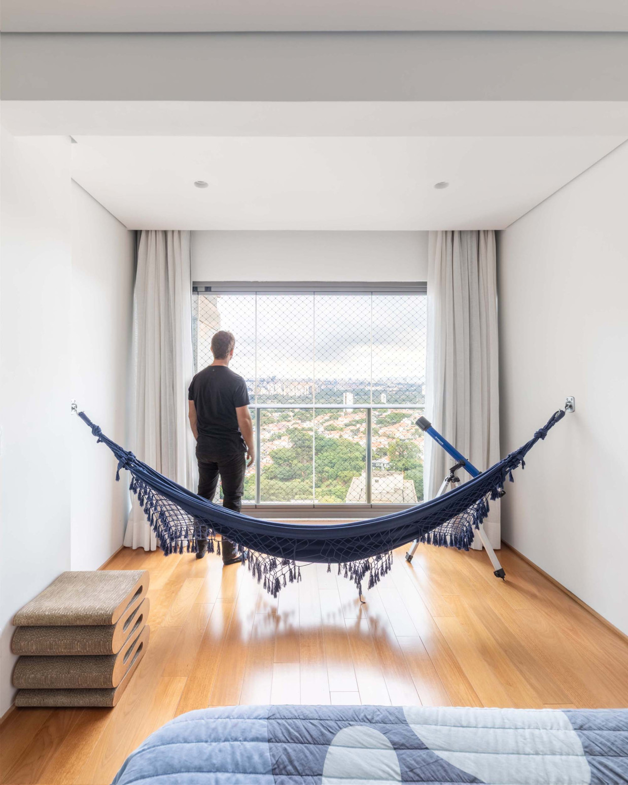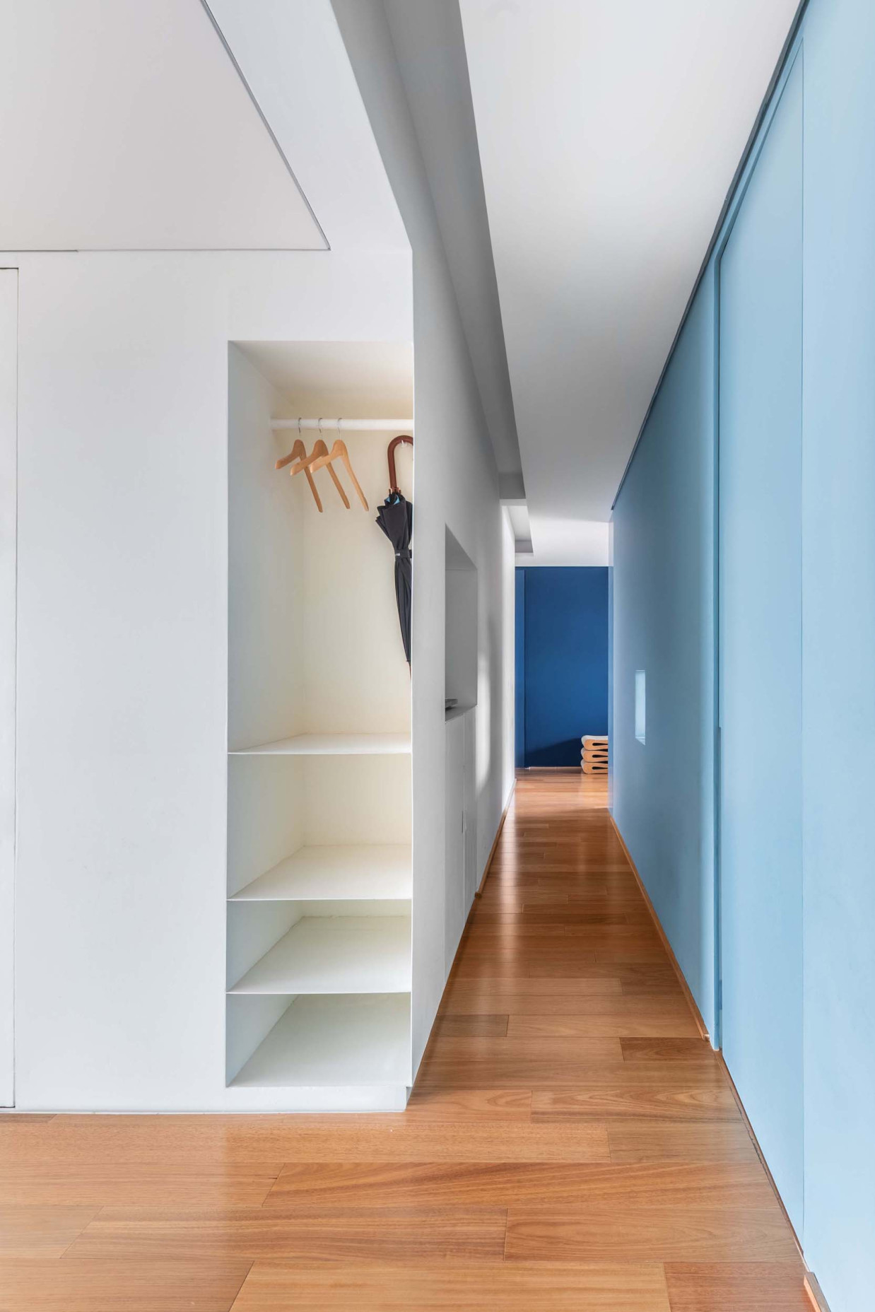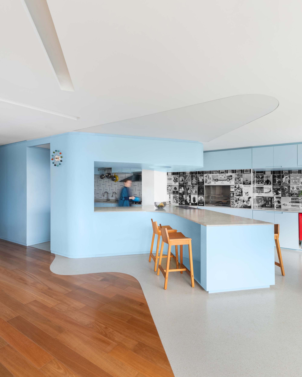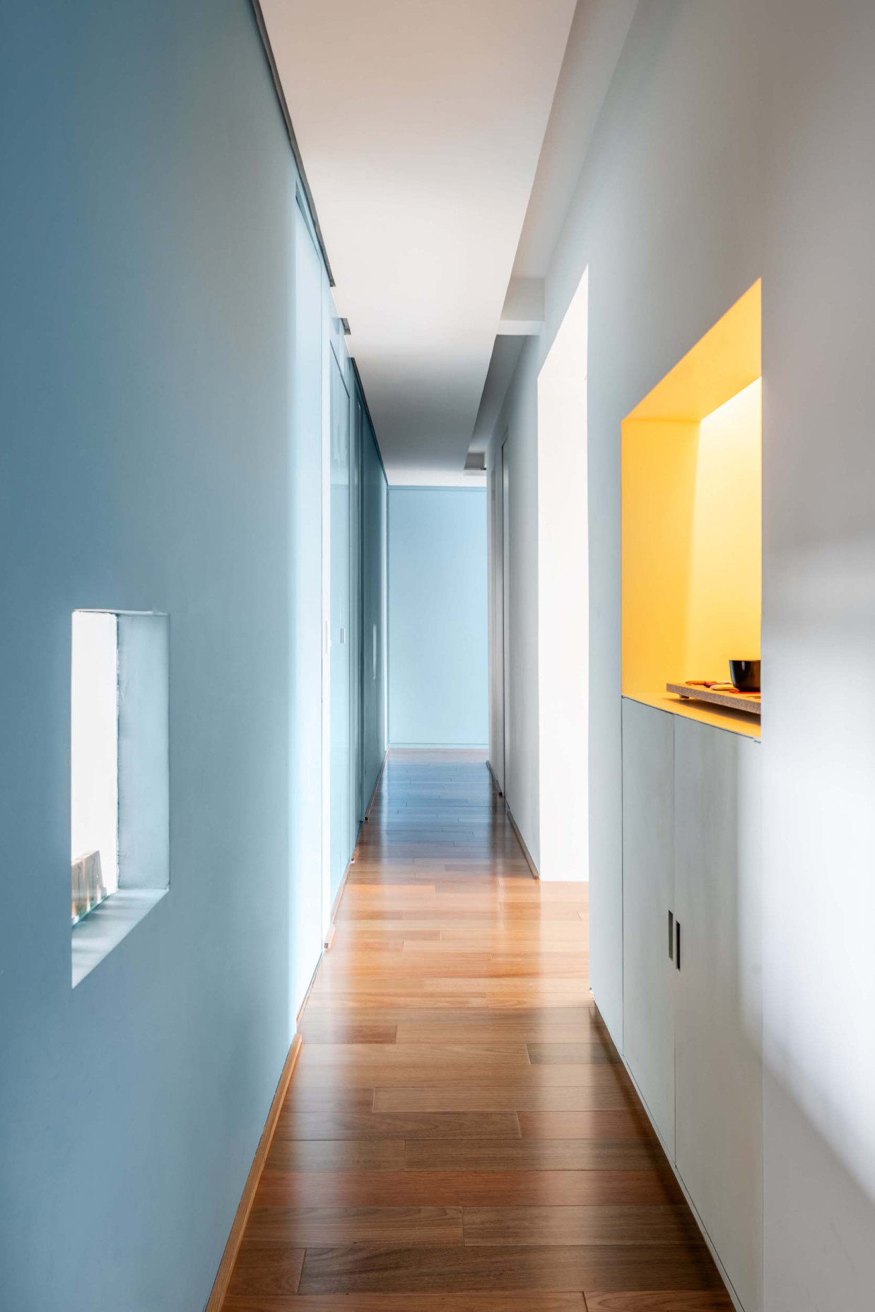 For all those who inhabit increasingly denser cities, where land is rare and their relations with the landscape are scarce, there is not a more common way of living than that of superimposed spaces isolated from an external dimension of the world. It is this experience that we look to recover here. Considering the unity’s generous proportions, the large opening to a privilege view and the habits of the family that will be living there, we started the project by reducing its divisions to the minimum. Understanding the apartment as a brute stone, a central solid is defined in its interior housing the access tunnel and significant part of its services. Around it, three other solids – for the couple, the daughters and the kitchen – are arranged in such a way that the most important space rises precisely from the void between them: free places for different interactions and movements, spaces inside spaces in a dialogue of “intimate solids” and “collective voids”. This collective place is pretended to attend the intense and generous social life of the family, guided by hospitality, music and, above all, cooking. Therefore, it’s from the kitchen’s solid – fluid form unique – that breaks out the sinuous counter around which a vivid and everyday appropriation is imagined, extending along the entire facade as a transitional floor between inside and out. Architecture and design come together in the versatile metal and wood furniture, in the subtle graduation of colors and in the constant diffused light. A belvedere house above the city landscape waiting everyday for the sunset.