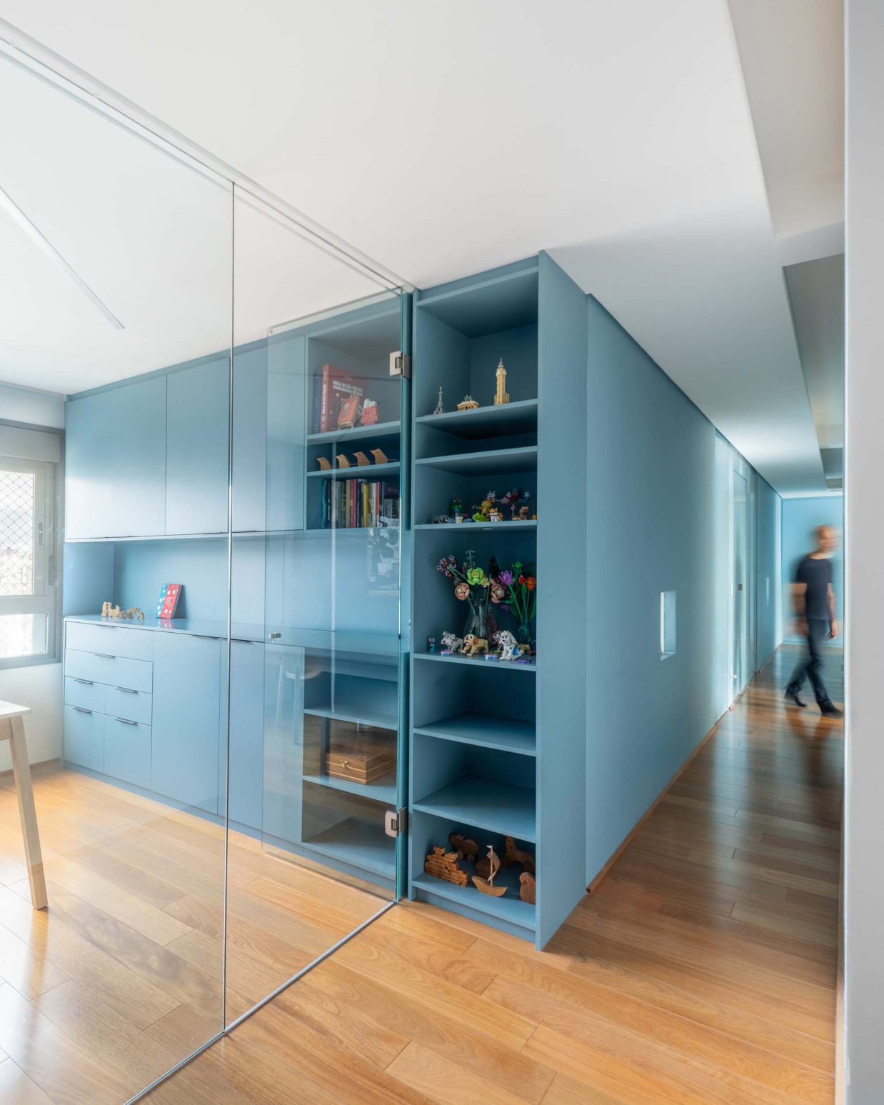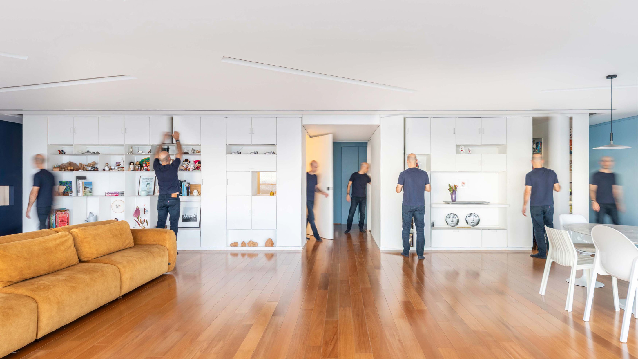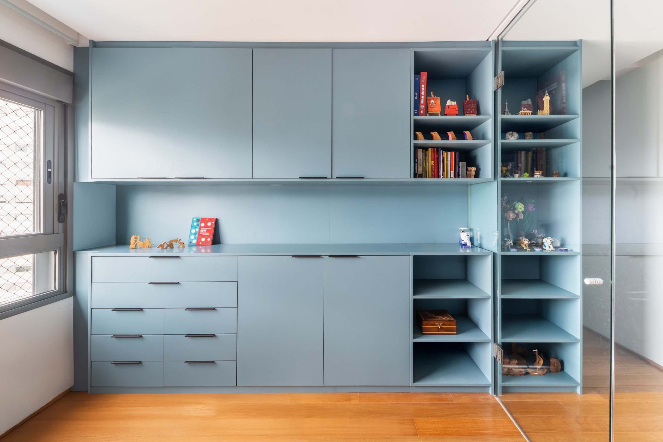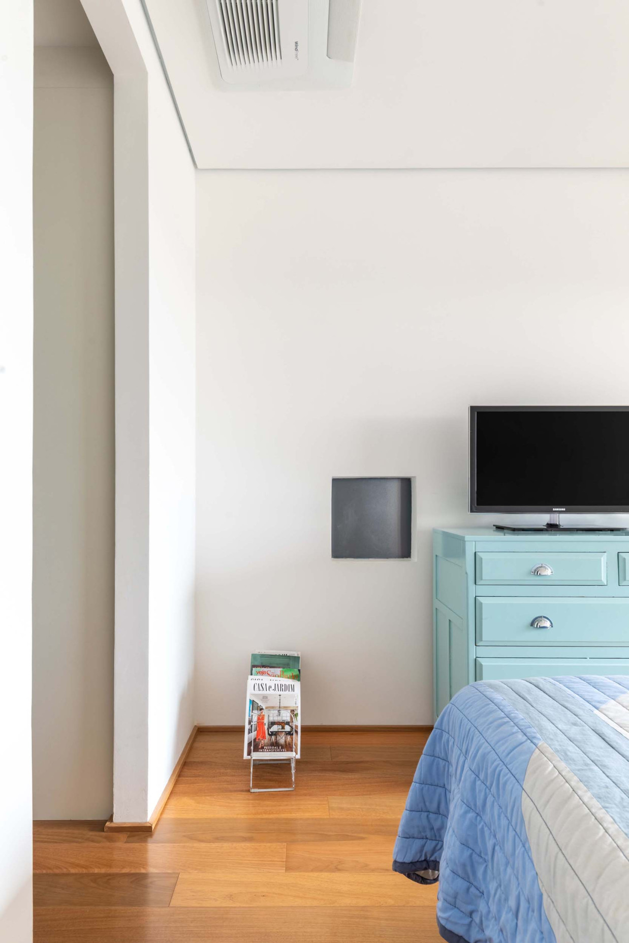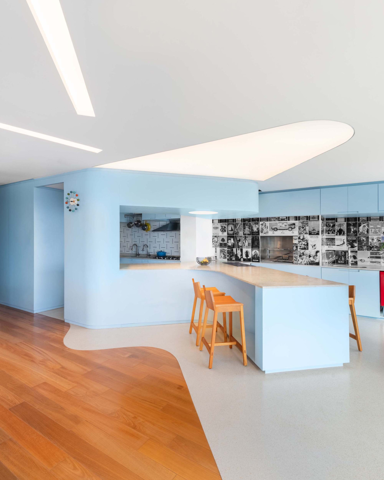 For all those who inhabit increasingly denser cities, where land is rare and their relations with the landscape are scarce, there is not a more common way of living than that of superimposed spaces isolated from an external dimension of the world. It is this experience that we look to recover here. Considering the unity’s generous proportions, the large opening to a privilege view and the habits of the family that will be living there, we started the project by reducing its divisions to the minimum. Understanding the apartment as a brute stone, a central solid is defined in its interior housing the access tunnel and significant part of its services. Around it, three other solids – for the couple, the daughters and the kitchen – are arranged in such a way that the most important space rises precisely from the void between them: free places for different interactions and movements, spaces inside spaces in a dialogue of “intimate solids” and “collective voids”. This collective place is pretended to attend the intense and generous social life of the family, guided by hospitality, music and, above all, cooking. Therefore, it’s from the kitchen’s solid – fluid form unique – that breaks out the sinuous counter around which a vivid and everyday appropriation is imagined, extending along the entire facade as a transitional floor between inside and out. Architecture and design come together in the versatile metal and wood furniture, in the subtle graduation of colors and in the constant diffused light. A belvedere house above the city landscape waiting everyday for the sunset.