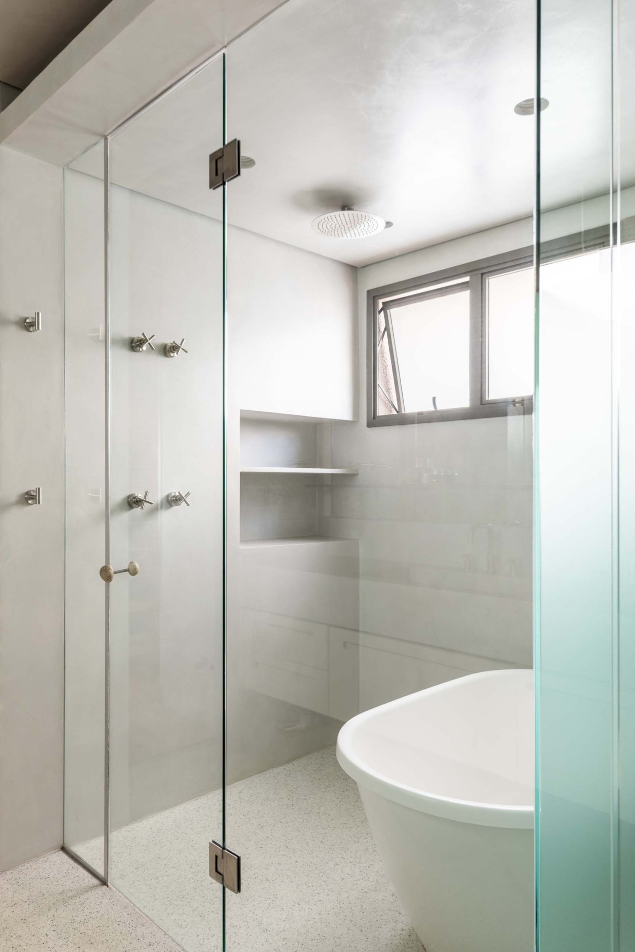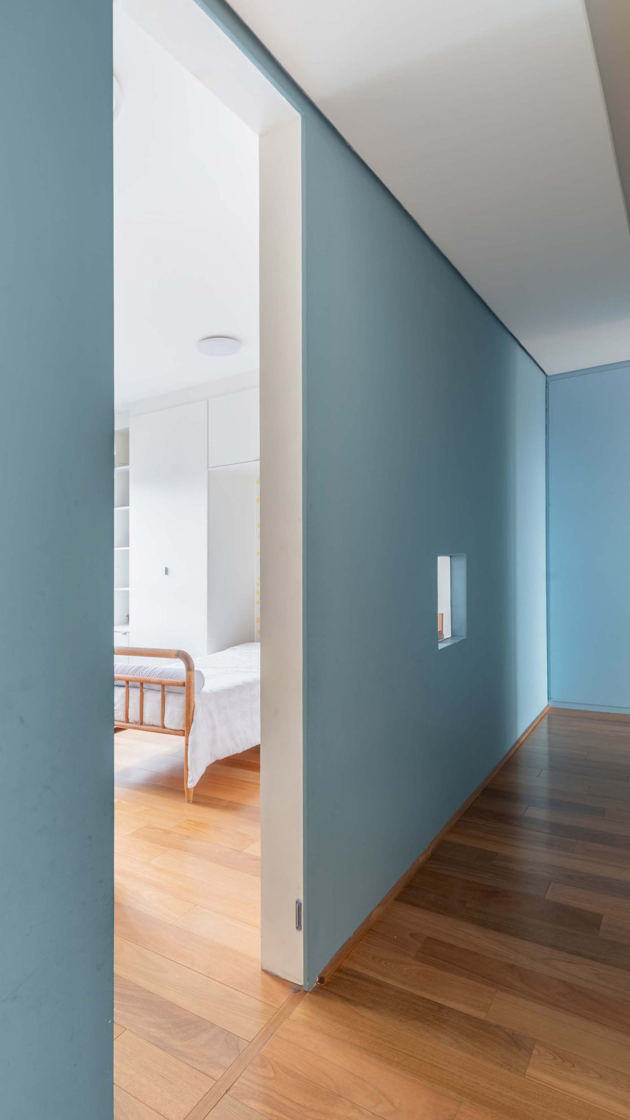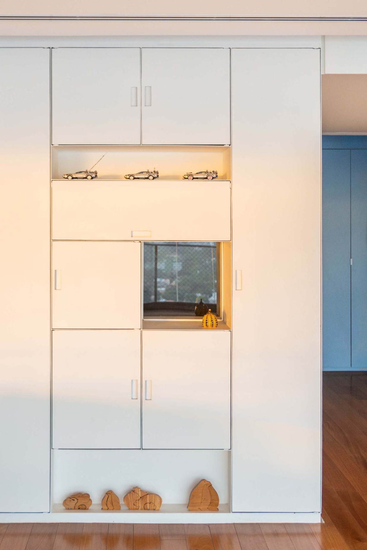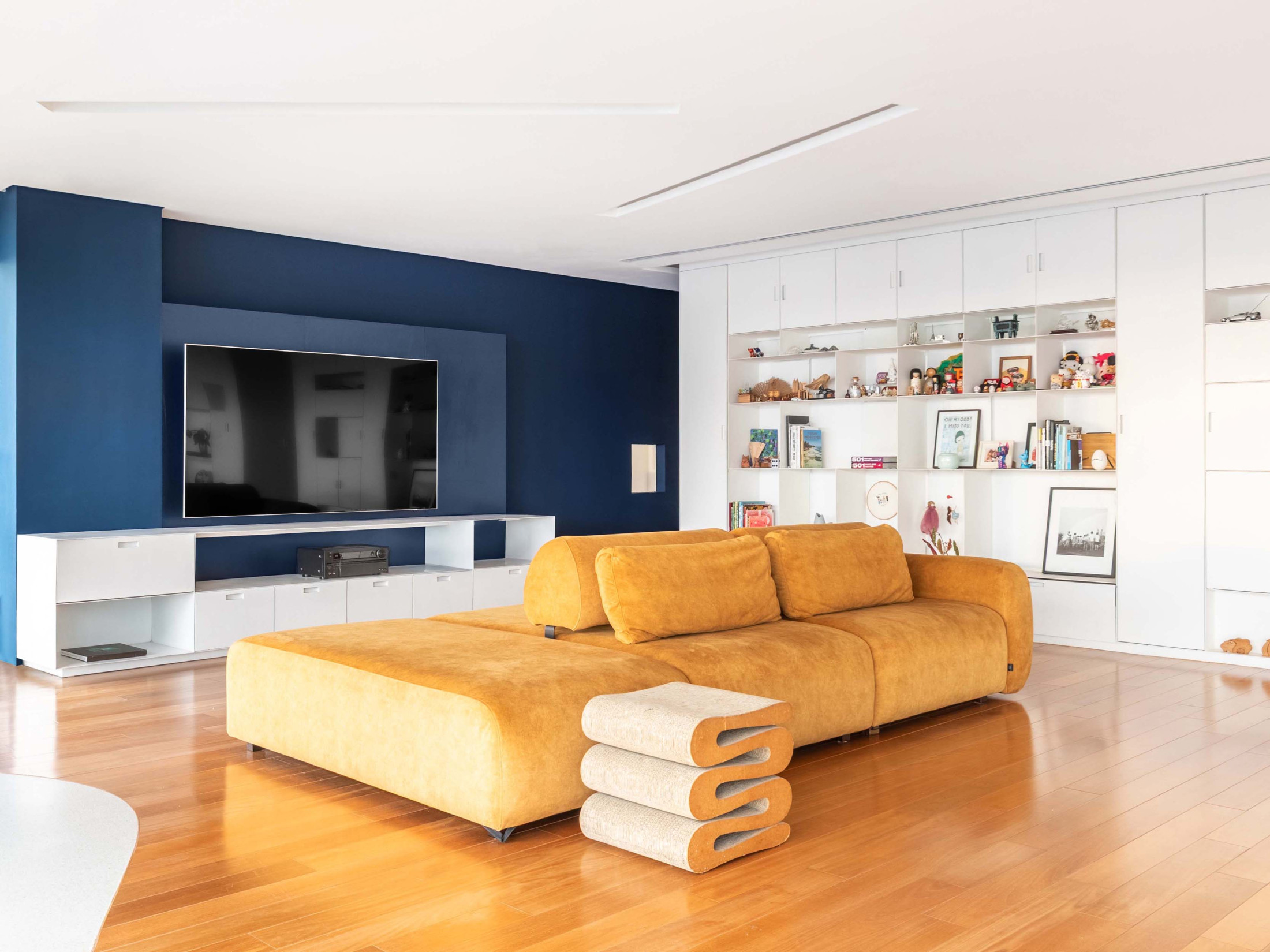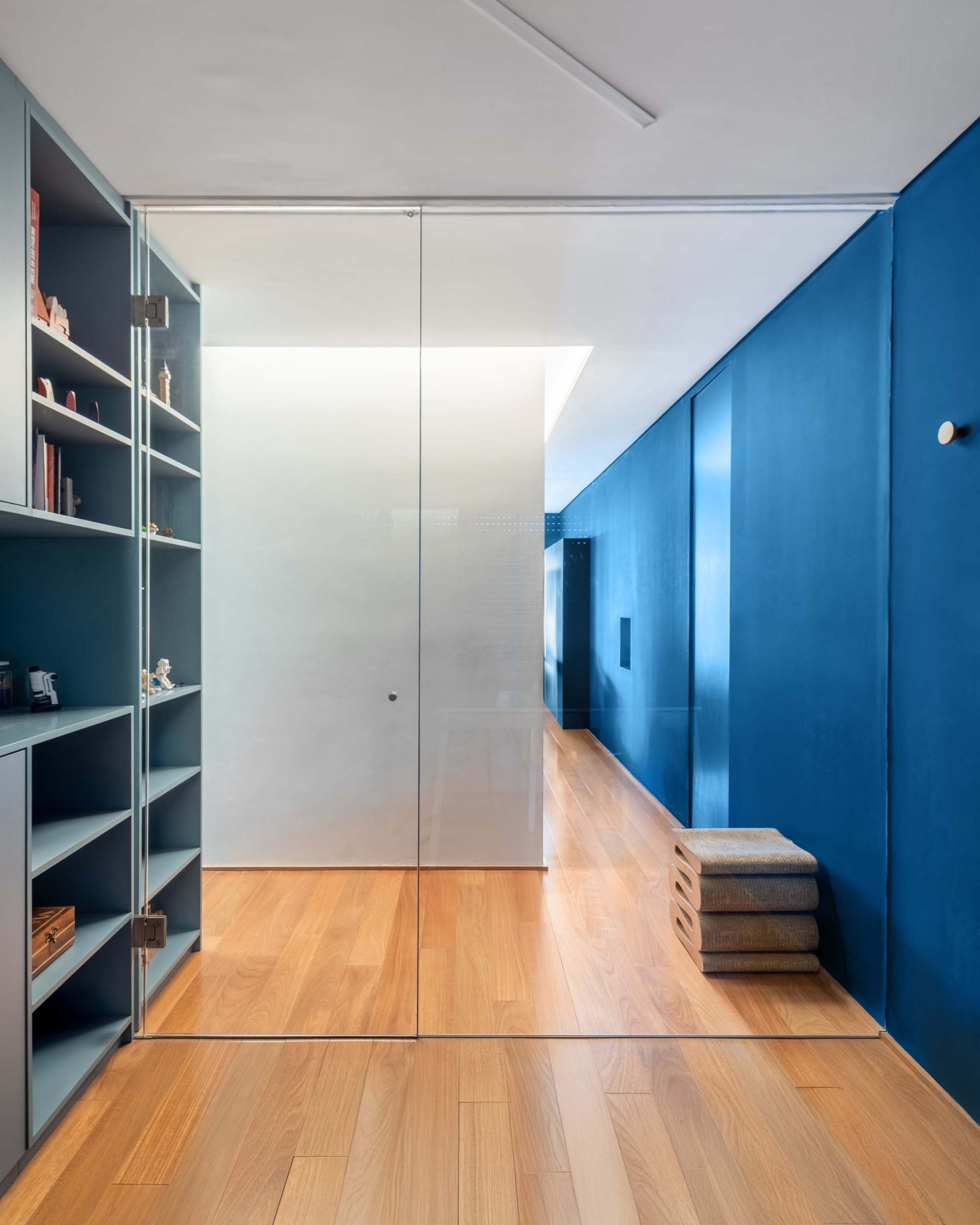 For all those who inhabit increasingly denser cities, where land is rare and their relations with the landscape are scarce, there is not a more common way of living than that of superimposed spaces isolated from an external dimension of the world. It is this experience that we look to recover here. Considering the unity’s generous proportions, the large opening to a privilege view and the habits of the family that will be living there, we started the project by reducing its divisions to the minimum. Understanding the apartment as a brute stone, a central solid is defined in its interior housing the access tunnel and significant part of its services. Around it, three other solids – for the couple, the daughters and the kitchen – are arranged in such a way that the most important space rises precisely from the void between them: free places for different interactions and movements, spaces inside spaces in a dialogue of “intimate solids” and “collective voids”. This collective place is pretended to attend the intense and generous social life of the family, guided by hospitality, music and, above all, cooking. Therefore, it’s from the kitchen’s solid – fluid form unique – that breaks out the sinuous counter around which a vivid and everyday appropriation is imagined, extending along the entire facade as a transitional floor between inside and out. Architecture and design come together in the versatile metal and wood furniture, in the subtle graduation of colors and in the constant diffused light. A belvedere house above the city landscape waiting everyday for the sunset.