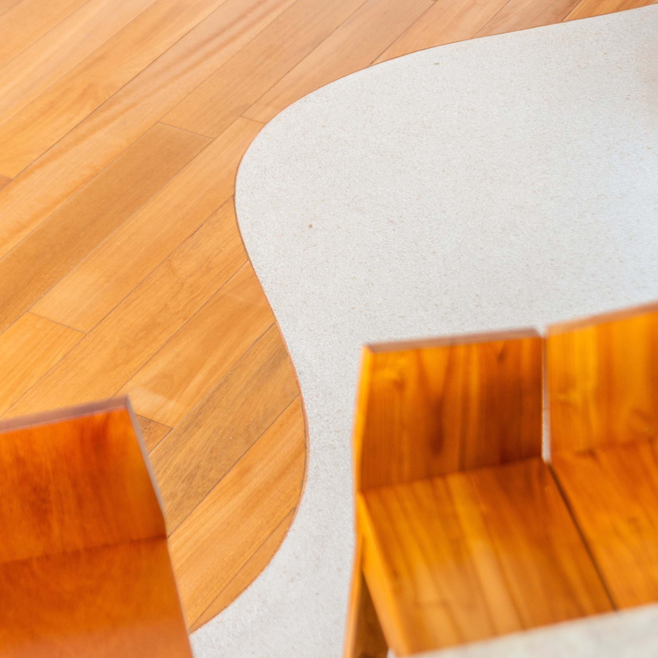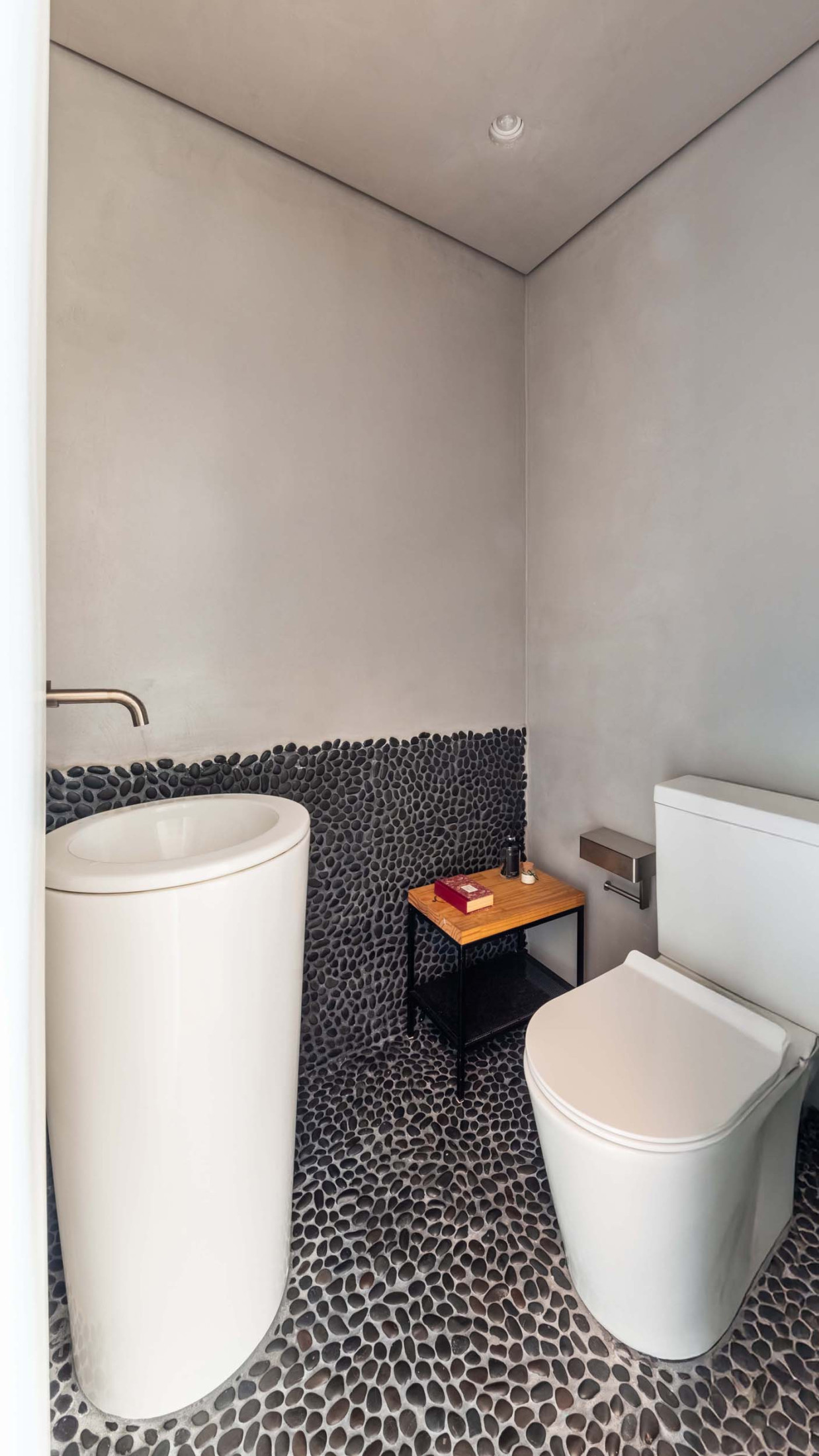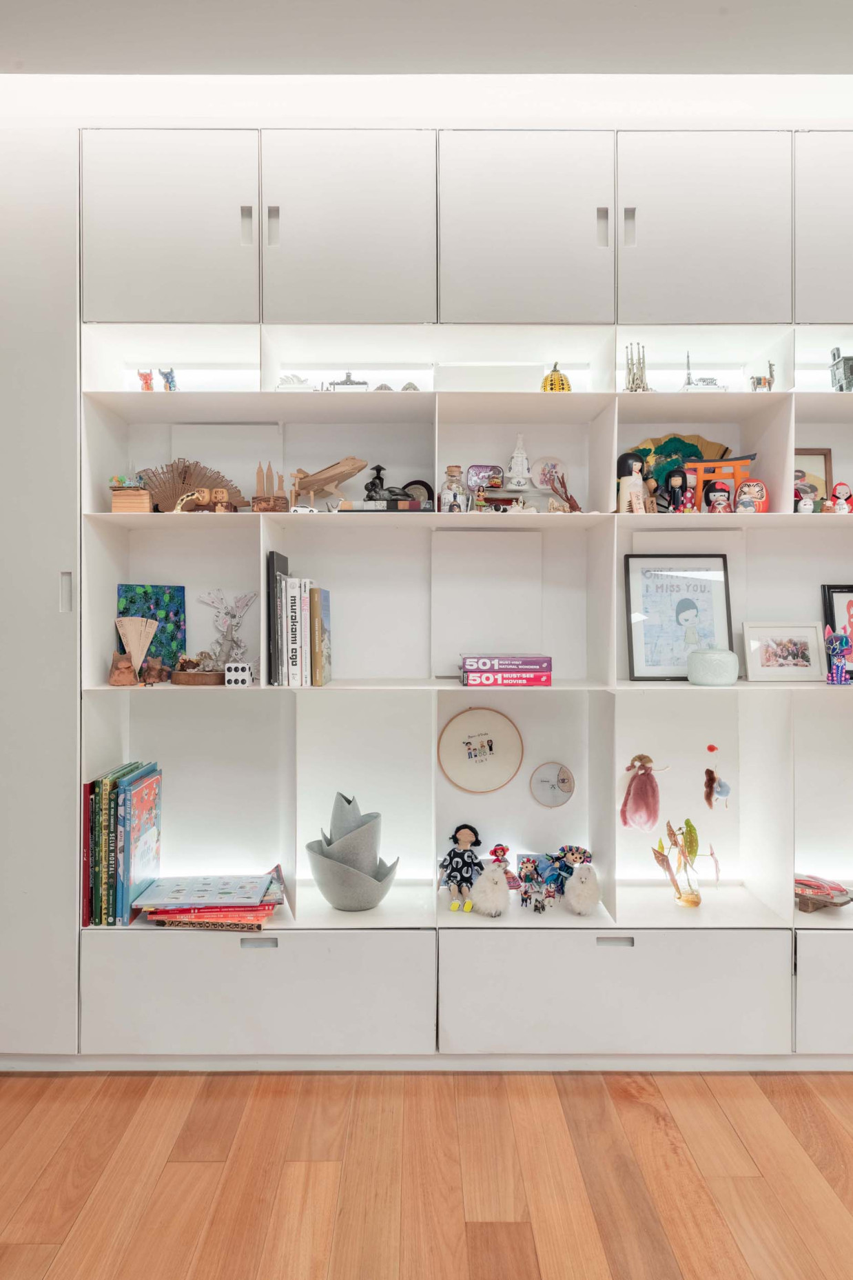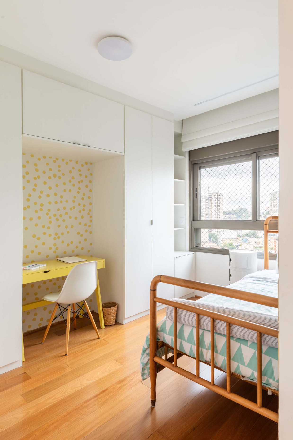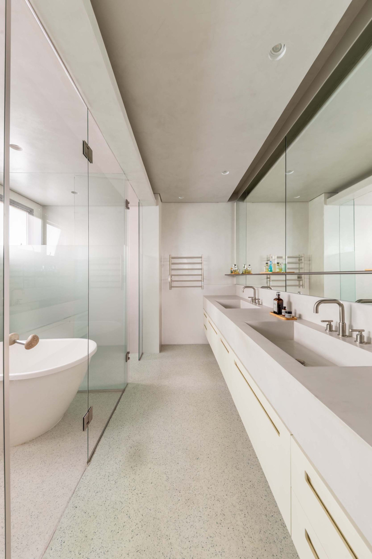 For all those who inhabit increasingly denser cities, where land is rare and their relations with the landscape are scarce, there is not a more common way of living than that of superimposed spaces isolated from an external dimension of the world. It is this experience that we look to recover here. Considering the unity’s generous proportions, the large opening to a privilege view and the habits of the family that will be living there, we started the project by reducing its divisions to the minimum. Understanding the apartment as a brute stone, a central solid is defined in its interior housing the access tunnel and significant part of its services. Around it, three other solids – for the couple, the daughters and the kitchen – are arranged in such a way that the most important space rises precisely from the void between them: free places for different interactions and movements, spaces inside spaces in a dialogue of “intimate solids” and “collective voids”. This collective place is pretended to attend the intense and generous social life of the family, guided by hospitality, music and, above all, cooking. Therefore, it’s from the kitchen’s solid – fluid form unique – that breaks out the sinuous counter around which a vivid and everyday appropriation is imagined, extending along the entire facade as a transitional floor between inside and out. Architecture and design come together in the versatile metal and wood furniture, in the subtle graduation of colors and in the constant diffused light. A belvedere house above the city landscape waiting everyday for the sunset.