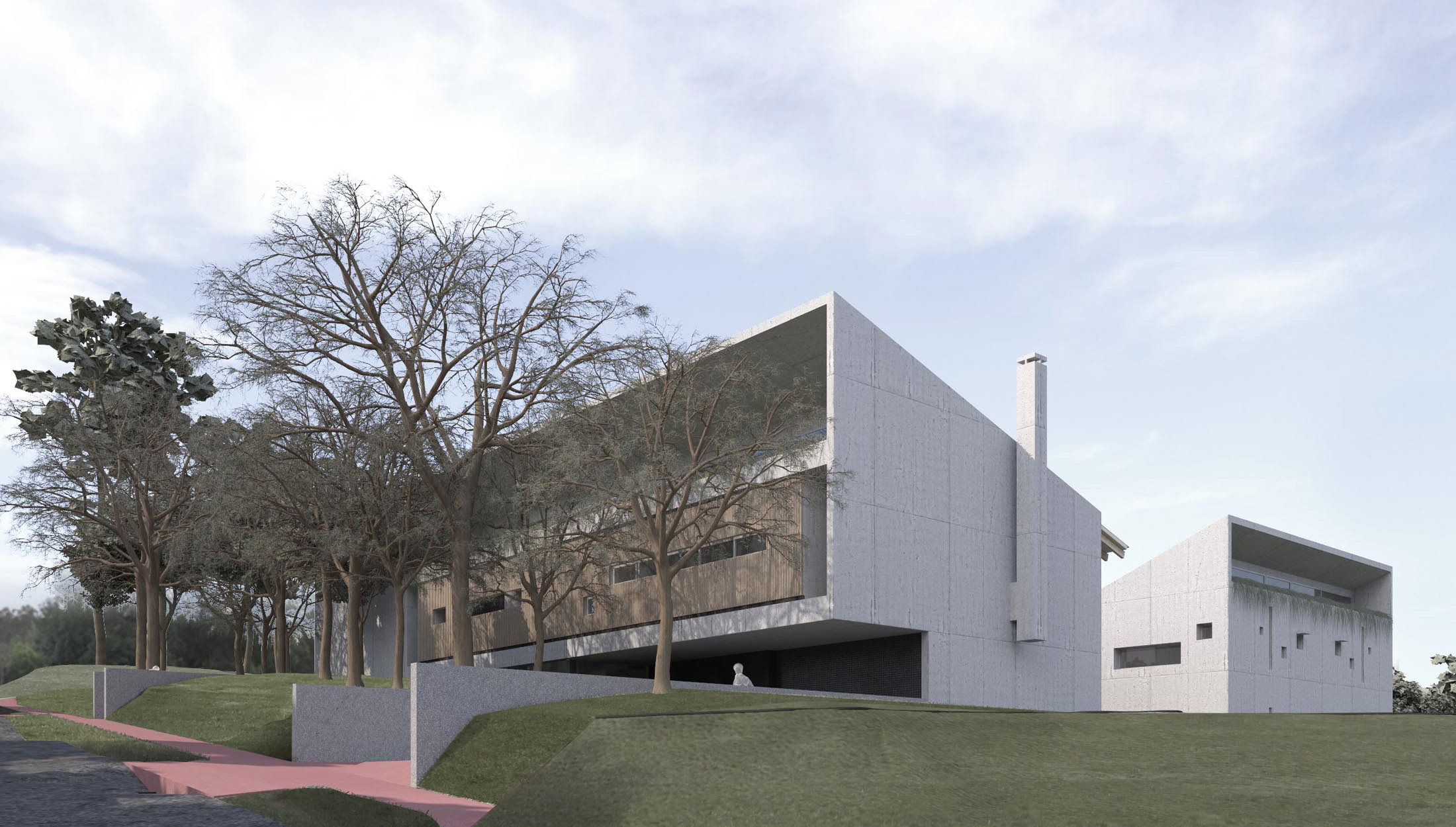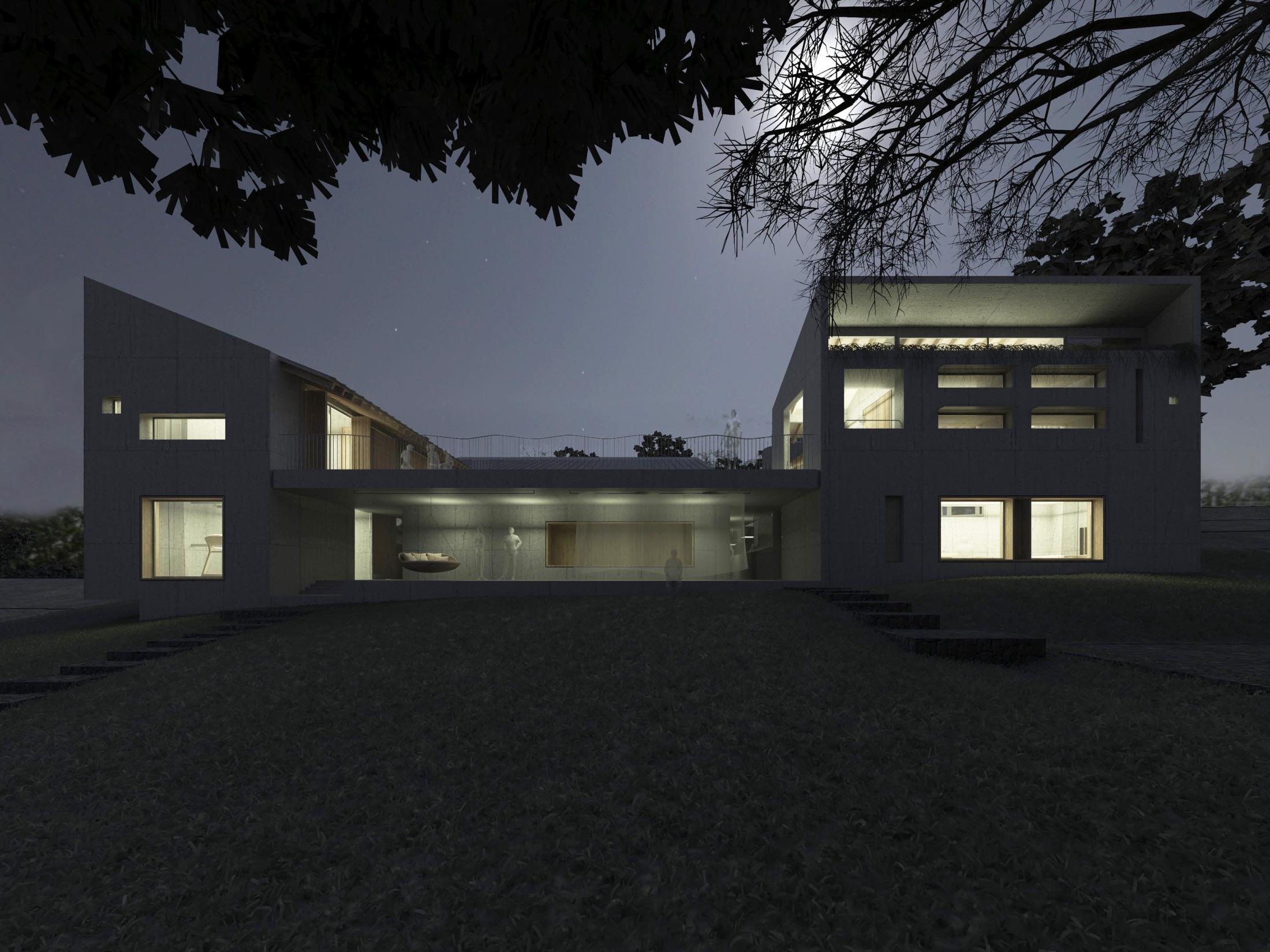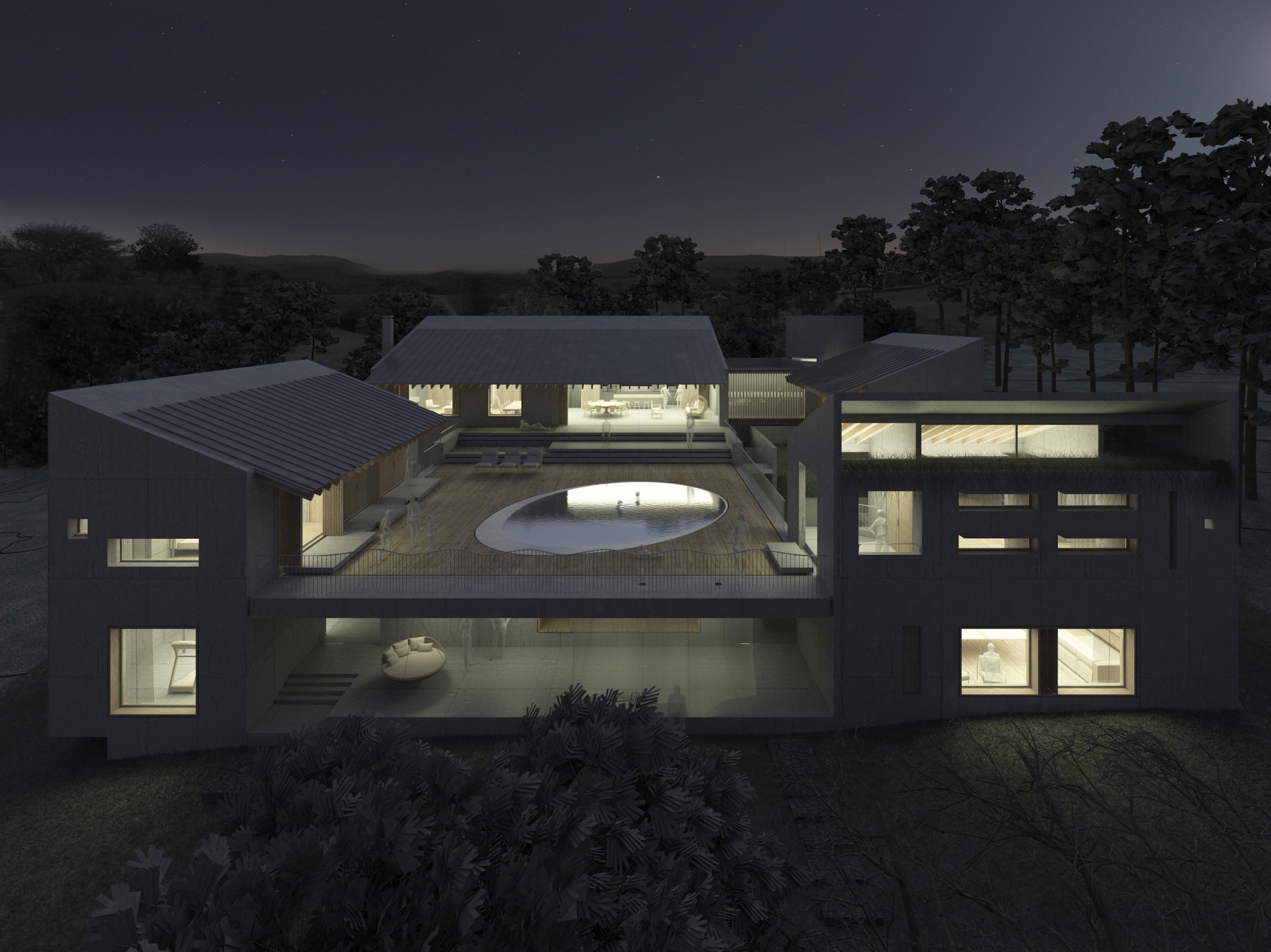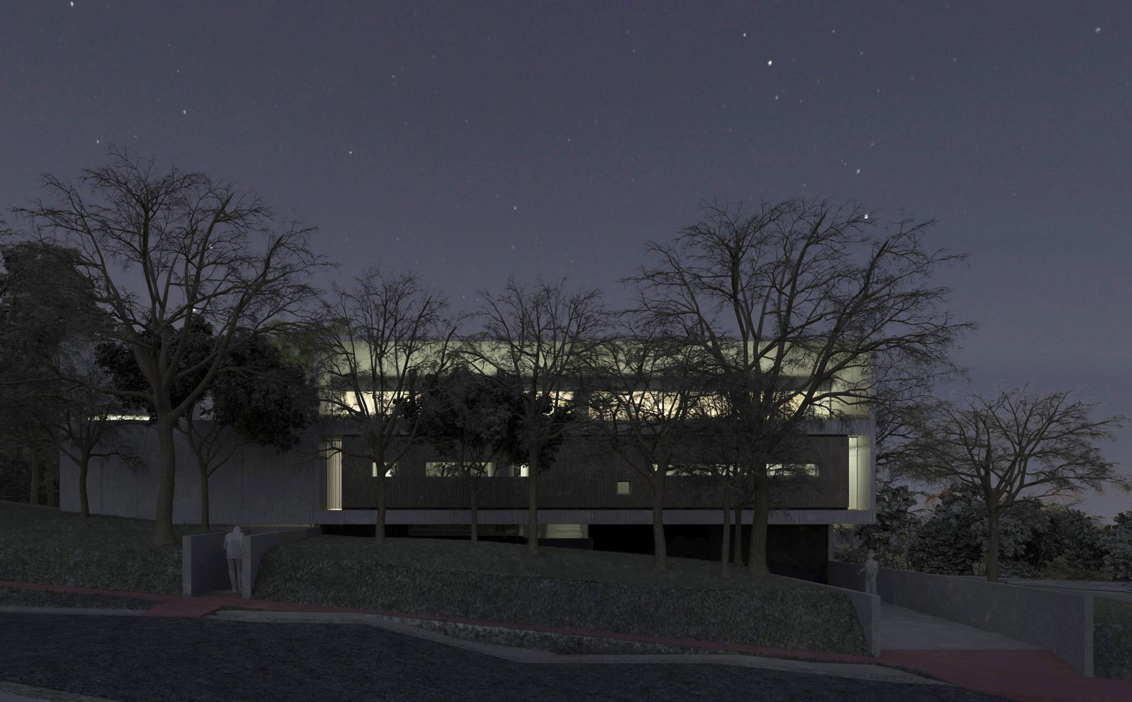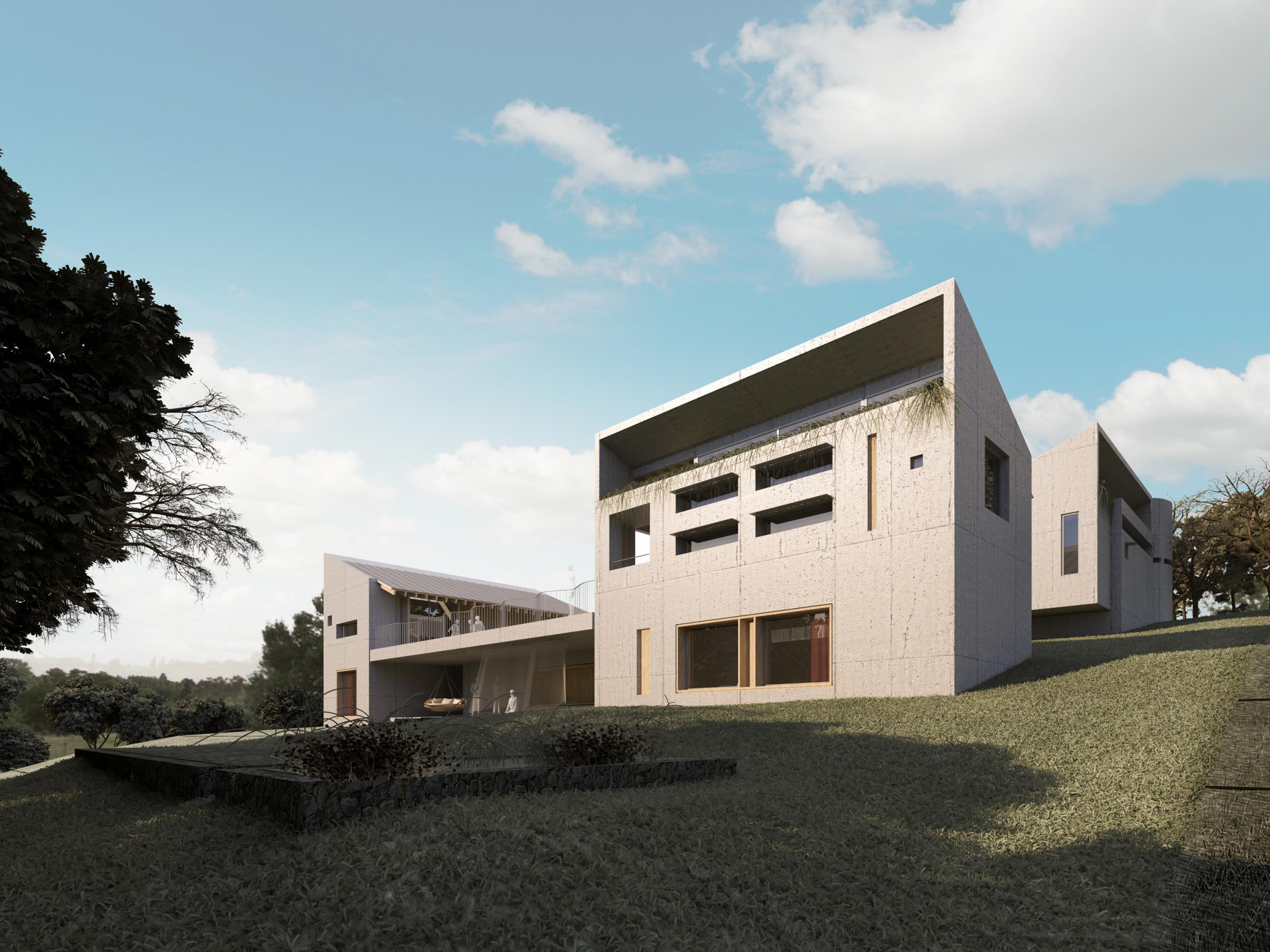 Conceiving a house is trying to pursue what it should always be: a temple to inhabit the universe – place of our experiences whose memories architecture registers in its matter. This house is idealized as a symbolic and poetic fortress made to remember us of the passing of time in our bodies and minds. From the human geometric order, it springs bursting its interior into a supreme enclosure: the central plaza – domestic agora – as a promontory open to the sky and landscape. Everything leads to it and radiates from it: hospitable gatherings and celebrations of a gregarious life sheltered in this village of gardens and constructions (central, couple, studies, guests and children). From the house typological imaginary, its volumes of concrete and wooden sloped roofs originate varied overhangs, porches and windows; and to enter this citadel, a cleft excavated through the frontal trees takes us inside the ground, where an indecipherable door reveals the mystic transition from the water patio to the vastness of the plaza and existing forest to which it opens itself. Thus, we create silence and calmness for a ludic contemplation of nature, time, day and night, in an everlasting pendulum between introspection and coexistence that value the indispensability of both to our well-being. Finally, we seek that its architecture becomes an enunciator of an ethics that reveals its many senses, meanings, secrets and fantasies through time. A house that, together with us, can grow up and age, aways guarding our permanence in the world.