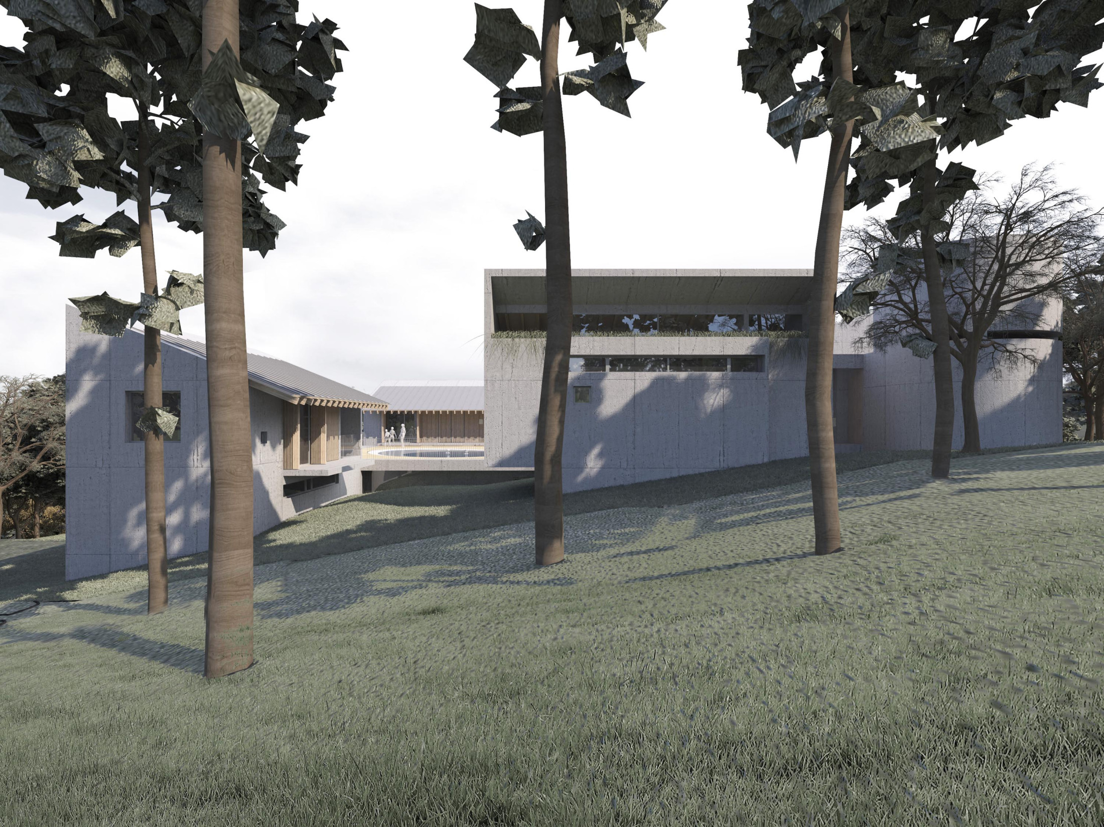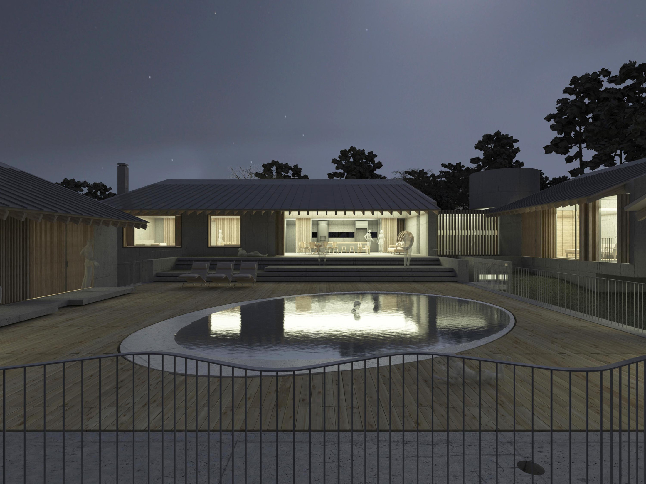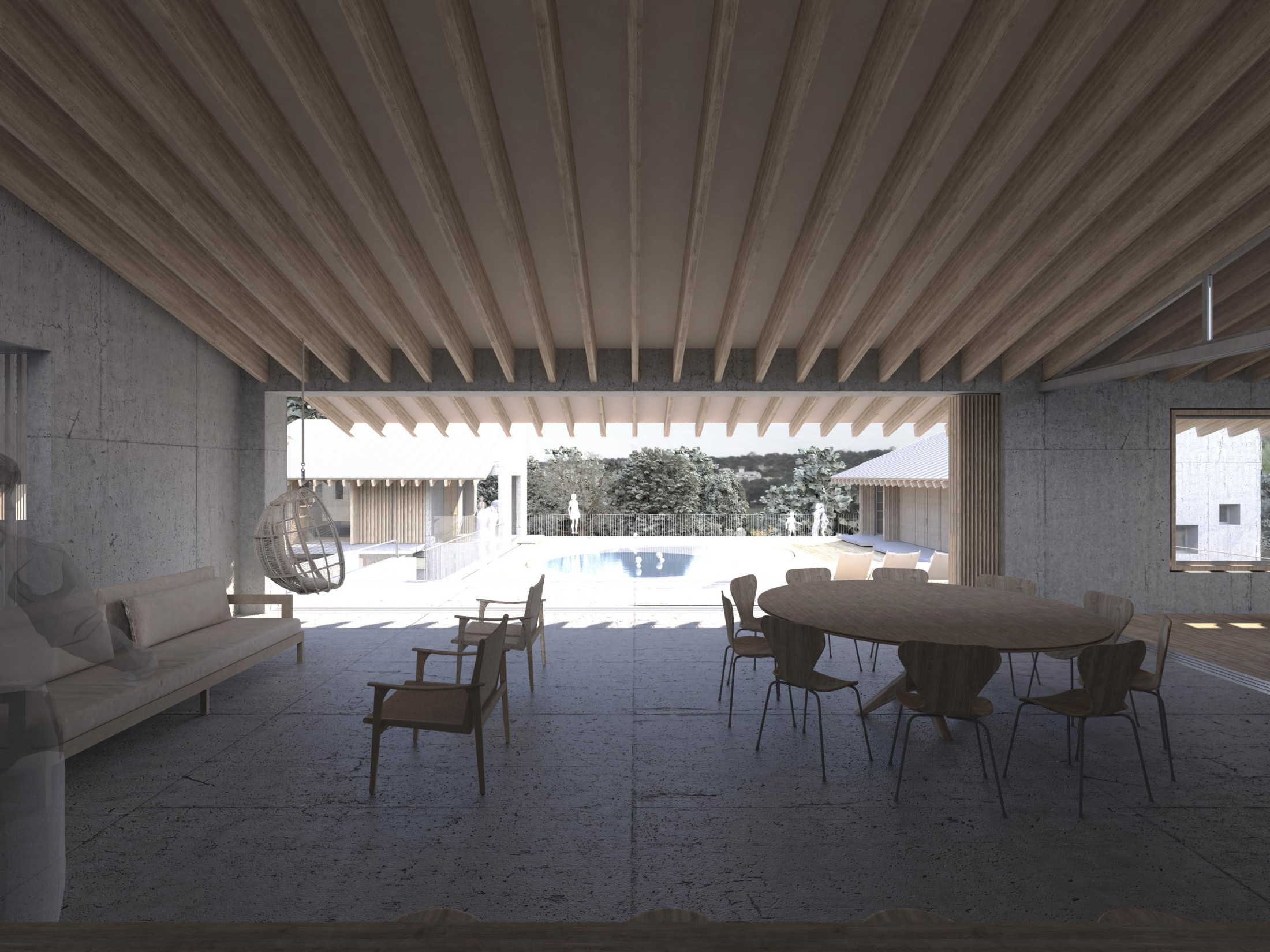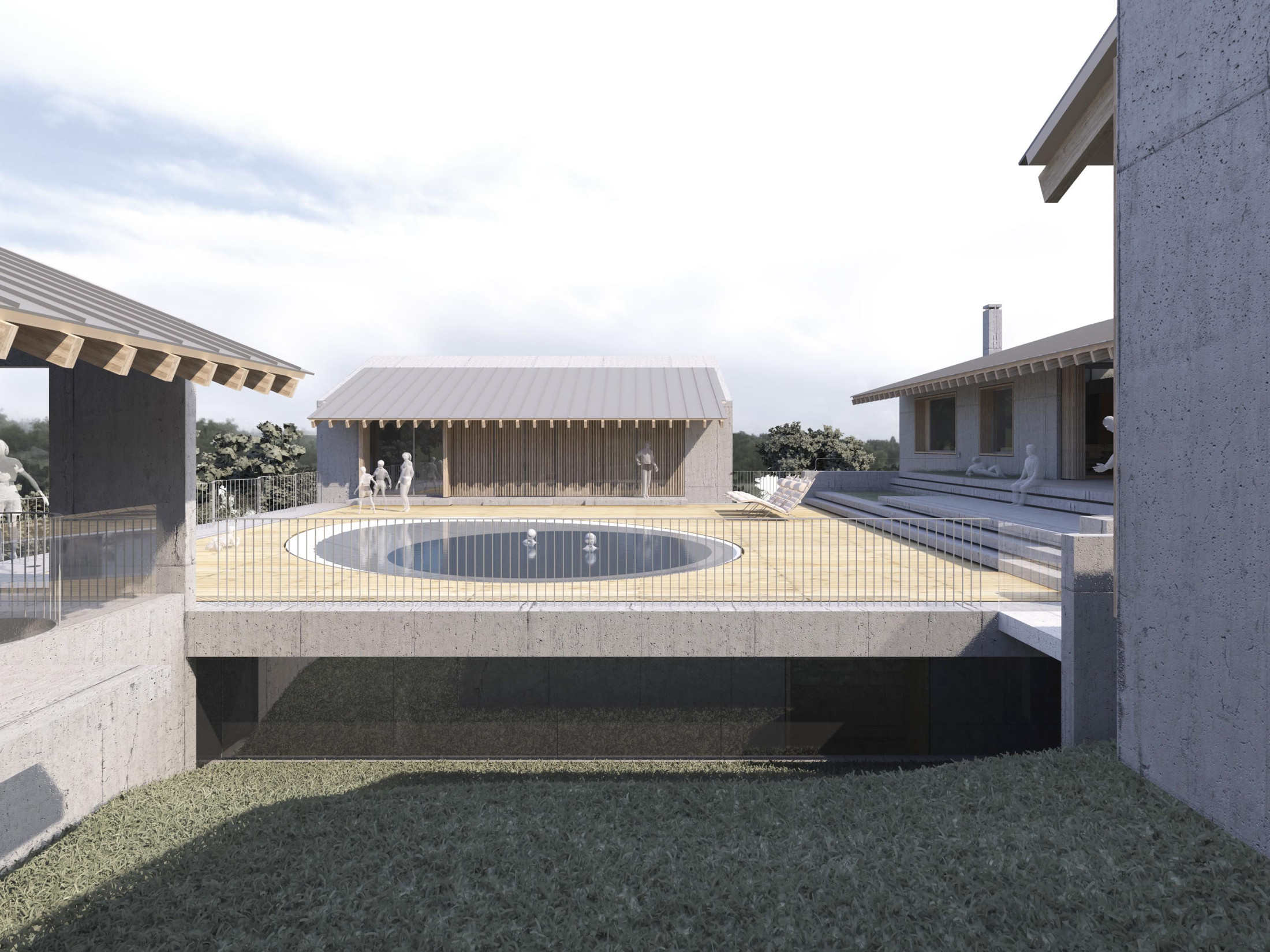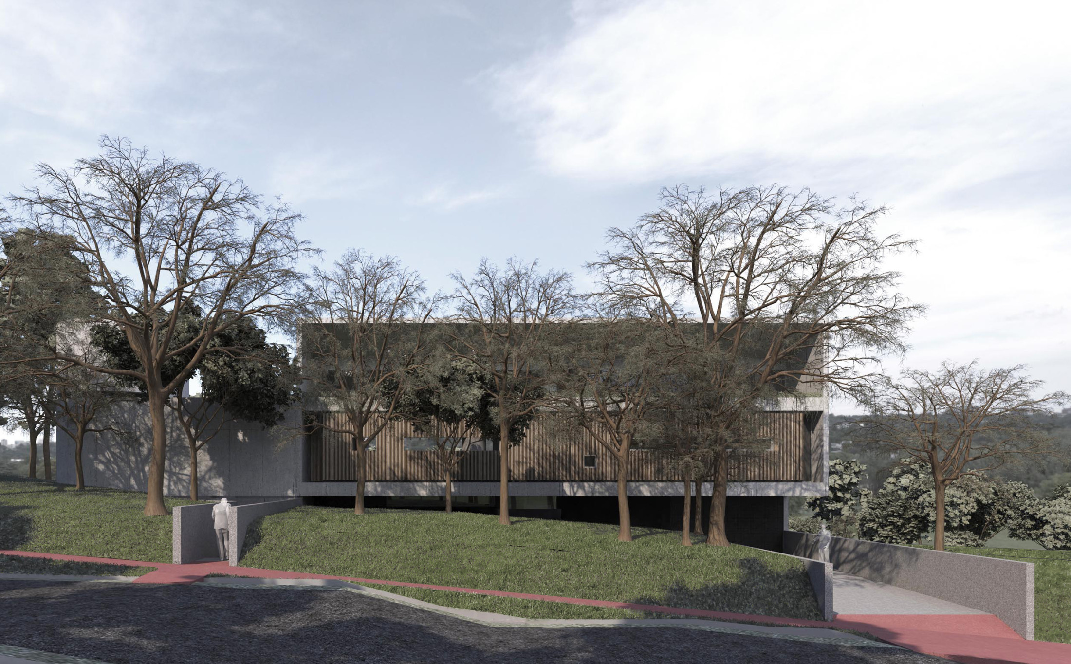 Conceiving a house is trying to pursue what it should always be: a temple to inhabit the universe – place of our experiences whose memories architecture registers in its matter. This house is idealized as a symbolic and poetic fortress made to remember us of the passing of time in our bodies and minds. From the human geometric order, it springs bursting its interior into a supreme enclosure: the central plaza – domestic agora – as a promontory open to the sky and landscape. Everything leads to it and radiates from it: hospitable gatherings and celebrations of a gregarious life sheltered in this village of gardens and constructions (central, couple, studies, guests and children). From the house typological imaginary, its volumes of concrete and wooden sloped roofs originate varied overhangs, porches and windows; and to enter this citadel, a cleft excavated through the frontal trees takes us inside the ground, where an indecipherable door reveals the mystic transition from the water patio to the vastness of the plaza and existing forest to which it opens itself. Thus, we create silence and calmness for a ludic contemplation of nature, time, day and night, in an everlasting pendulum between introspection and coexistence that value the indispensability of both to our well-being. Finally, we seek that its architecture becomes an enunciator of an ethics that reveals its many senses, meanings, secrets and fantasies through time. A house that, together with us, can grow up and age, aways guarding our permanence in the world.