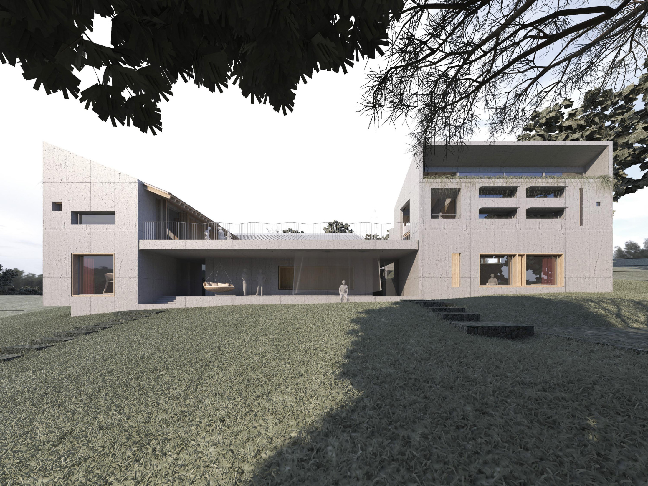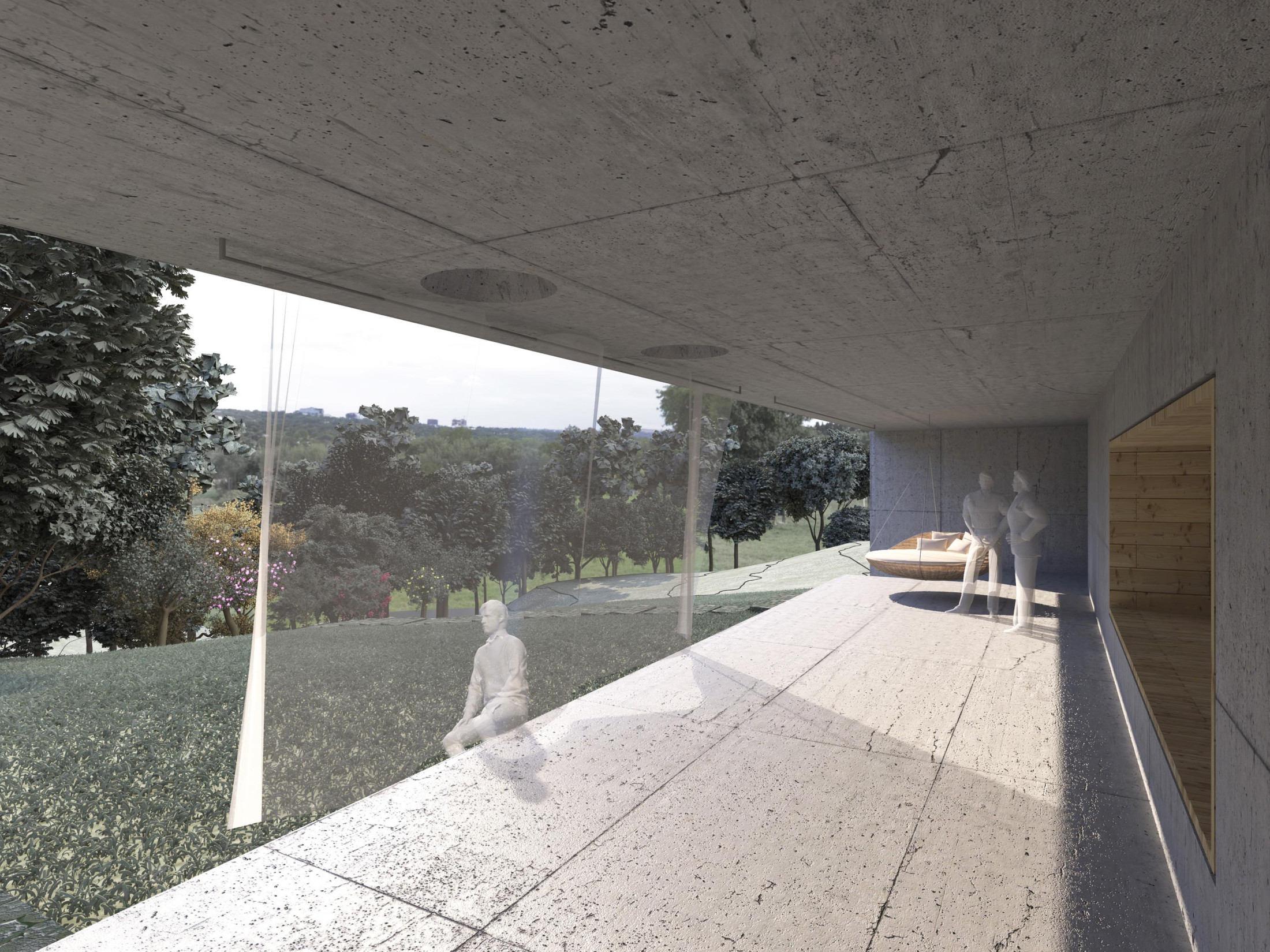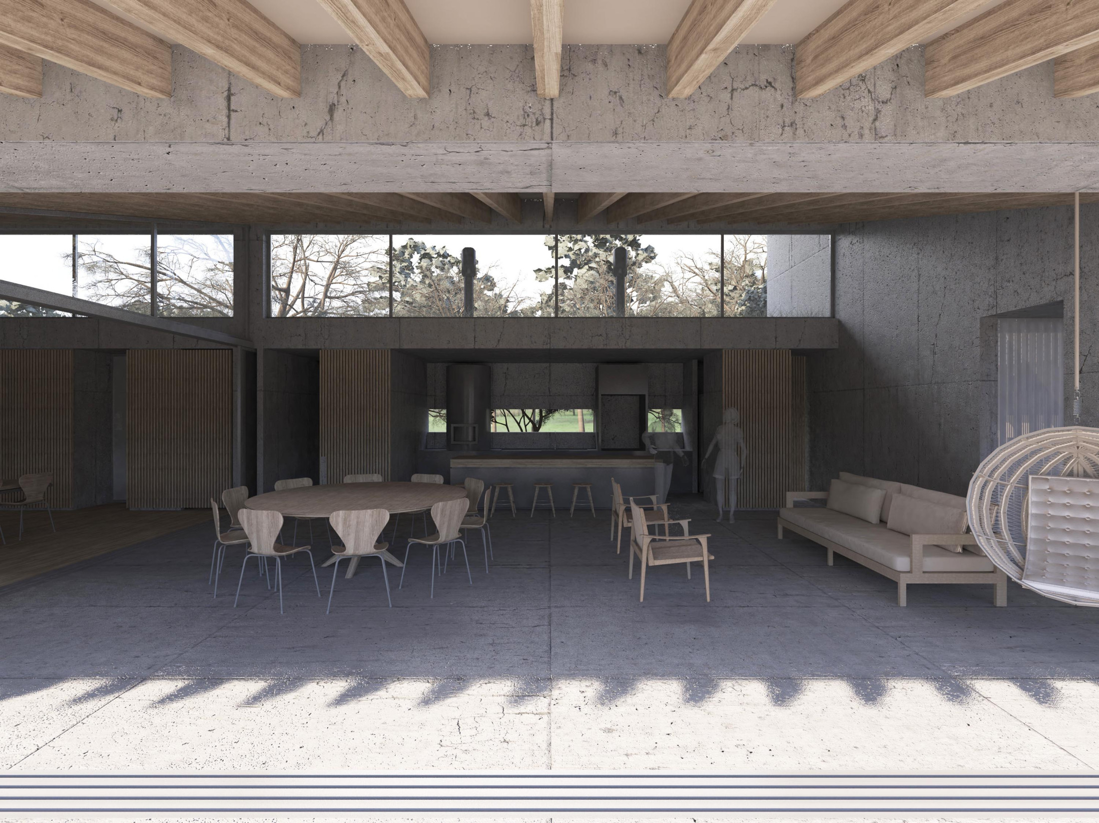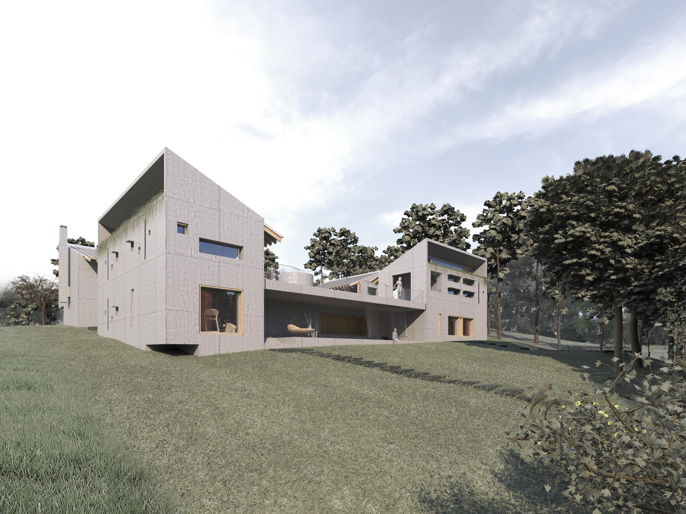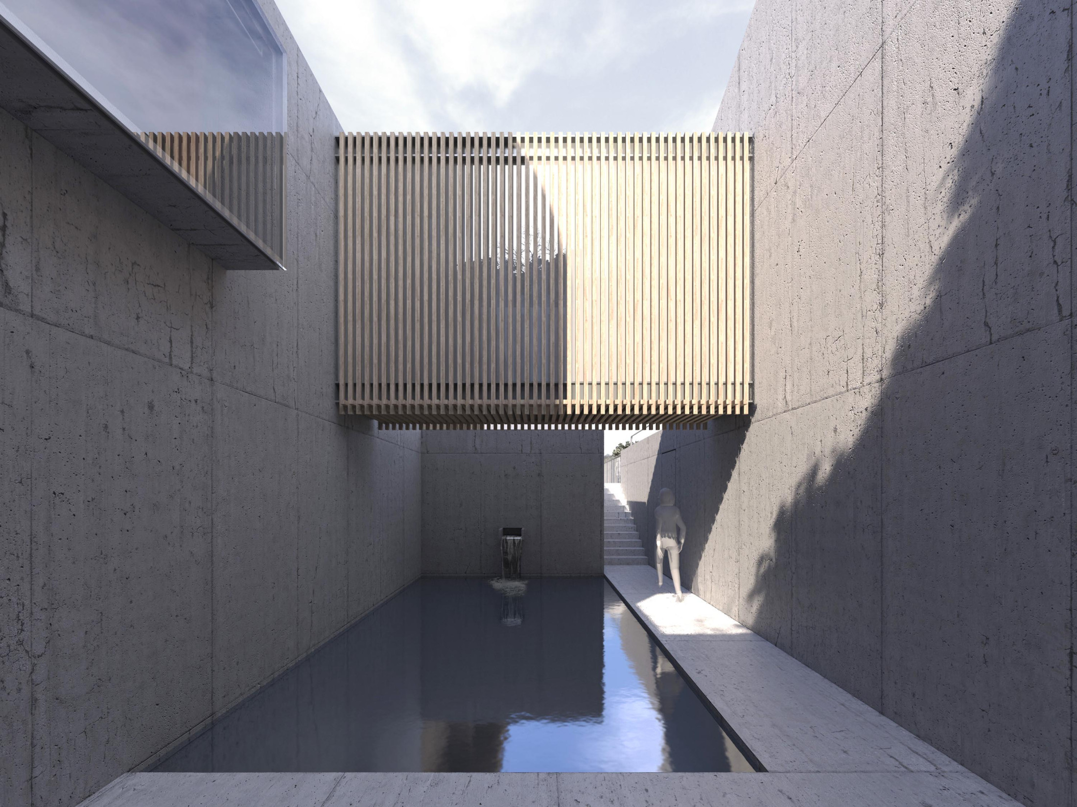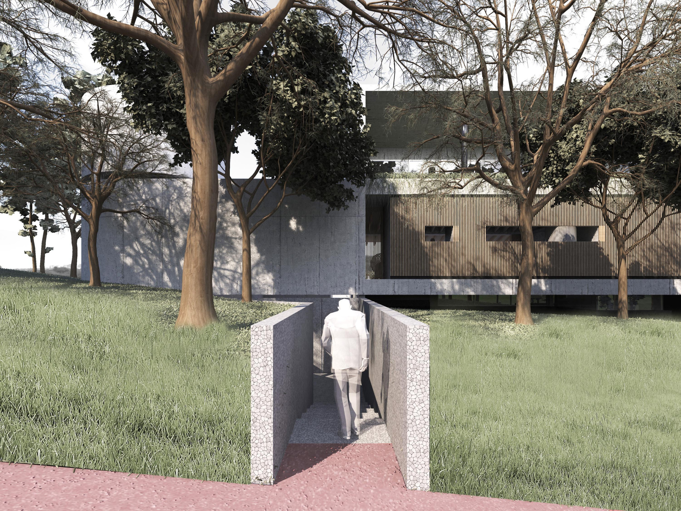 Conceiving a house is trying to pursue what it should always be: a temple to inhabit the universe – place of our experiences whose memories architecture registers in its matter. This house is idealized as a symbolic and poetic fortress made to remember us of the passing of time in our bodies and minds. From the human geometric order, it springs bursting its interior into a supreme enclosure: the central plaza – domestic agora – as a promontory open to the sky and landscape. Everything leads to it and radiates from it: hospitable gatherings and celebrations of a gregarious life sheltered in this village of gardens and constructions (central, couple, studies, guests and children). From the house typological imaginary, its volumes of concrete and wooden sloped roofs originate varied overhangs, porches and windows; and to enter this citadel, a cleft excavated through the frontal trees takes us inside the ground, where an indecipherable door reveals the mystic transition from the water patio to the vastness of the plaza and existing forest to which it opens itself. Thus, we create silence and calmness for a ludic contemplation of nature, time, day and night, in an everlasting pendulum between introspection and coexistence that value the indispensability of both to our well-being. Finally, we seek that its architecture becomes an enunciator of an ethics that reveals its many senses, meanings, secrets and fantasies through time. A house that, together with us, can grow up and age, aways guarding our permanence in the world.