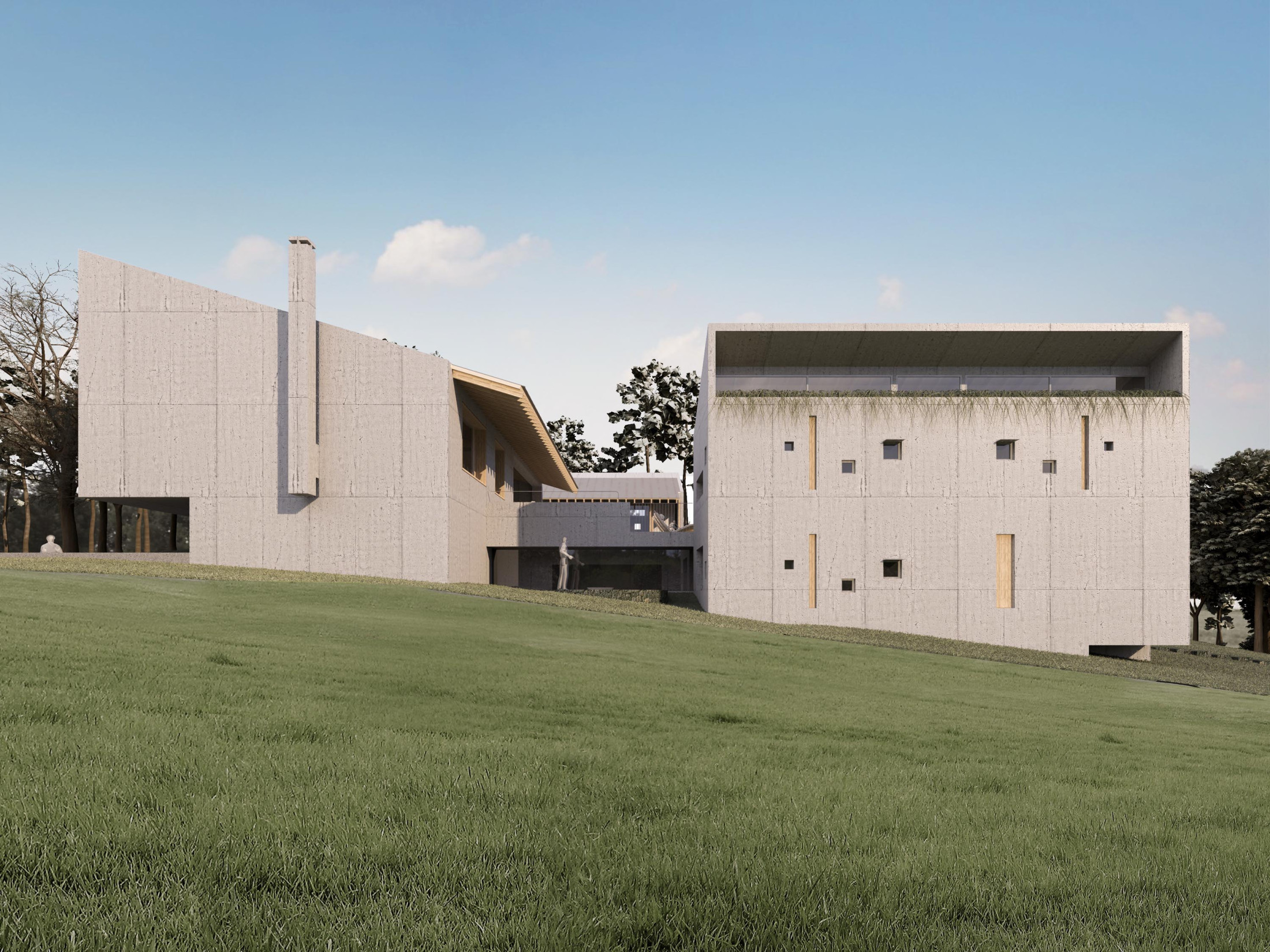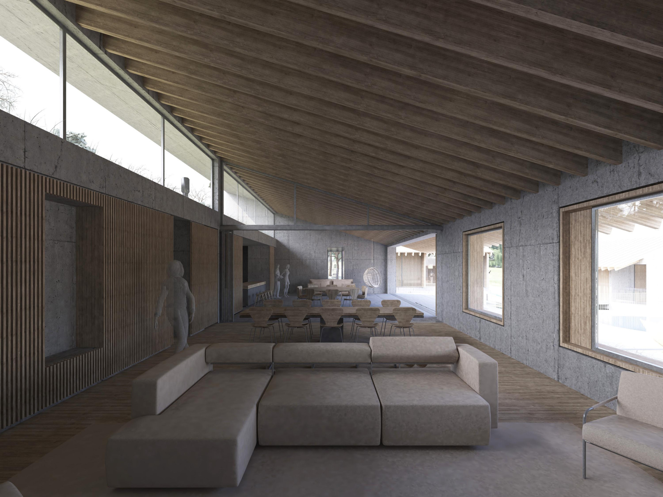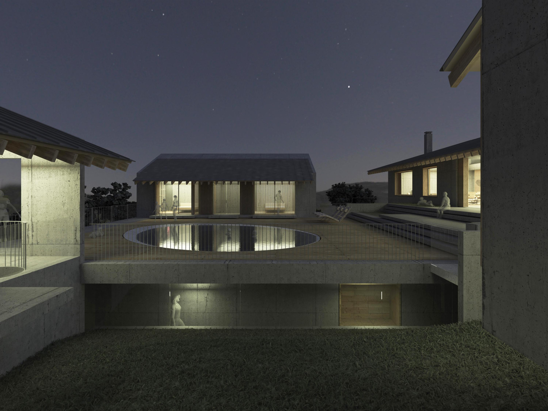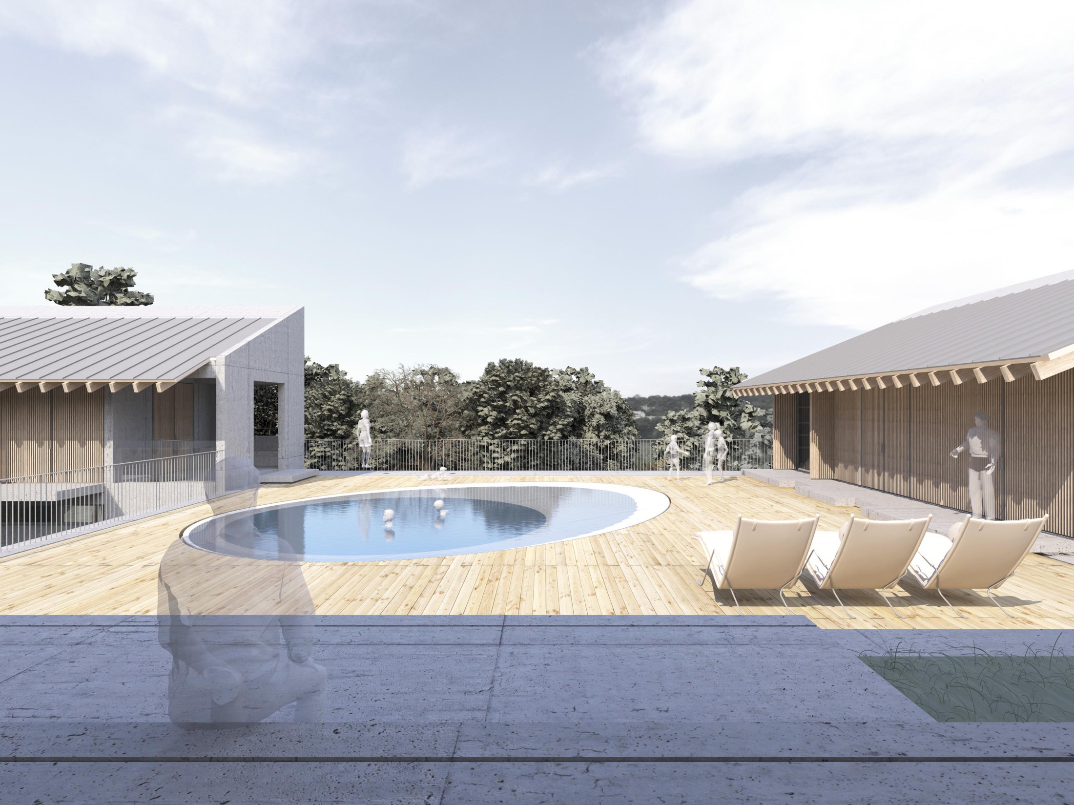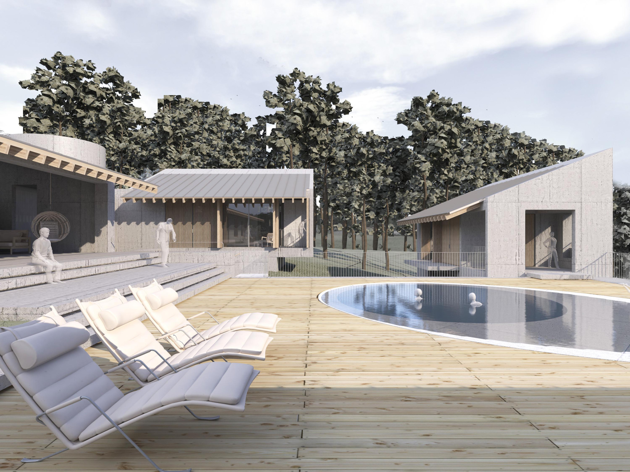 Conceiving a house is trying to pursue what it should always be: a temple to inhabit the universe – place of our experiences whose memories architecture registers in its matter. This house is idealized as a symbolic and poetic fortress made to remember us of the passing of time in our bodies and minds. From the human geometric order, it springs bursting its interior into a supreme enclosure: the central plaza – domestic agora – as a promontory open to the sky and landscape. Everything leads to it and radiates from it: hospitable gatherings and celebrations of a gregarious life sheltered in this village of gardens and constructions (central, couple, studies, guests and children). From the house typological imaginary, its volumes of concrete and wooden sloped roofs originate varied overhangs, porches and windows; and to enter this citadel, a cleft excavated through the frontal trees takes us inside the ground, where an indecipherable door reveals the mystic transition from the water patio to the vastness of the plaza and existing forest to which it opens itself. Thus, we create silence and calmness for a ludic contemplation of nature, time, day and night, in an everlasting pendulum between introspection and coexistence that value the indispensability of both to our well-being. Finally, we seek that its architecture becomes an enunciator of an ethics that reveals its many senses, meanings, secrets and fantasies through time. A house that, together with us, can grow up and age, aways guarding our permanence in the world.
