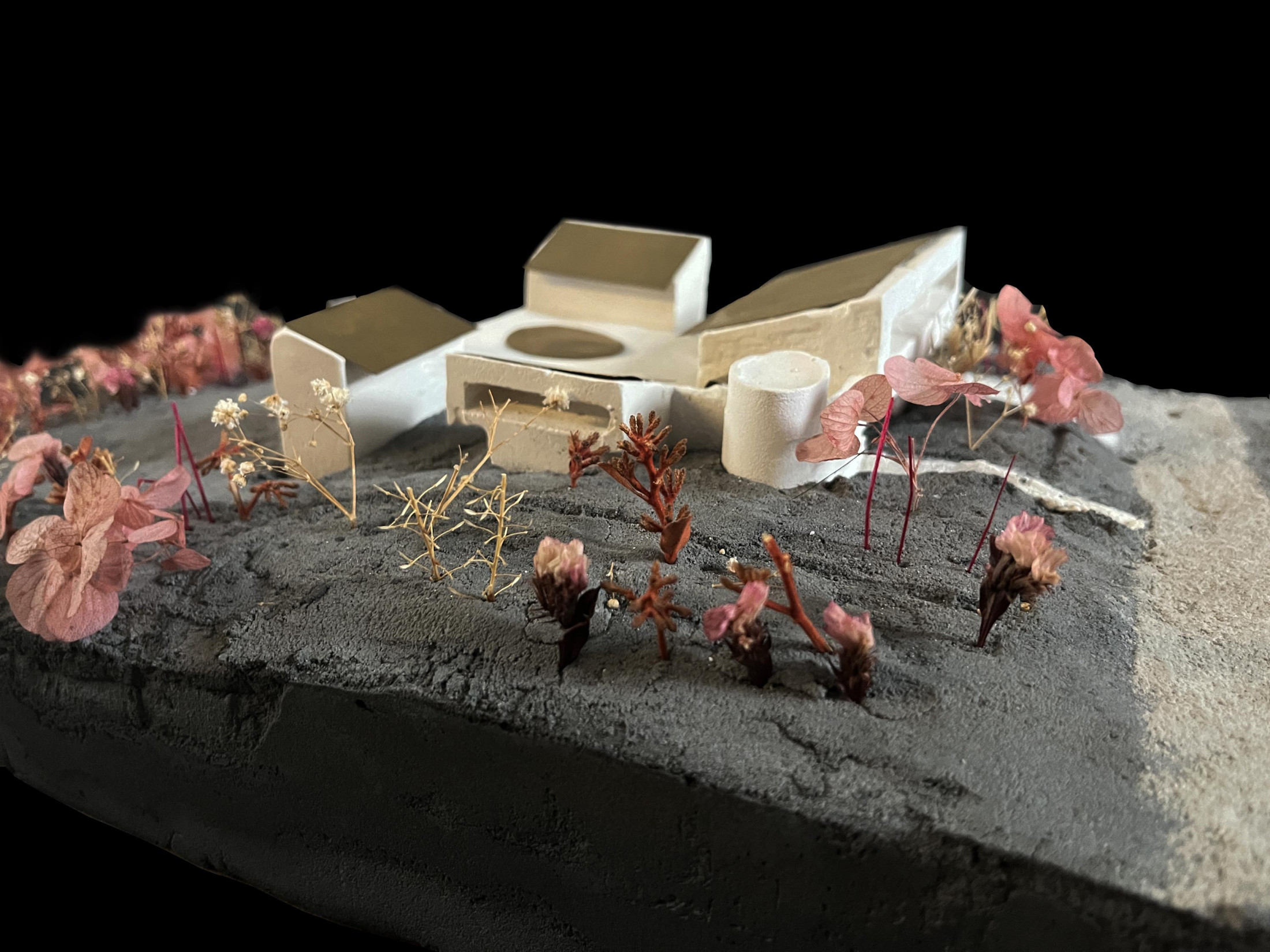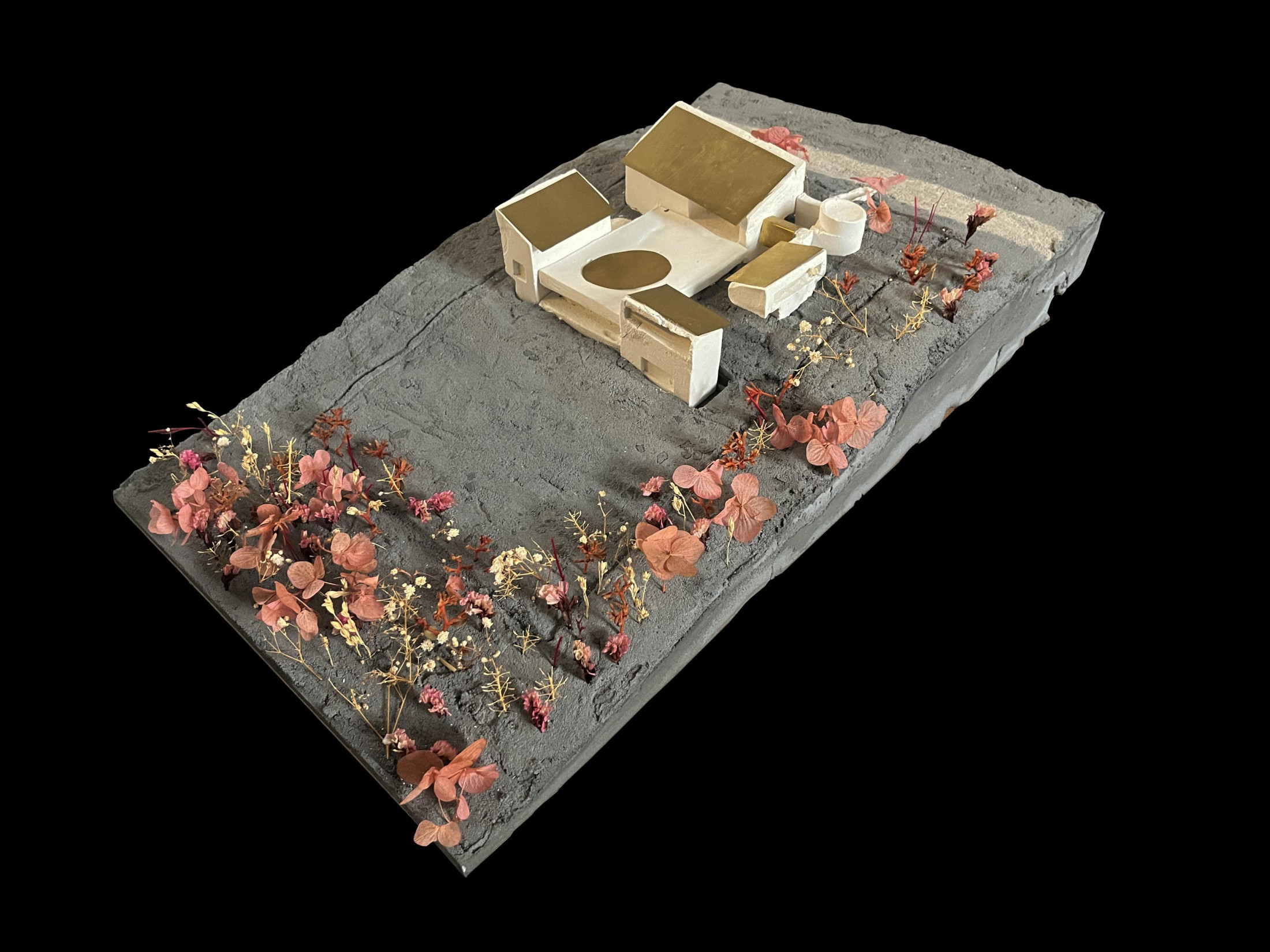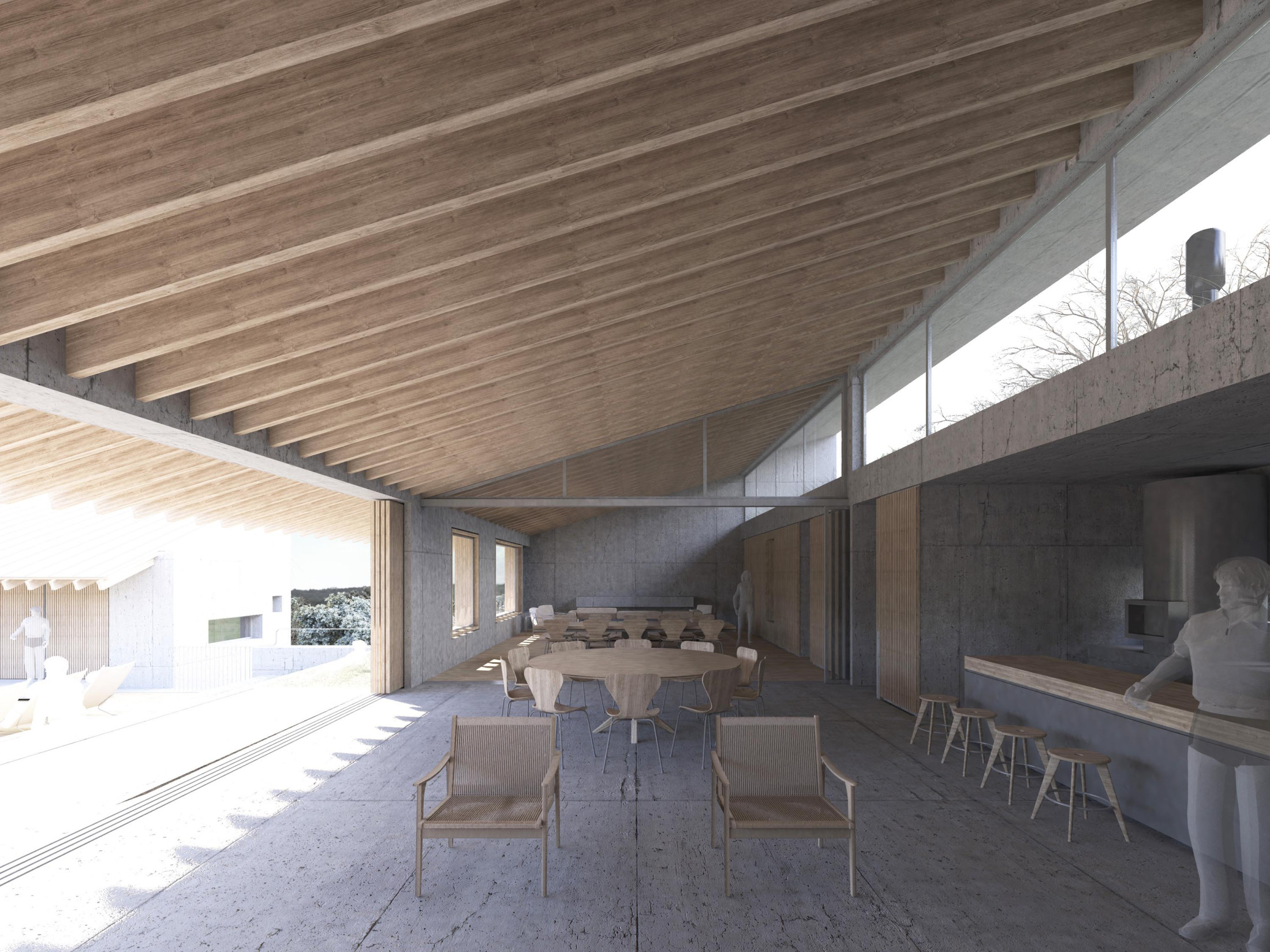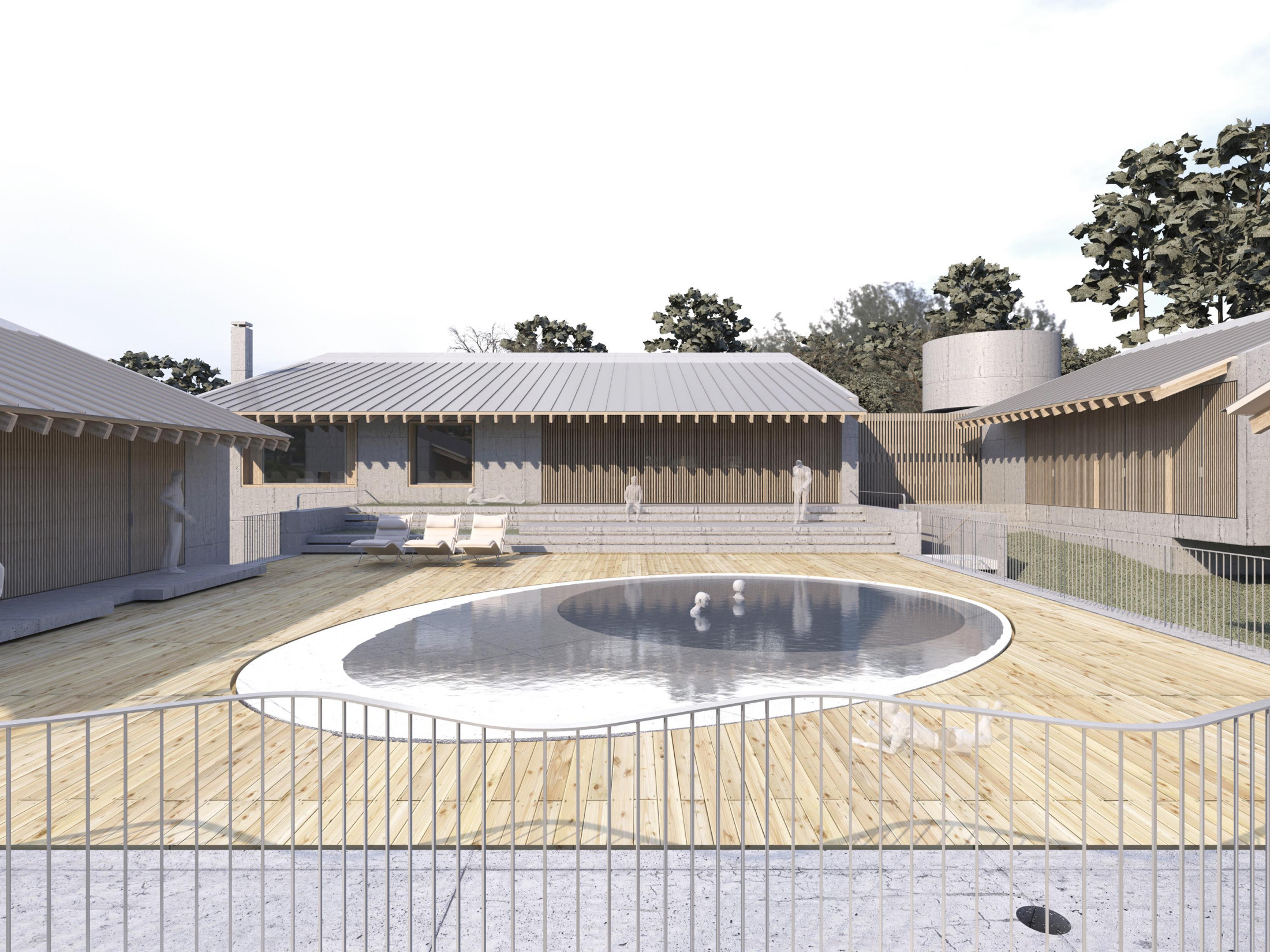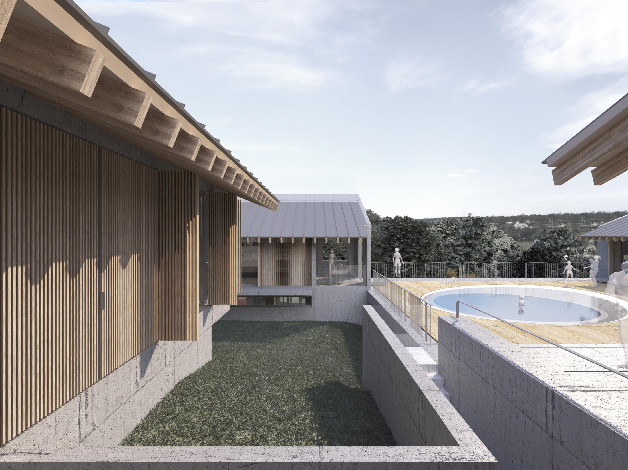 Conceiving a house is trying to pursue what it should always be: a temple to inhabit the universe – place of our experiences whose memories architecture registers in its matter. This house is idealized as a symbolic and poetic fortress made to remember us of the passing of time in our bodies and minds. From the human geometric order, it springs bursting its interior into a supreme enclosure: the central plaza – domestic agora – as a promontory open to the sky and landscape. Everything leads to it and radiates from it: hospitable gatherings and celebrations of a gregarious life sheltered in this village of gardens and constructions (central, couple, studies, guests and children). From the house typological imaginary, its volumes of concrete and wooden sloped roofs originate varied overhangs, porches and windows; and to enter this citadel, a cleft excavated through the frontal trees takes us inside the ground, where an indecipherable door reveals the mystic transition from the water patio to the vastness of the plaza and existing forest to which it opens itself. Thus, we create silence and calmness for a ludic contemplation of nature, time, day and night, in an everlasting pendulum between introspection and coexistence that value the indispensability of both to our well-being. Finally, we seek that its architecture becomes an enunciator of an ethics that reveals its many senses, meanings, secrets and fantasies through time. A house that, together with us, can grow up and age, aways guarding our permanence in the world.