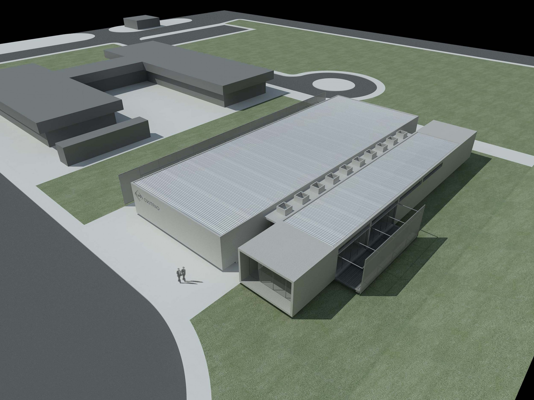 Situado em meio a um parque industrial, o edifício destinado a abrigar parte dos laboratórios da empresa Oxiteno se configura no terreno como duas barras paralelas unidas por uma circulação que, além de servir de acesso aos seus usos, também permite a transposição do lote através de seu interior iluminado zenitalmente. A principal e maior barra, definida como um volume hermético, abriga as salas operacionais dos laboratórios tendo como apoio uma faixa lateral aberta destinada a equipamentos e reservatórios de gases. A barra menor, iluminada por grandes aberturas em suas fachadas, contém os usos administrativos e de serviços.
