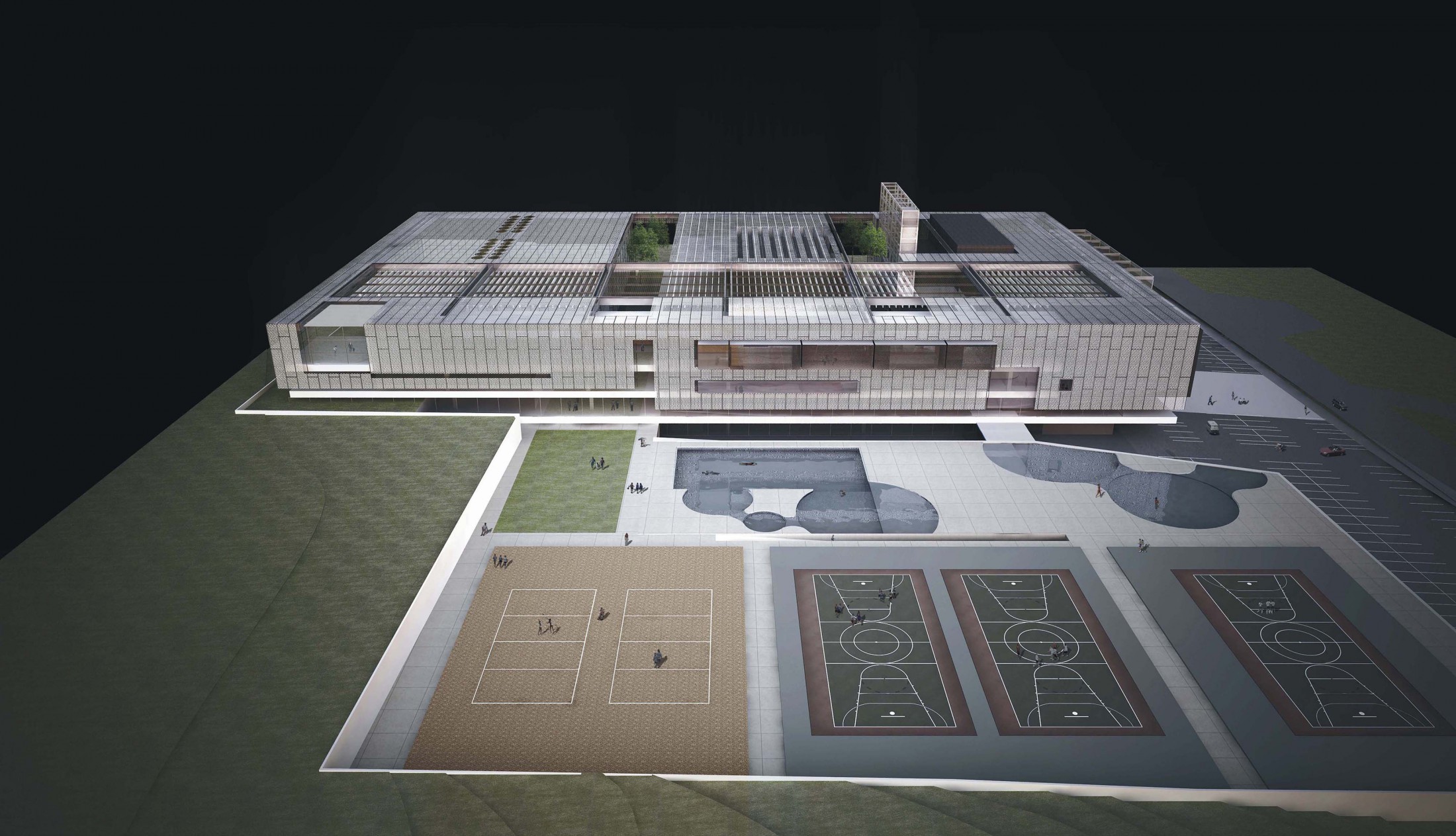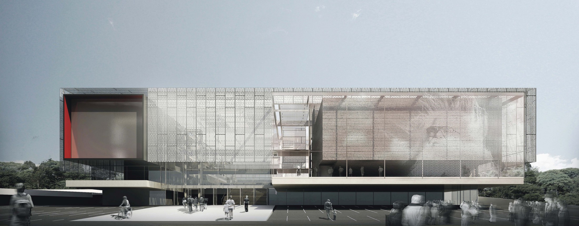 Um eixo de conexão entre rua e parque, uma condição a partir da qual a implantação e os vetores de distribuição de todas as múltiplas funções do complexo se articulam. O partido arquitetônico determina a construção de um edifício em duas faixas paralelas que se desenvolvem no sentido da profundidade do terreno, gerando uma praça coberta de altura integral entre elas. Esta praça assume diversas funções ao longo do percurso através do edifício: primeiramente como saguão de entrada principal conectado à rua Guilherme Lino dos Santos, num segundo momento como praça interna no nível principal (759.50) e finalmente como acesso em nível com o Parque Vicente Leporace, para o qual pretende-se que o SESC seja um indutor de transformações ao longo do tempo. A Praça é o espaço central do complexo arquitetônico. É espaço de encontro e espaço de estar. Sem programa definido, acolhe o livre uso do frequentador, em seus bancos, escadas e múltiplas áreas de permanência. Todos os itens do programa se relacionam com este espaço, inclusive as áreas externas em função da transparência do restaurante social e do próprio edifício, que de maneira sutil revela os fluxos e usos em seu interior através da envoltória translúcida.