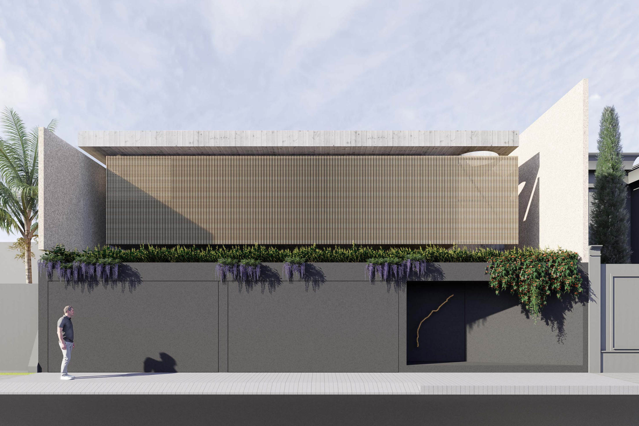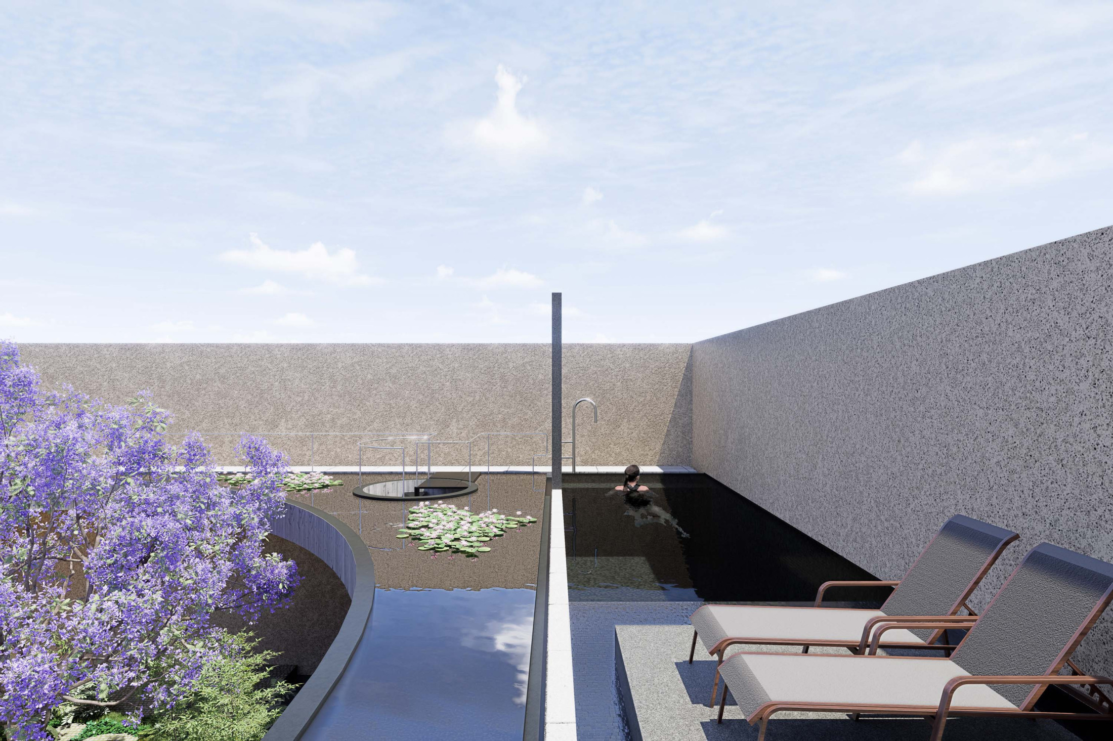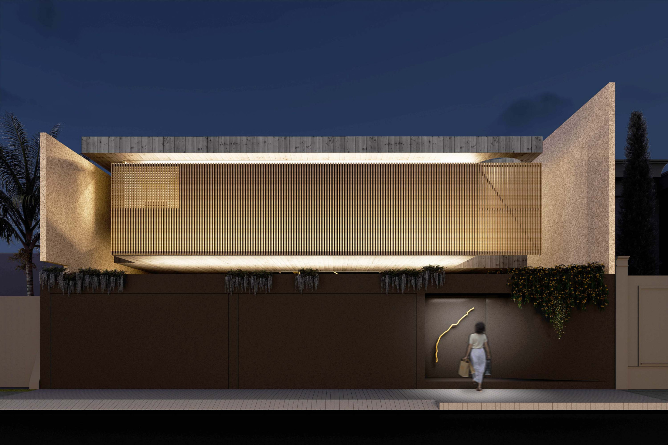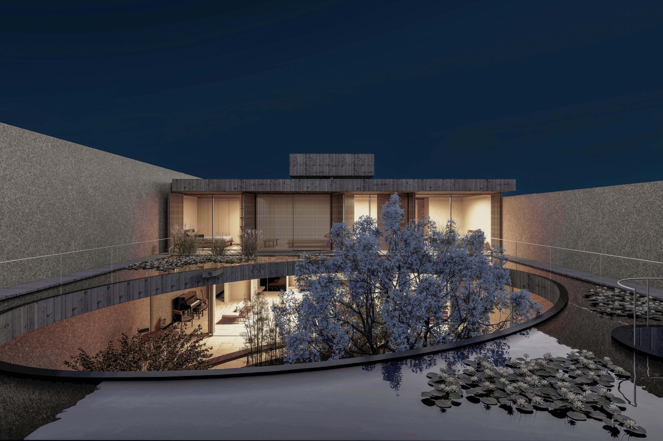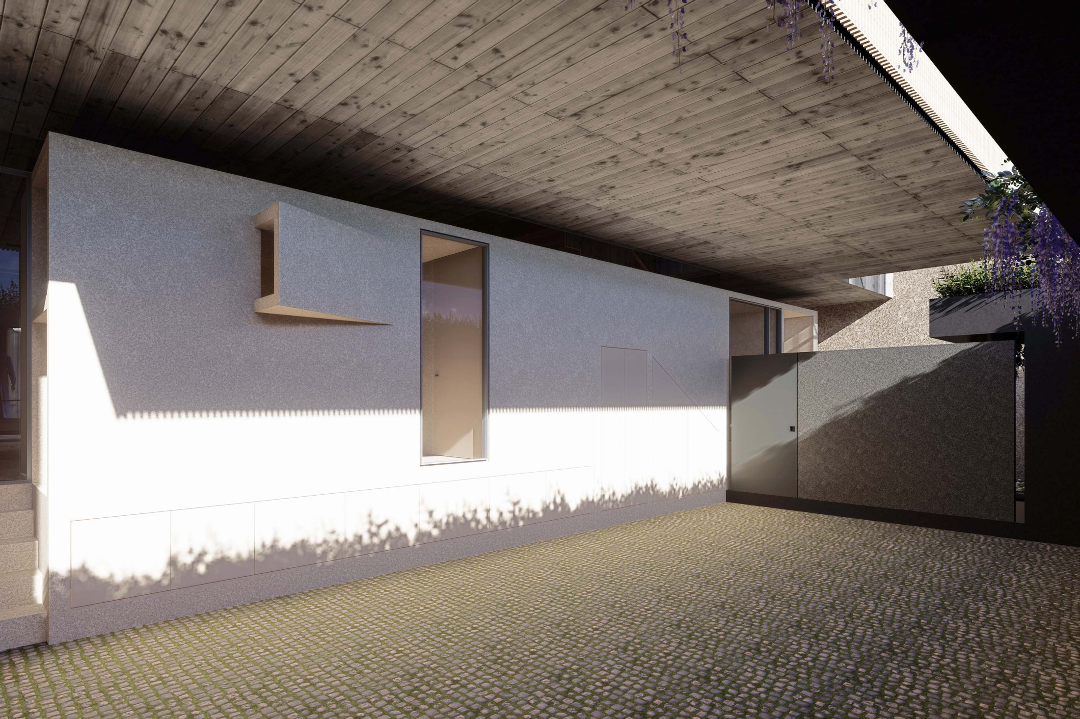 Quando não há o que se olhar do lado de fora, a casa volta para si mesma. Em um ímpeto introspectivo em relação à cidade, os espaços vazios suscitam a diversa gama de dinâmicas da família, em seus vários momentos, em suas muitas composições. Uma casa deve ser uma expressão singela da alma. O percurso, a morada da experiência. Os recintos, dos afetos. Nascida de um terreno pouco iluminado, a casa emerge sobre um platô que se eleva em relação à cota da rua, uma insurgência pela conquista do sol. Movimento cujo epicentro é um pátio-jardim, pelo qual buscamos articular de maneira harmoniosa e flexível a complexidade de um programa que concentrasse a pluralidade de acontecimentos cotidianos e especiais (extra cotidianos?) de forma compacta e funcional. Com algumas visuais tímidas para a rua, protegidas por uma pele vazada que preenche de ponta à ponta a projeção do andar superior, os olhos se voltam para um espelho d´água que em um primeiro momento, age como extensão da varanda dos quartos, até se abrir e delinear o caminho da luz natural para chegar ao pátio-jardim, finalmente dando lugar à piscina, sem delimitar uma fronteira. Pensando em não ofuscar esta circunstância global única de lar, os materiais foram pensados como singelas superfícies, com a única pretensão de diferenciar planos horizontais e verticais. Desta forma, a casa surge na cidade como um acontecimento silencioso, cuja potência e intensidade se dão de dentro para fora.
