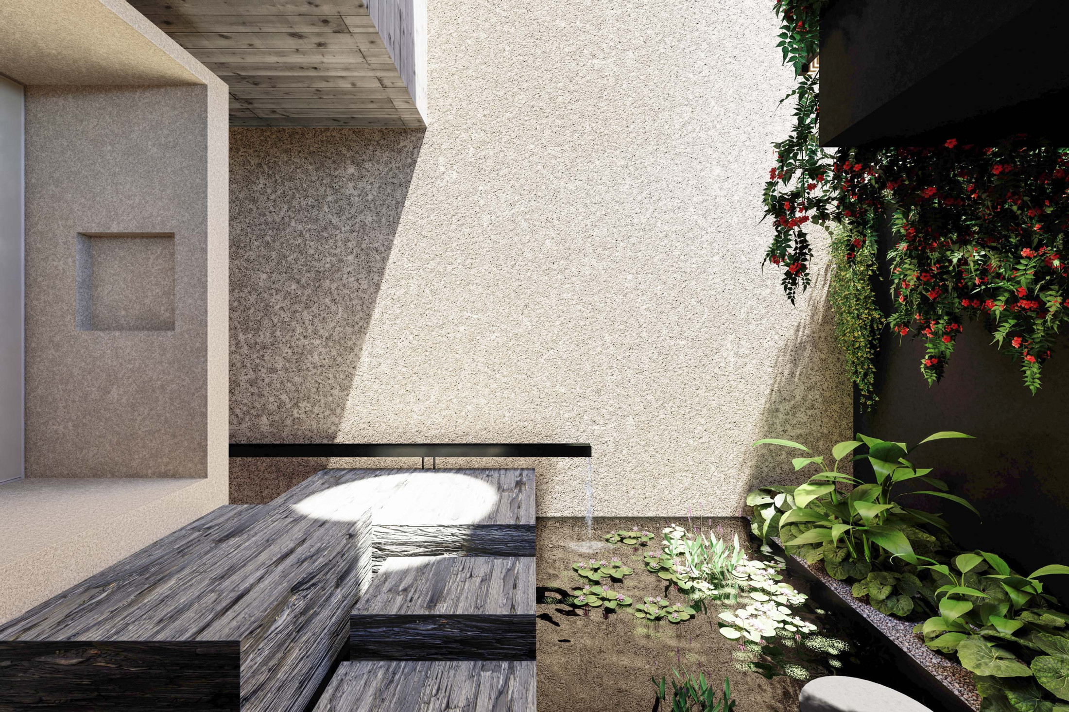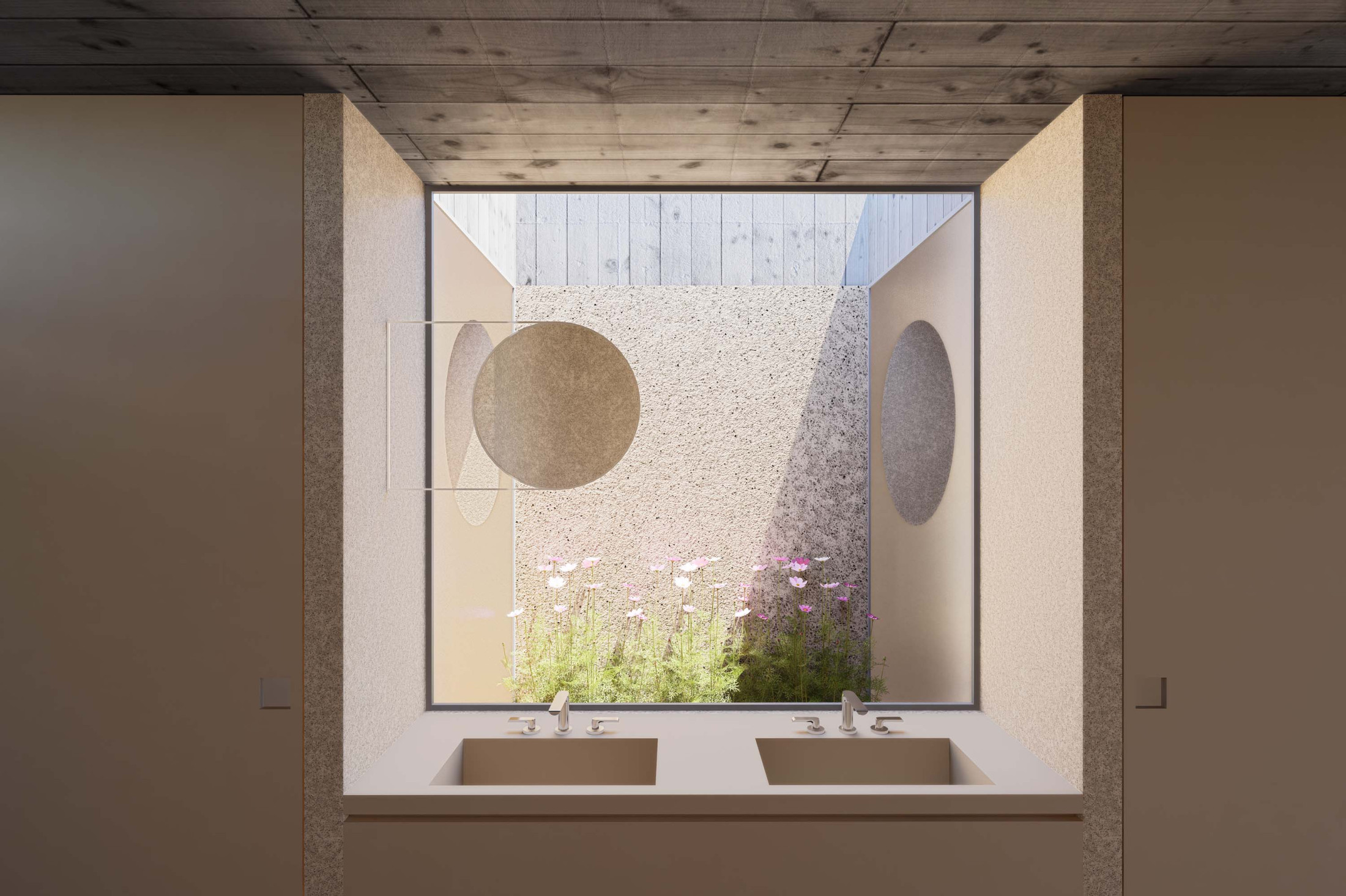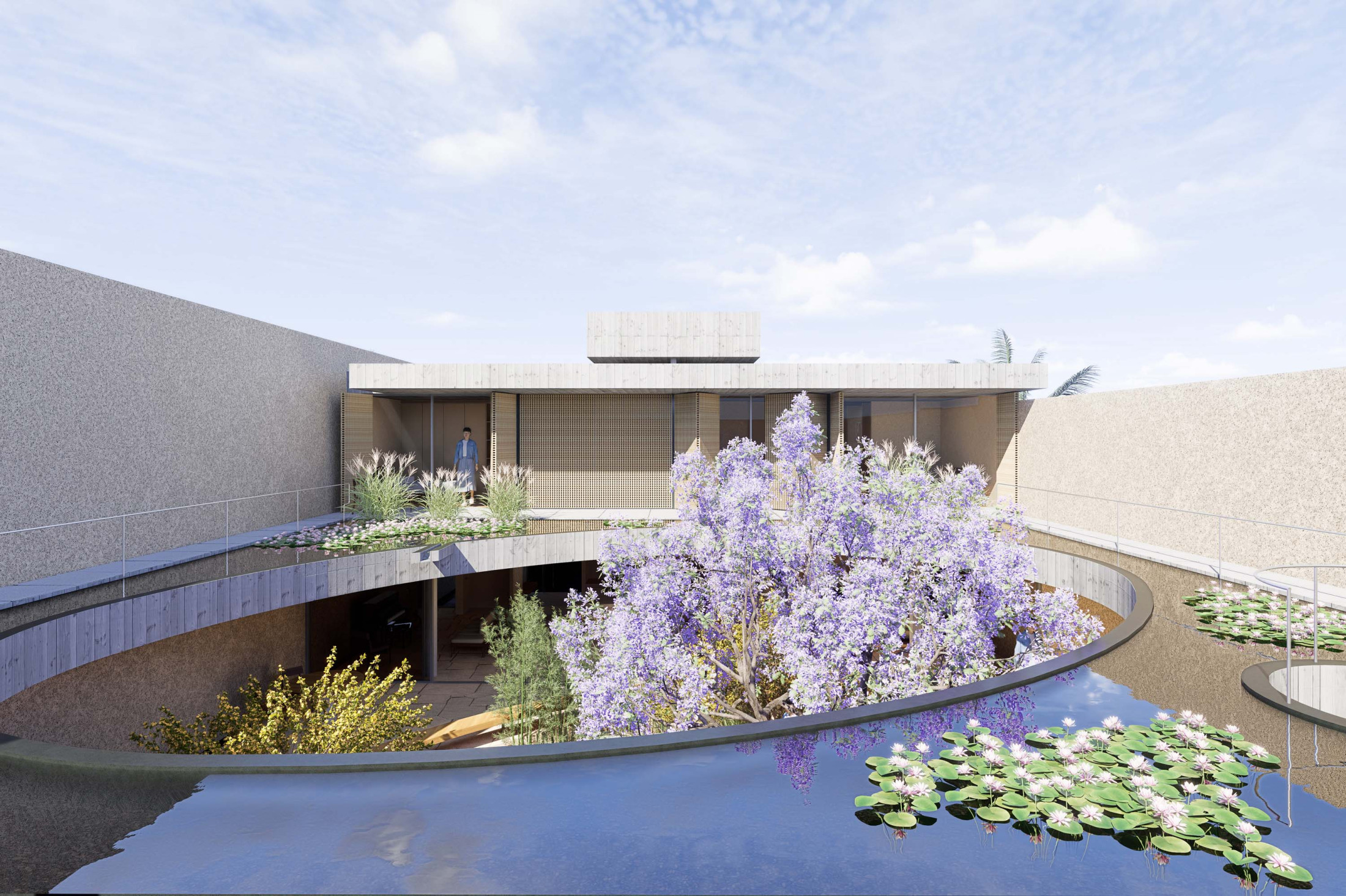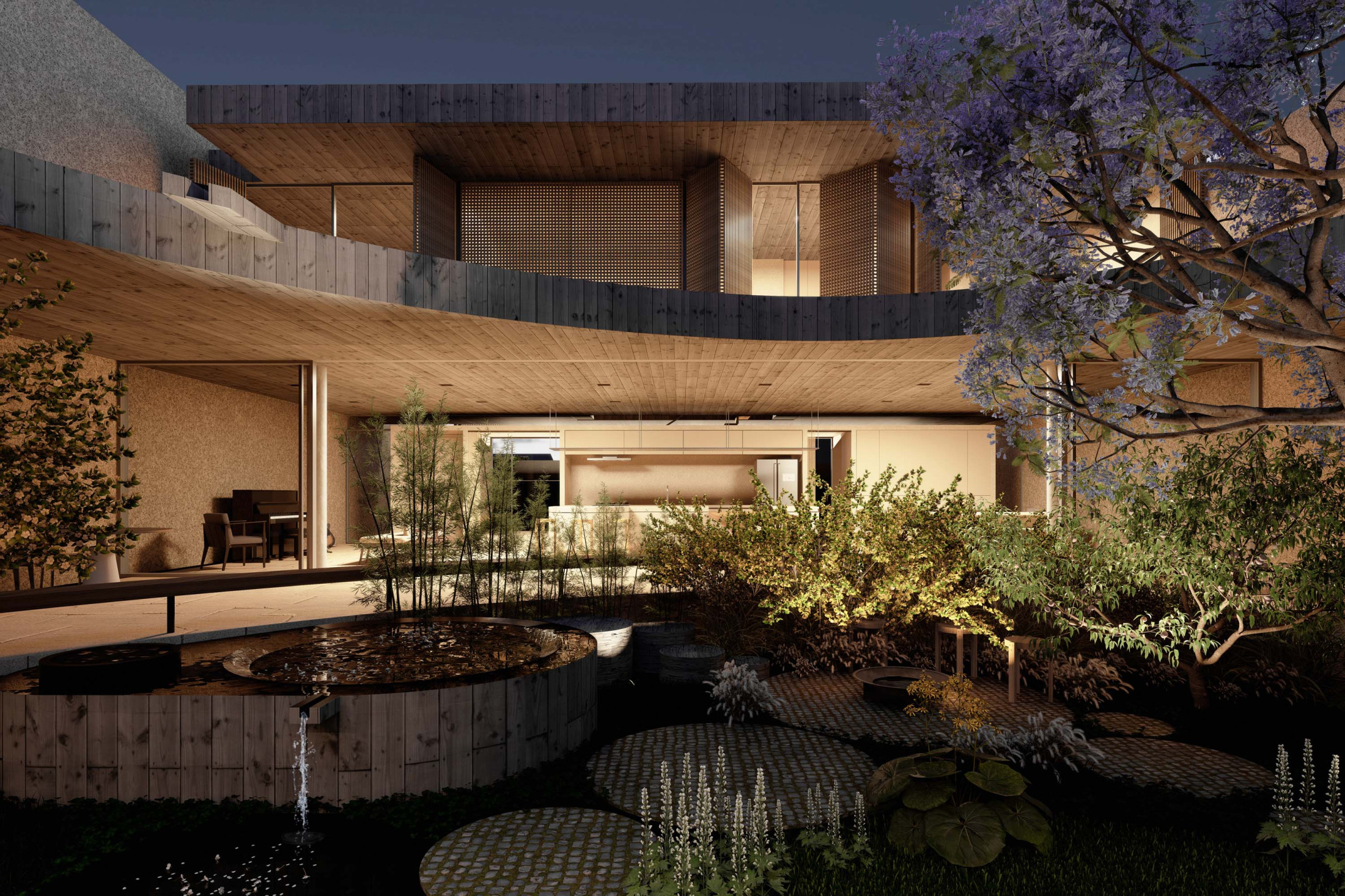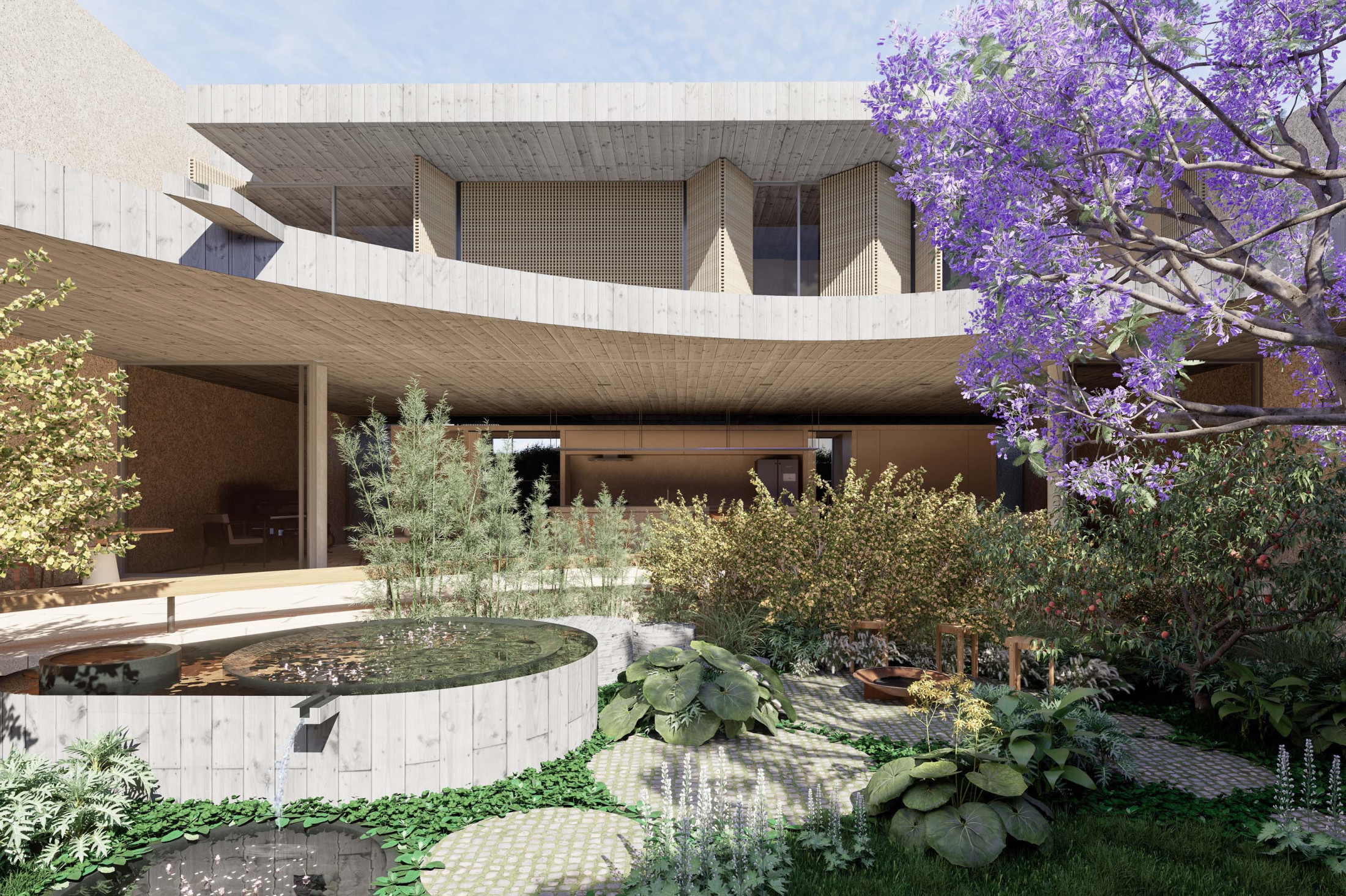 Quando não há o que se olhar do lado de fora, a casa volta para si mesma. Em um ímpeto introspectivo em relação à cidade, os espaços vazios suscitam a diversa gama de dinâmicas da família, em seus vários momentos, em suas muitas composições. Uma casa deve ser uma expressão singela da alma. O percurso, a morada da experiência. Os recintos, dos afetos. Nascida de um terreno pouco iluminado, a casa emerge sobre um platô que se eleva em relação à cota da rua, uma insurgência pela conquista do sol. Movimento cujo epicentro é um pátio-jardim, pelo qual buscamos articular de maneira harmoniosa e flexível a complexidade de um programa que concentrasse a pluralidade de acontecimentos cotidianos e especiais (extra cotidianos?) de forma compacta e funcional. Com algumas visuais tímidas para a rua, protegidas por uma pele vazada que preenche de ponta à ponta a projeção do andar superior, os olhos se voltam para um espelho d´água que em um primeiro momento, age como extensão da varanda dos quartos, até se abrir e delinear o caminho da luz natural para chegar ao pátio-jardim, finalmente dando lugar à piscina, sem delimitar uma fronteira. Pensando em não ofuscar esta circunstância global única de lar, os materiais foram pensados como singelas superfícies, com a única pretensão de diferenciar planos horizontais e verticais. Desta forma, a casa surge na cidade como um acontecimento silencioso, cuja potência e intensidade se dão de dentro para fora.