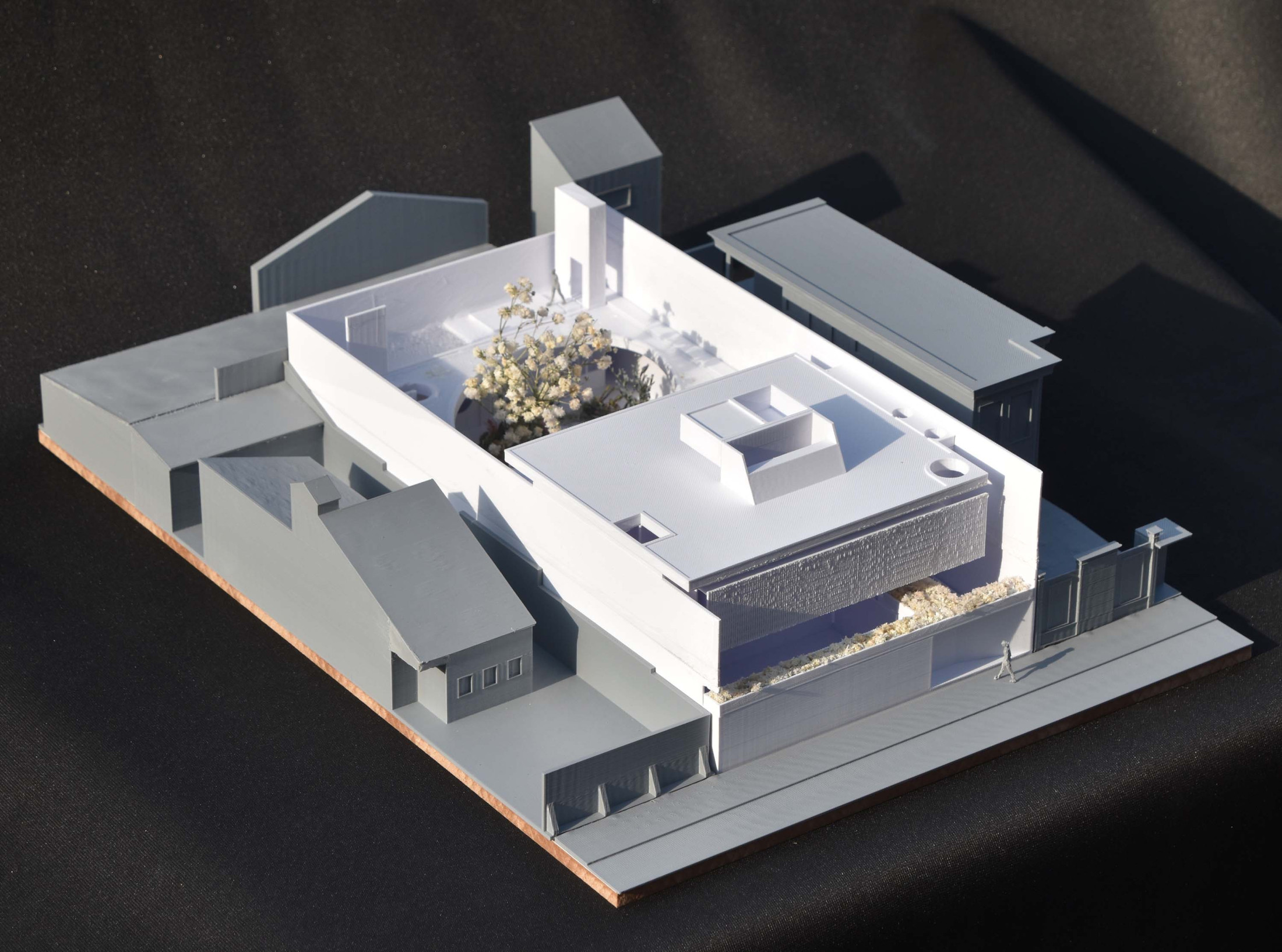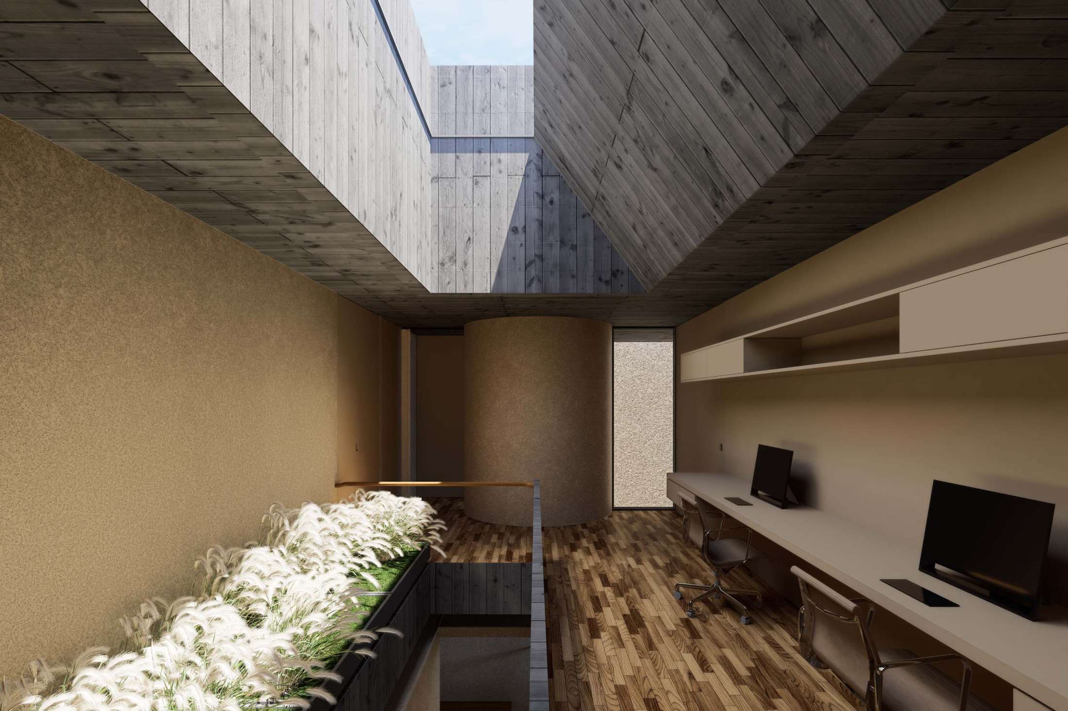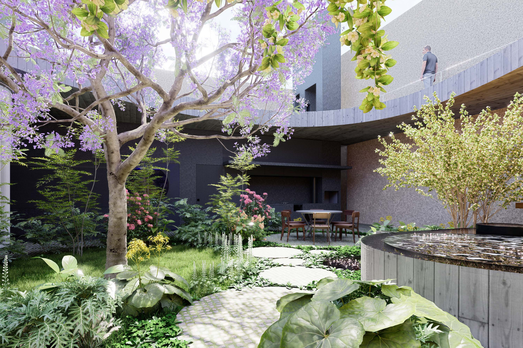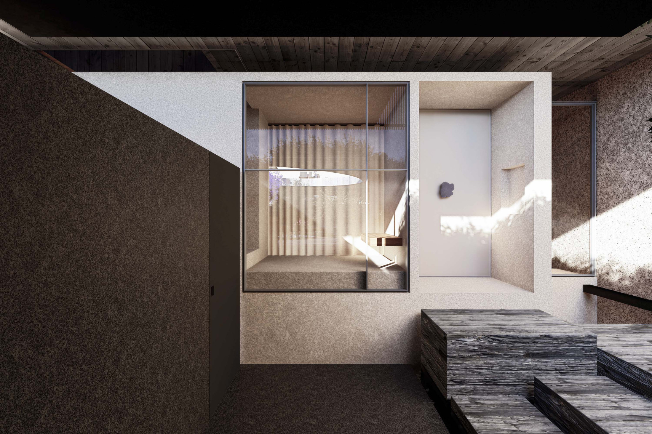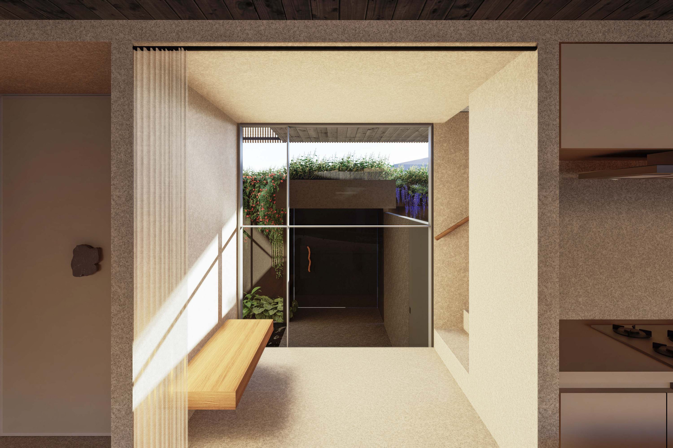 Quando não há o que se olhar do lado de fora, a casa volta para si mesma. Em um ímpeto introspectivo em relação à cidade, os espaços vazios suscitam a diversa gama de dinâmicas da família, em seus vários momentos, em suas muitas composições. Uma casa deve ser uma expressão singela da alma. O percurso, a morada da experiência. Os recintos, dos afetos. Nascida de um terreno pouco iluminado, a casa emerge sobre um platô que se eleva em relação à cota da rua, uma insurgência pela conquista do sol. Movimento cujo epicentro é um pátio-jardim, pelo qual buscamos articular de maneira harmoniosa e flexível a complexidade de um programa que concentrasse a pluralidade de acontecimentos cotidianos e especiais (extra cotidianos?) de forma compacta e funcional. Com algumas visuais tímidas para a rua, protegidas por uma pele vazada que preenche de ponta à ponta a projeção do andar superior, os olhos se voltam para um espelho d´água que em um primeiro momento, age como extensão da varanda dos quartos, até se abrir e delinear o caminho da luz natural para chegar ao pátio-jardim, finalmente dando lugar à piscina, sem delimitar uma fronteira. Pensando em não ofuscar esta circunstância global única de lar, os materiais foram pensados como singelas superfícies, com a única pretensão de diferenciar planos horizontais e verticais. Desta forma, a casa surge na cidade como um acontecimento silencioso, cuja potência e intensidade se dão de dentro para fora.