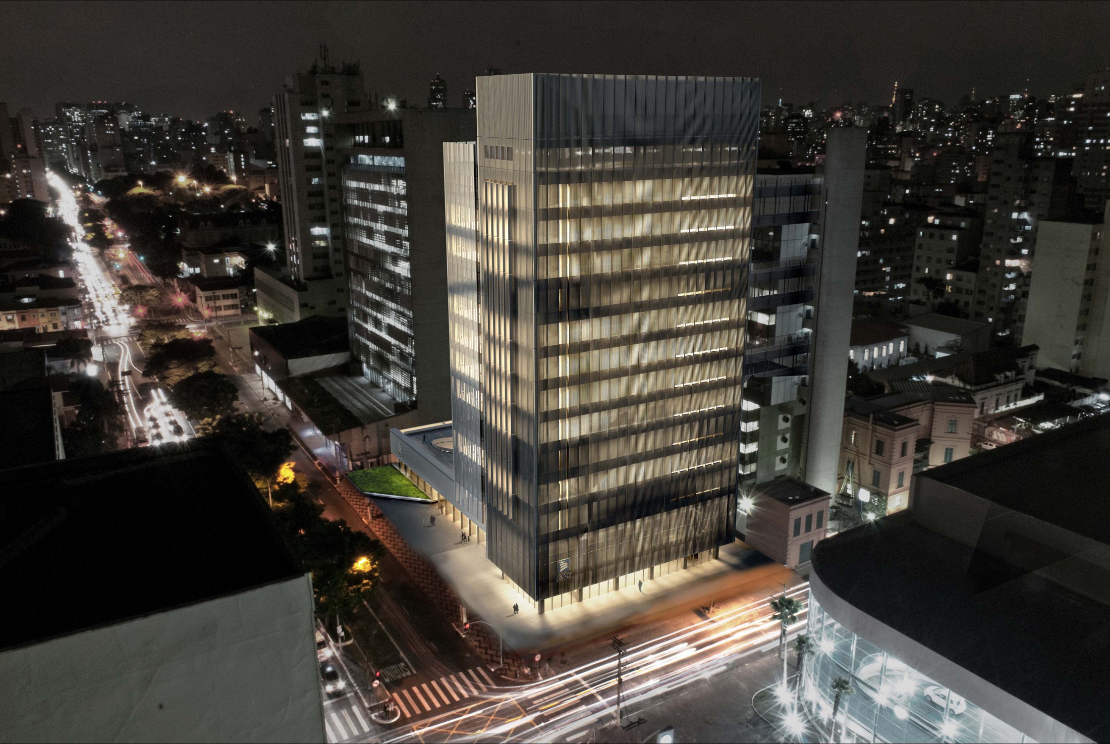 Diante da importância da instituição abrigada e de sua localização na cidade, o Novo Edifício Corretores Rio Branco, não poderia ser definido pela criação de uma simples construção, mas pela inauguração de um novo lugar. Assim, a proposta se estabelece primeiramente como um marco urbano na paisagem de São Paulo e, também, como um espaço capaz de acolher os seus cidadãos em generosos ambientes de convívio. Definido pela Avenida Rio Branco, Alameda Ribeiro da Silva e pelas construções vizinhas, o projeto propõe a criação de uma paisagem no interior do terreno, aproximando a cidade ao complexo da Porto Seguro e valorizando a história do bairro Campos Elísios.