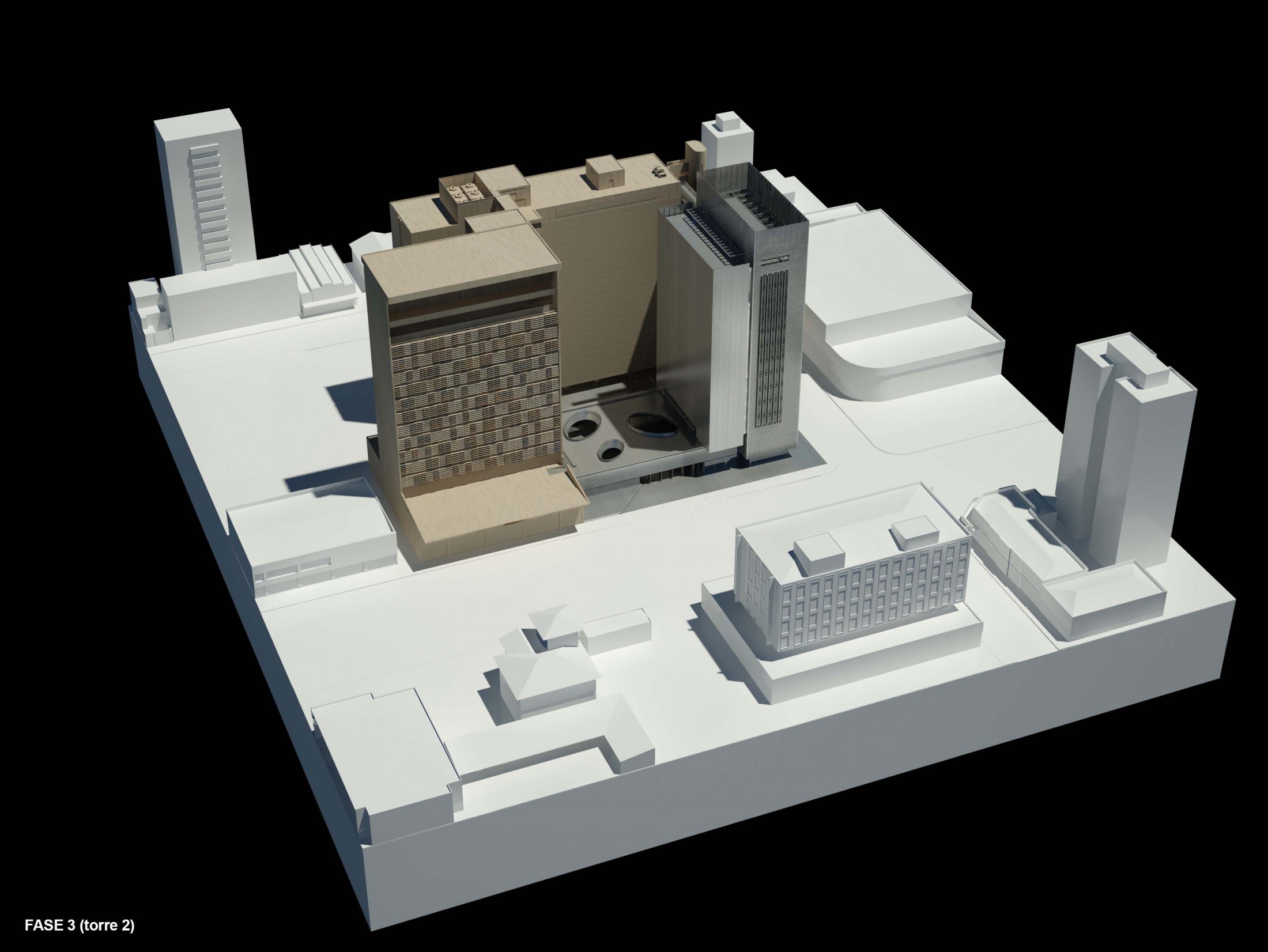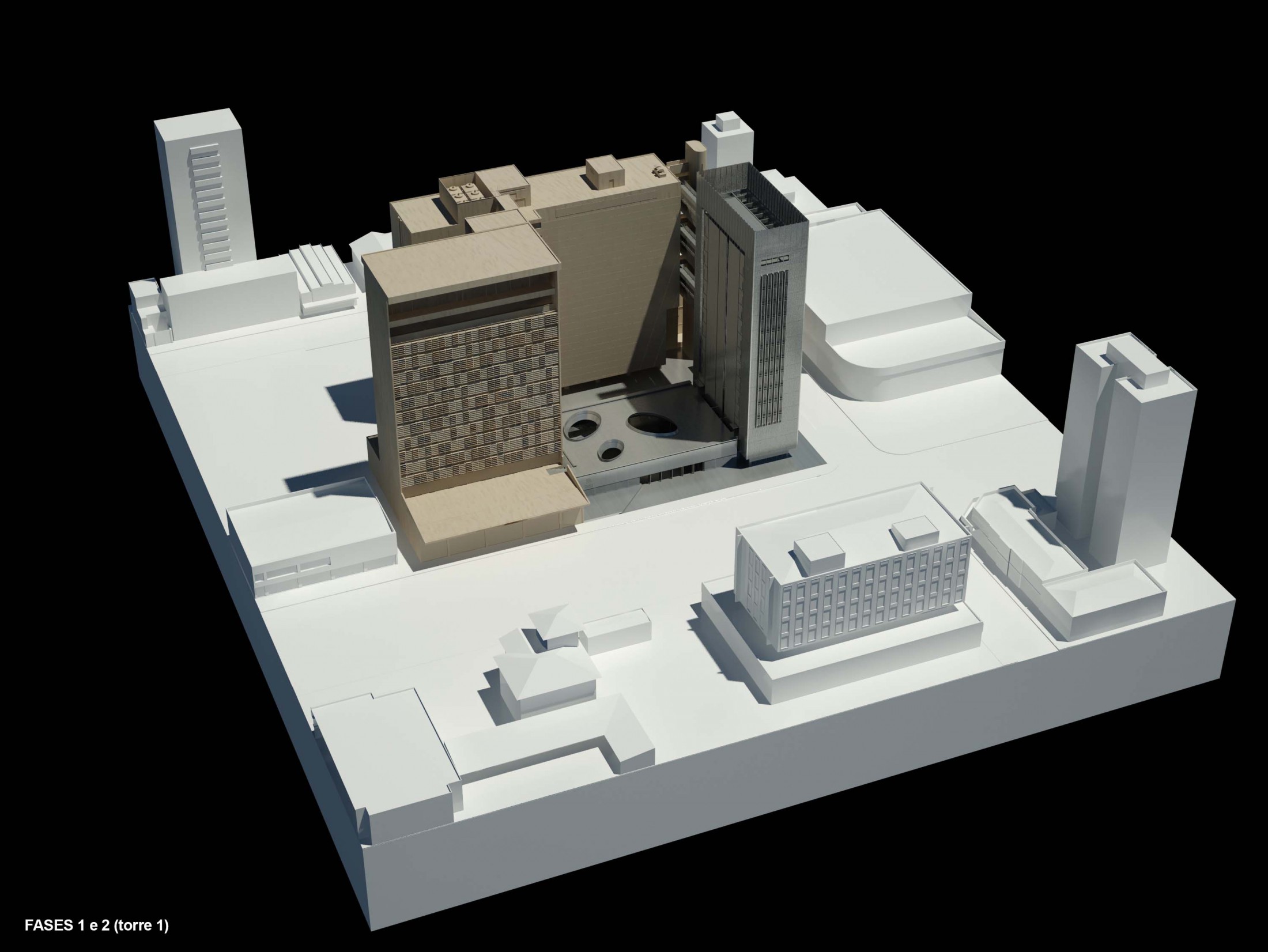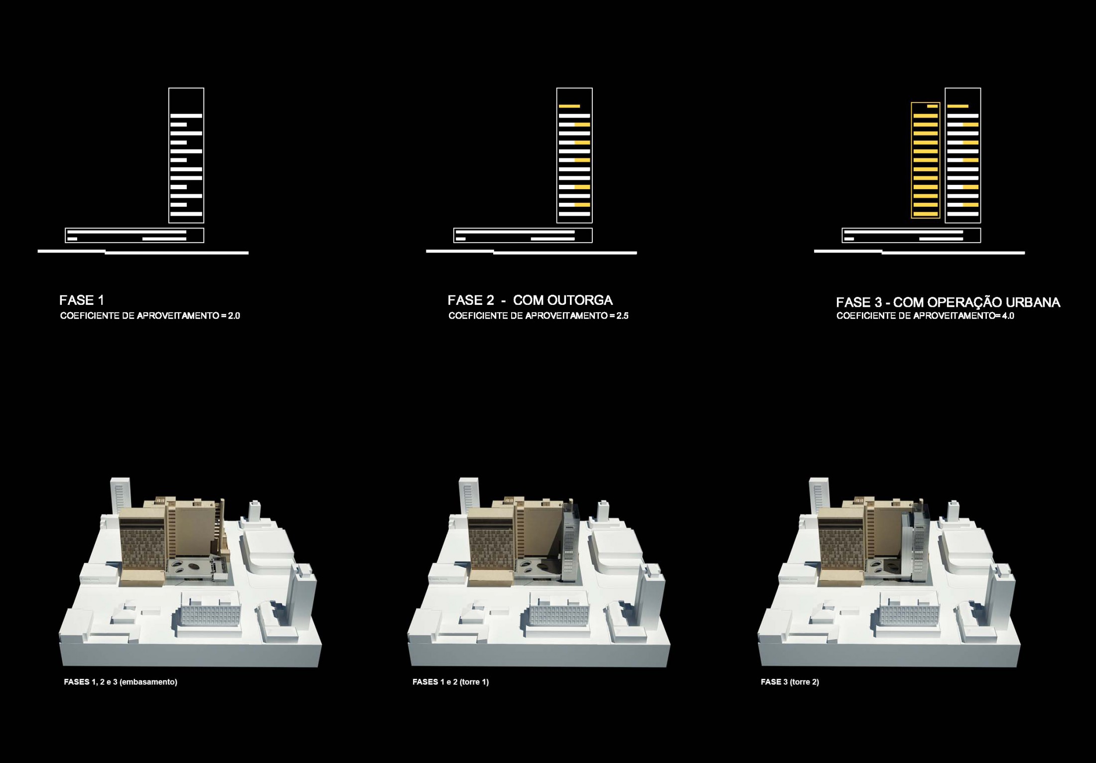 Fase 2 - Esta fase poderia ser realizada junto à primeira e segundo a disponibilidade de outorga onerosa, elevando até 2.5 o coeficiente de aproveitamento. No entanto, caso isto venha a ser realizado posteriormente, o processo construtivo foi pensado para permitir o acréscimo de lajes nos vazios do edifício 1, aumentando sua superfície construída.