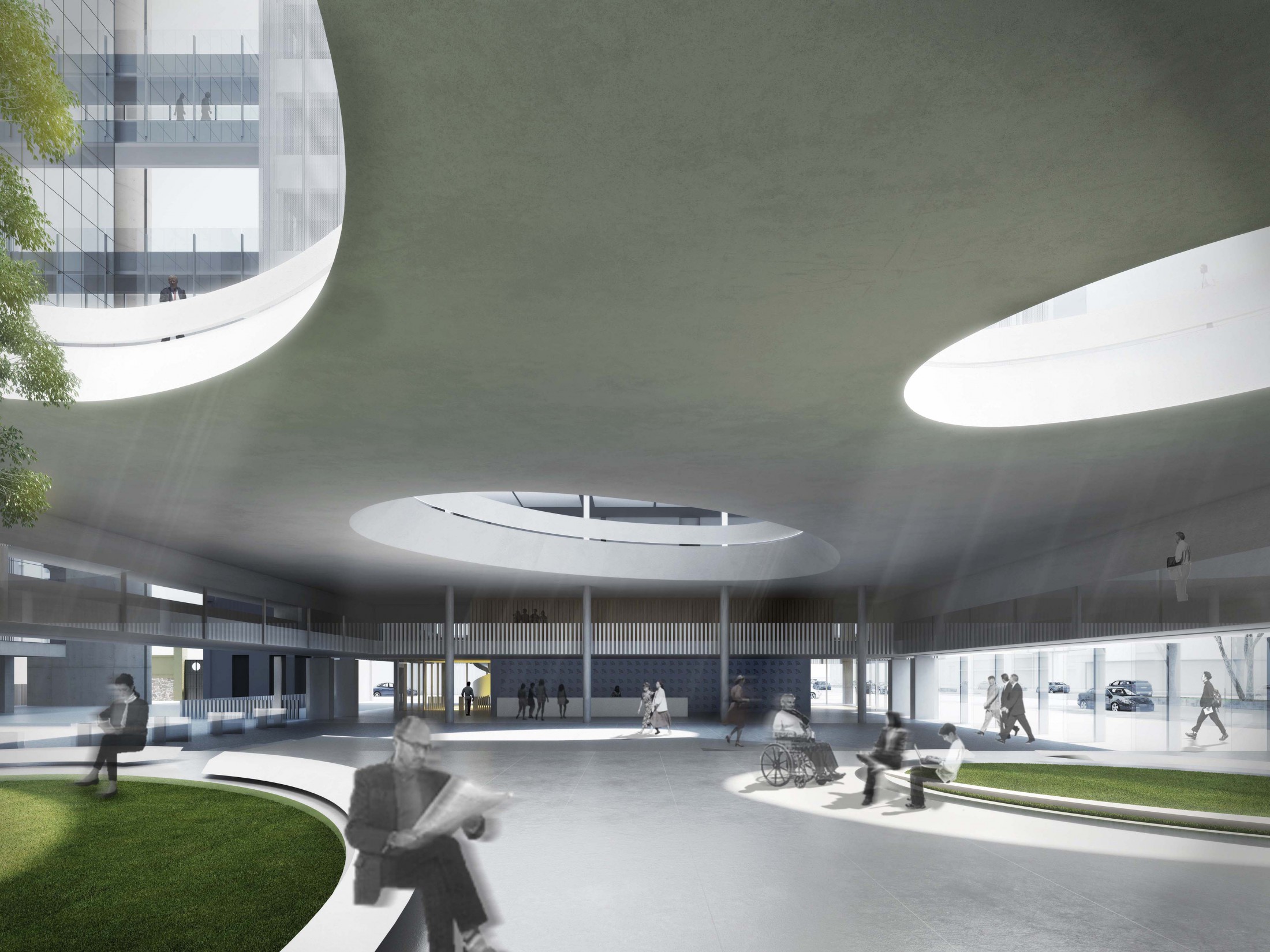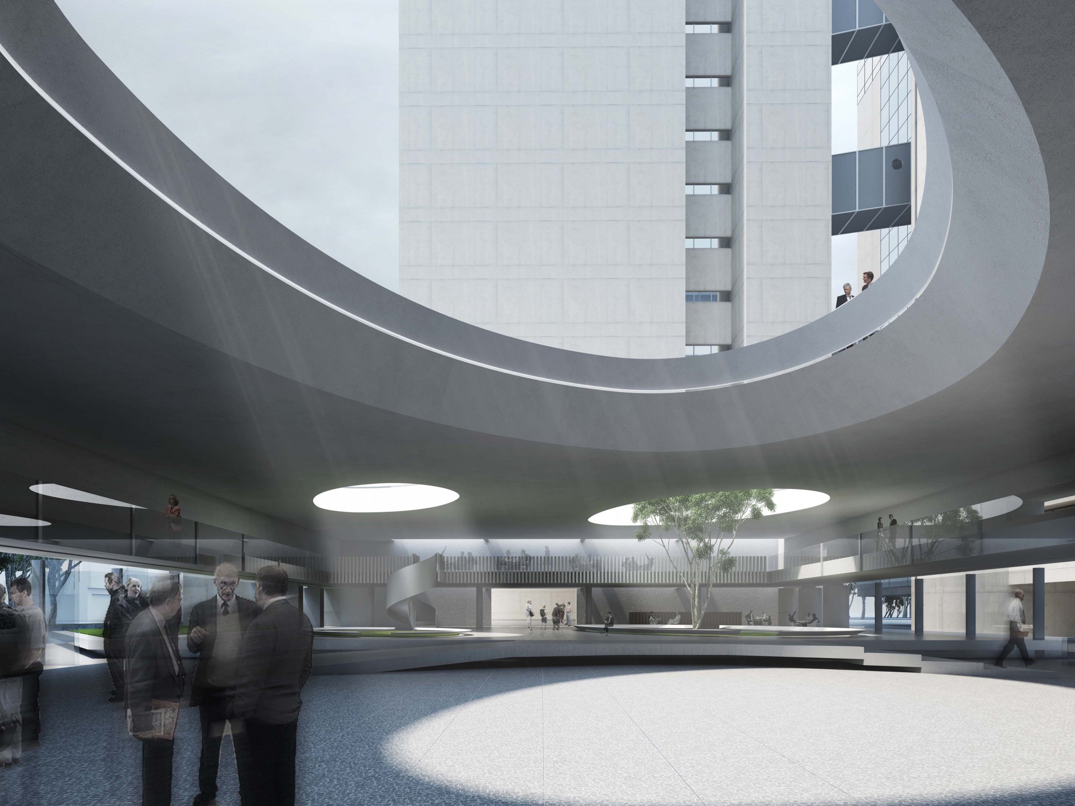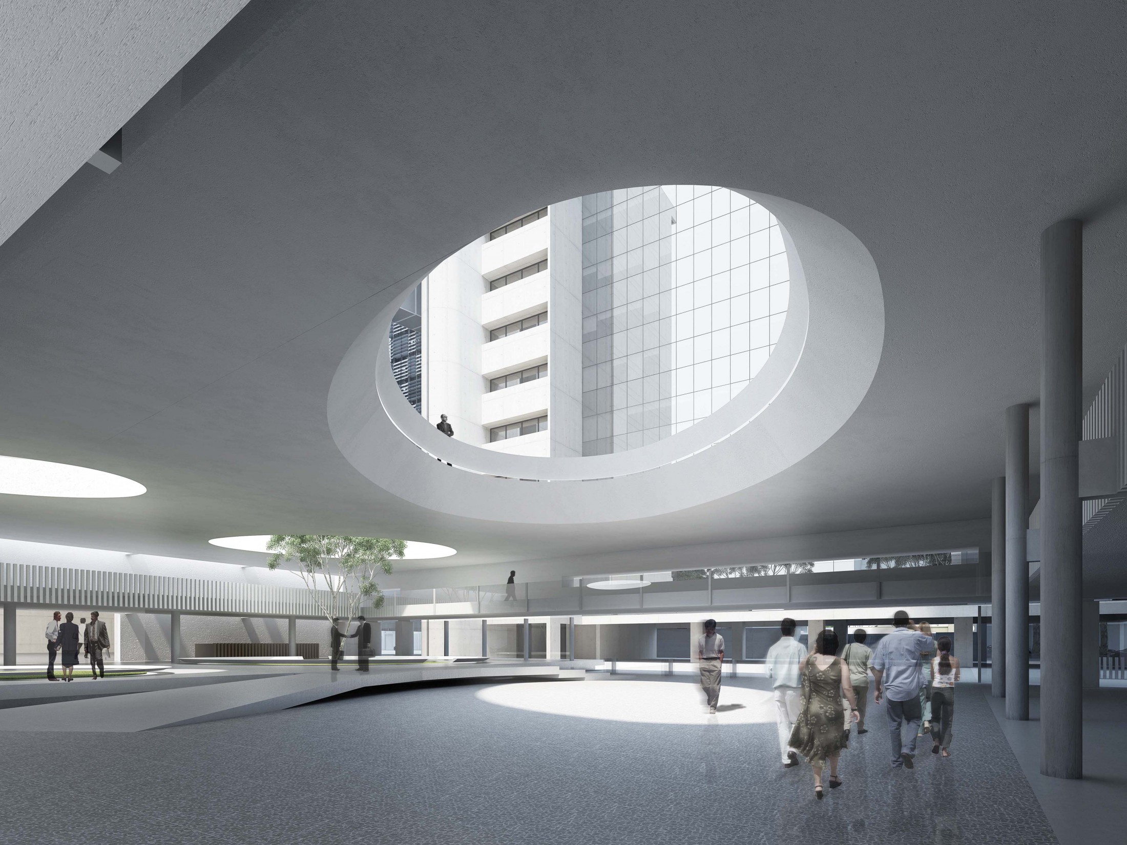 Esta centralidade do espaço público se consolida na praça interna de grandes proporções que qualifica o espaço e seu entorno como uma paisagem definida pela pausa, pelo vazio, responsável por integrar e articular as intenções daqueles que por ela circulam: um espaço onde a cada um é apresentada a oportunidade do encontro. A praça é o lugar simbólico do conjunto, que a descobrem através de um expressivo percurso caminhando por baixo da grande lâmina horizontal que constitui o embasamento do edifício até alcançarem o espaço central. Nela se descobre uma variedade de espacialidades e impressões, um espaço lúdico trabalhado arquitetonicamente através da plasticidade de suas aberturas zenitais que trazem ao seu interior um espetáculo intenso e poético da presença da luz.