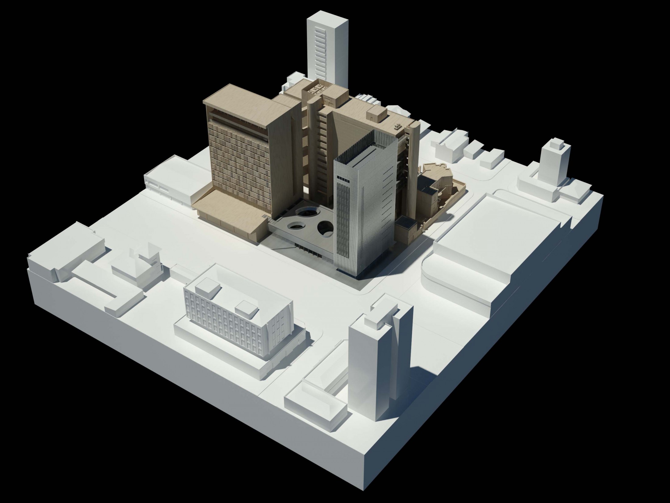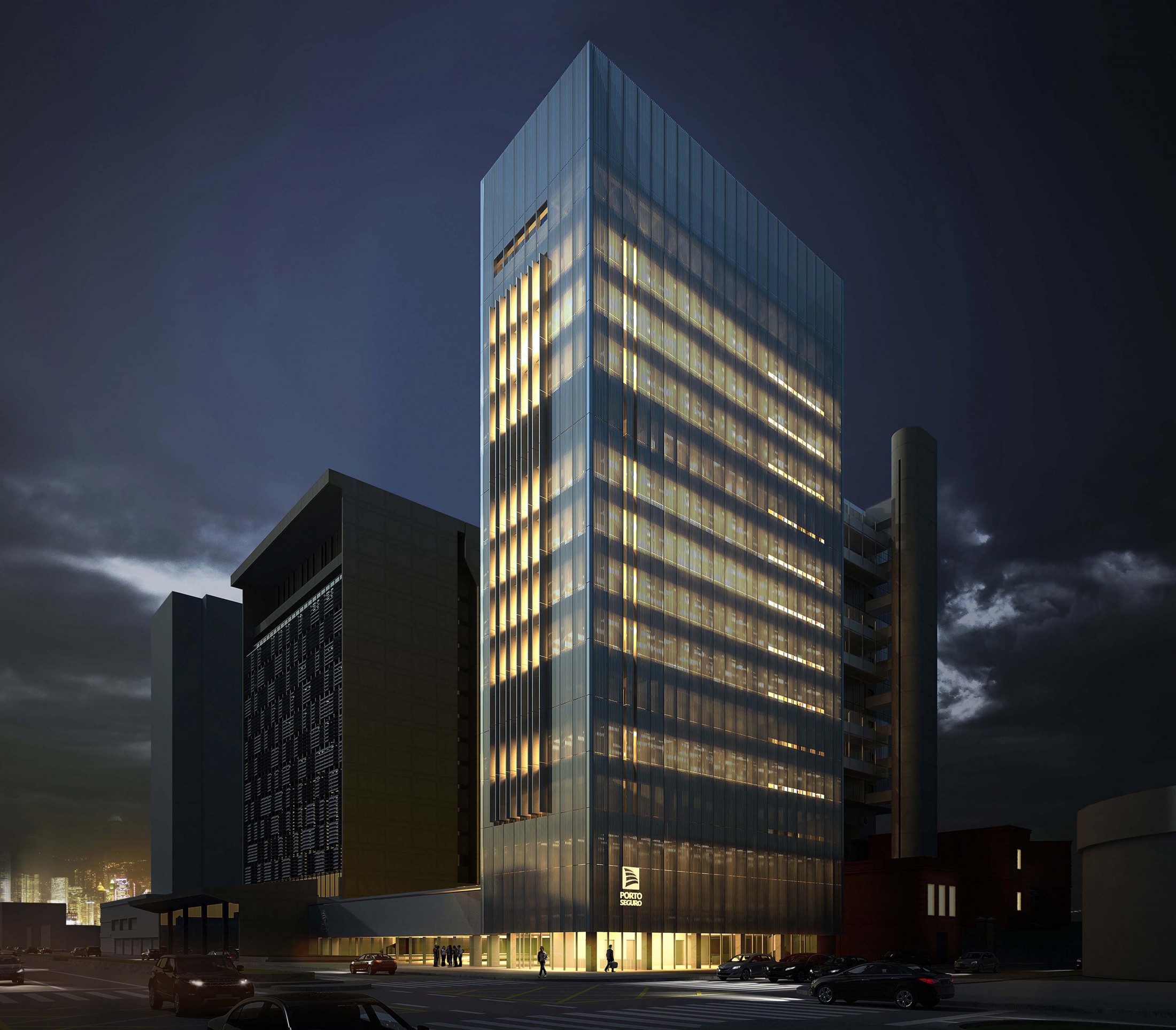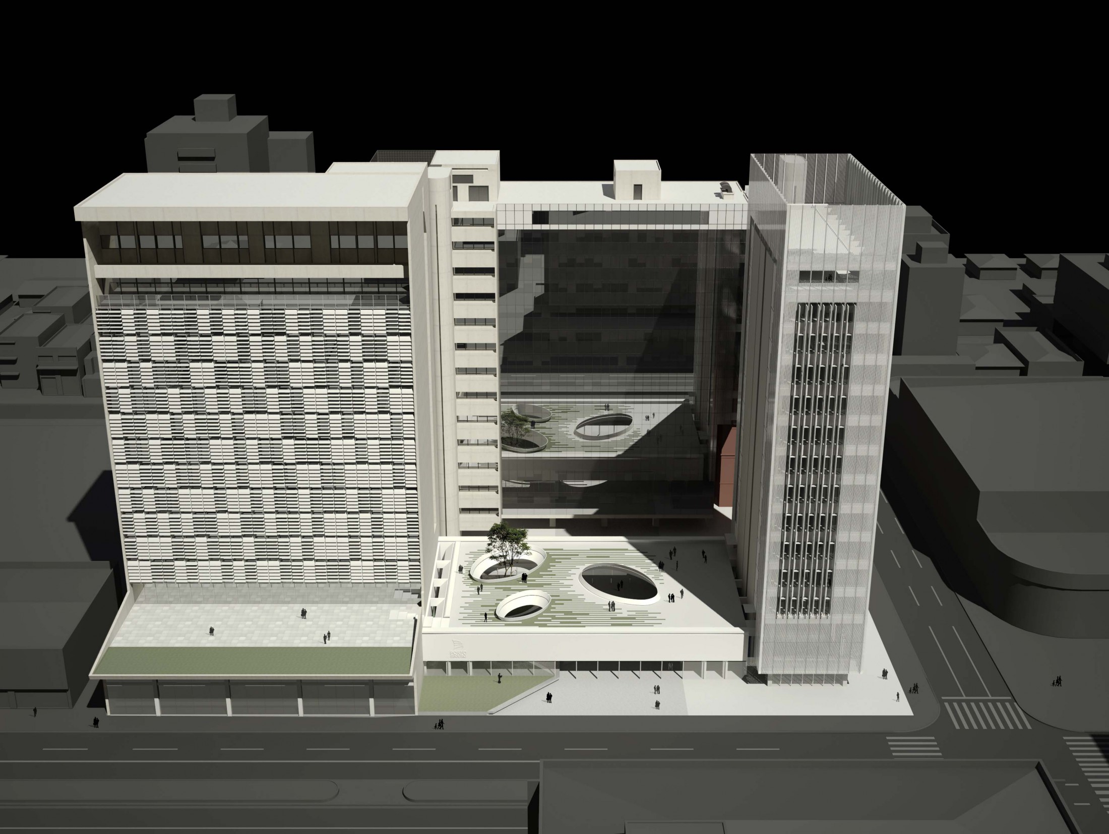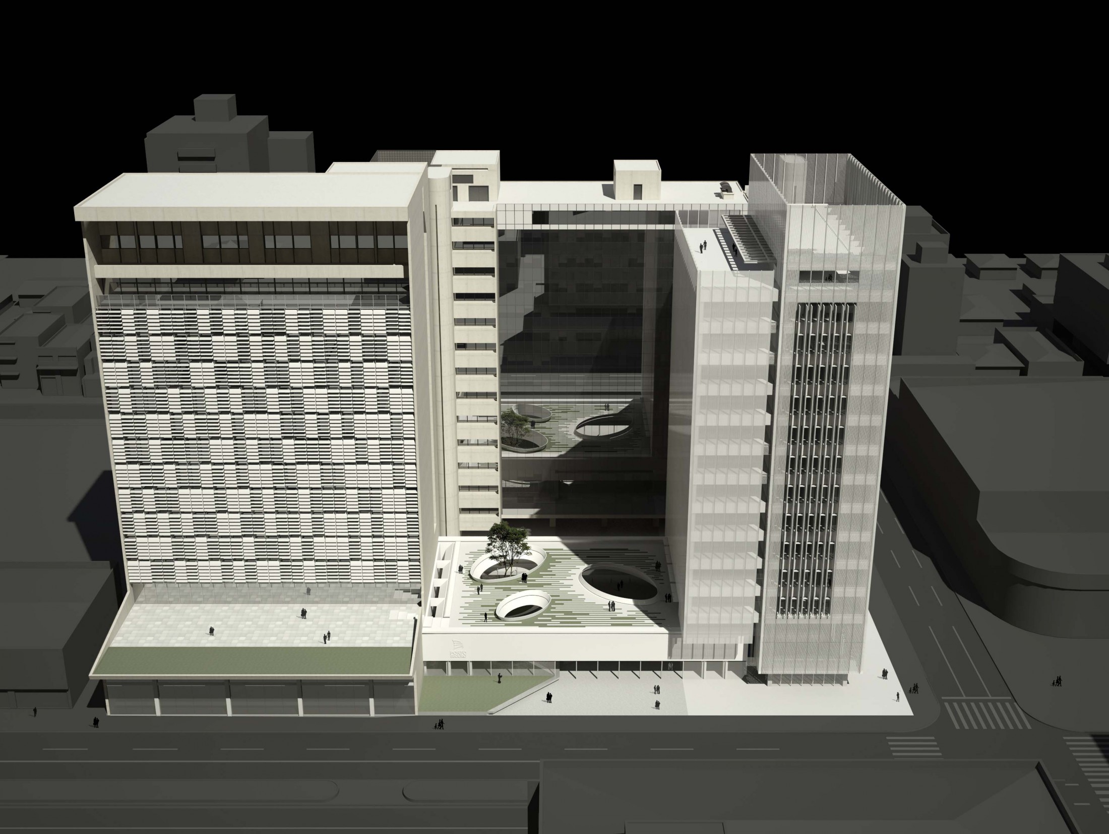 Criando a nova porta de entrada para o complexo, este eixo principal à Avenida Rio Branco se desenvolve pela nova praça, passando pelo edifício Guaianazes e culminando na praça elevada definida pelas edificações históricas. Refletindo as condições solicitadas, o edifício proposto gera a integração completa entre os edifícios bem como a articulação dos acessos e conexões de todo o complexo da Porto Seguro. Junto a isso, considerando a paisagem do centro paulistano e sua identidade reconhecida em suas construções, tornou-se fundamental revelar a presença da instituição em várias escalas. Primeiro na escala do pedestre, através do desenho de seu embasamento e praça de dimensões generosas. Depois na escala local, com a presença dos edifícios e de sua expressão arquitetônica. Por fim, na escala da cidade, através da criação de um marco vertical: um novo símbolo na Avenida Rio Branco e no skyline de São Paulo.