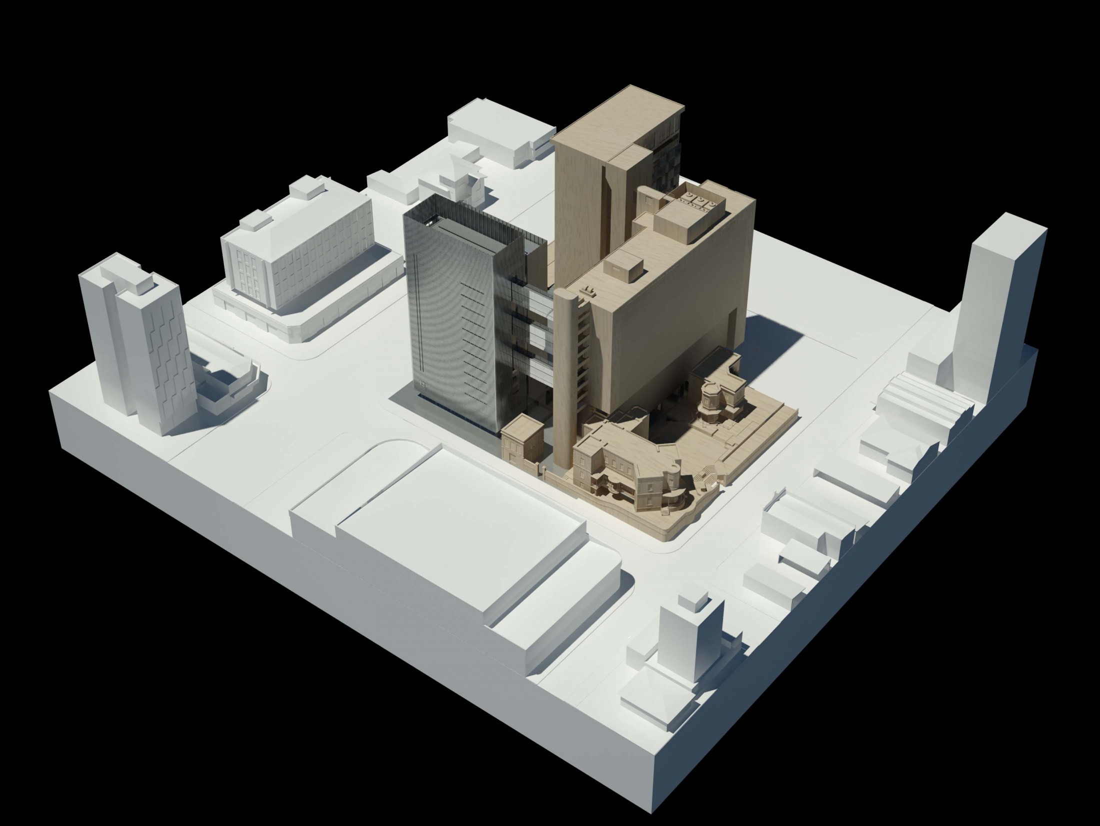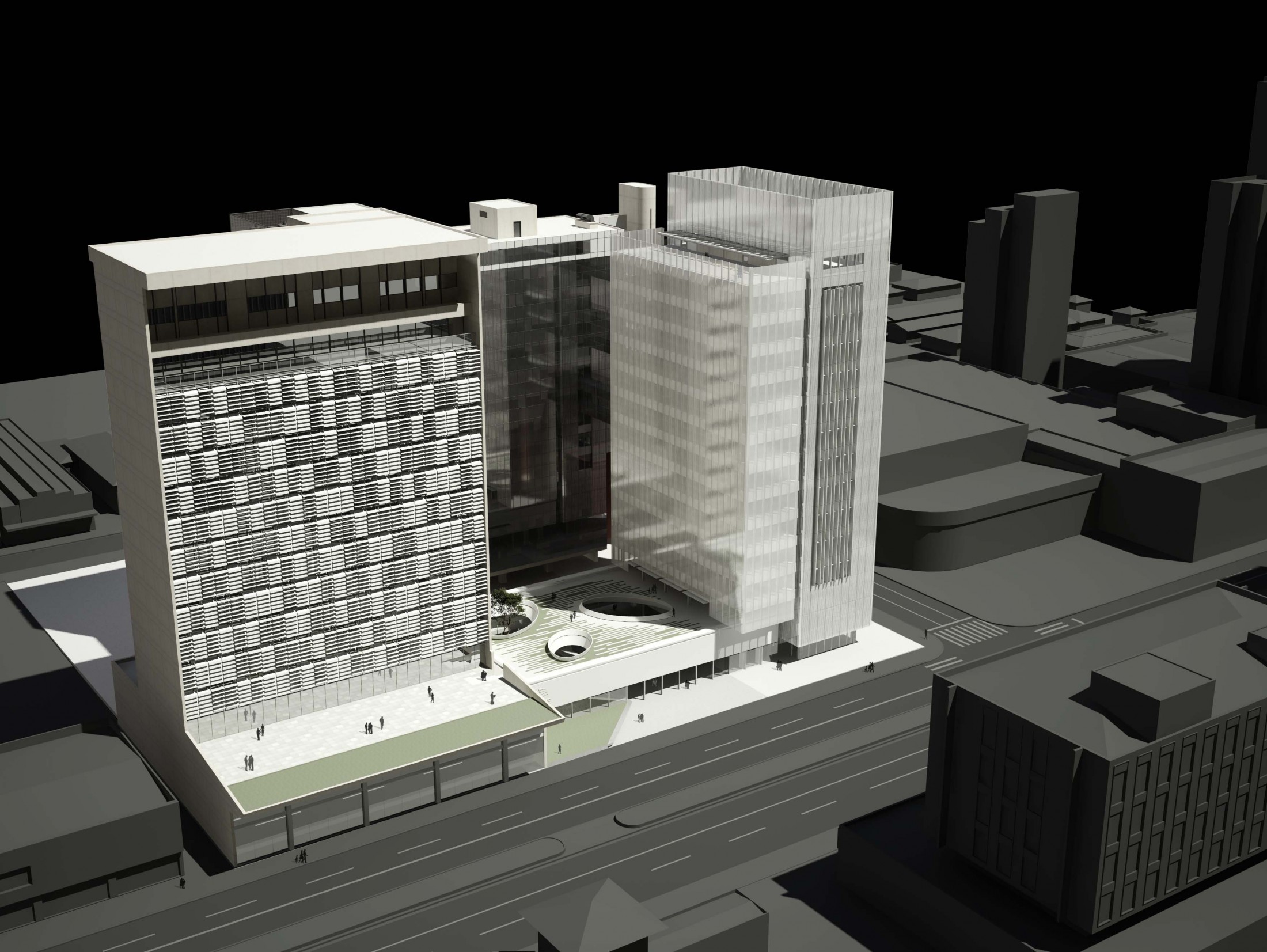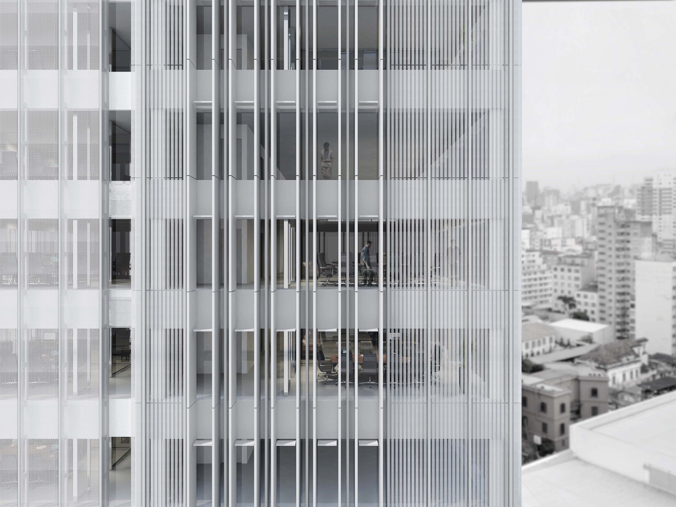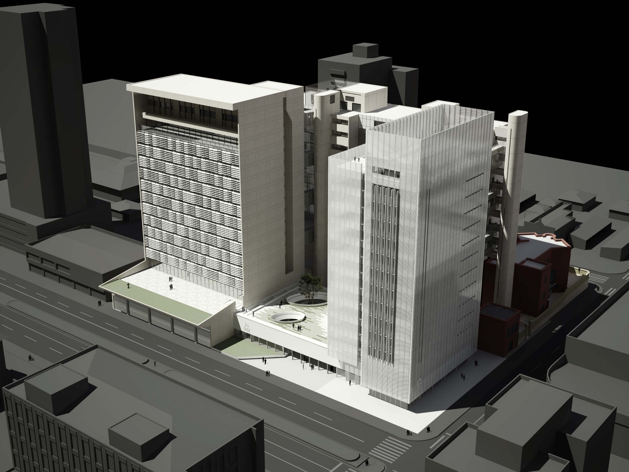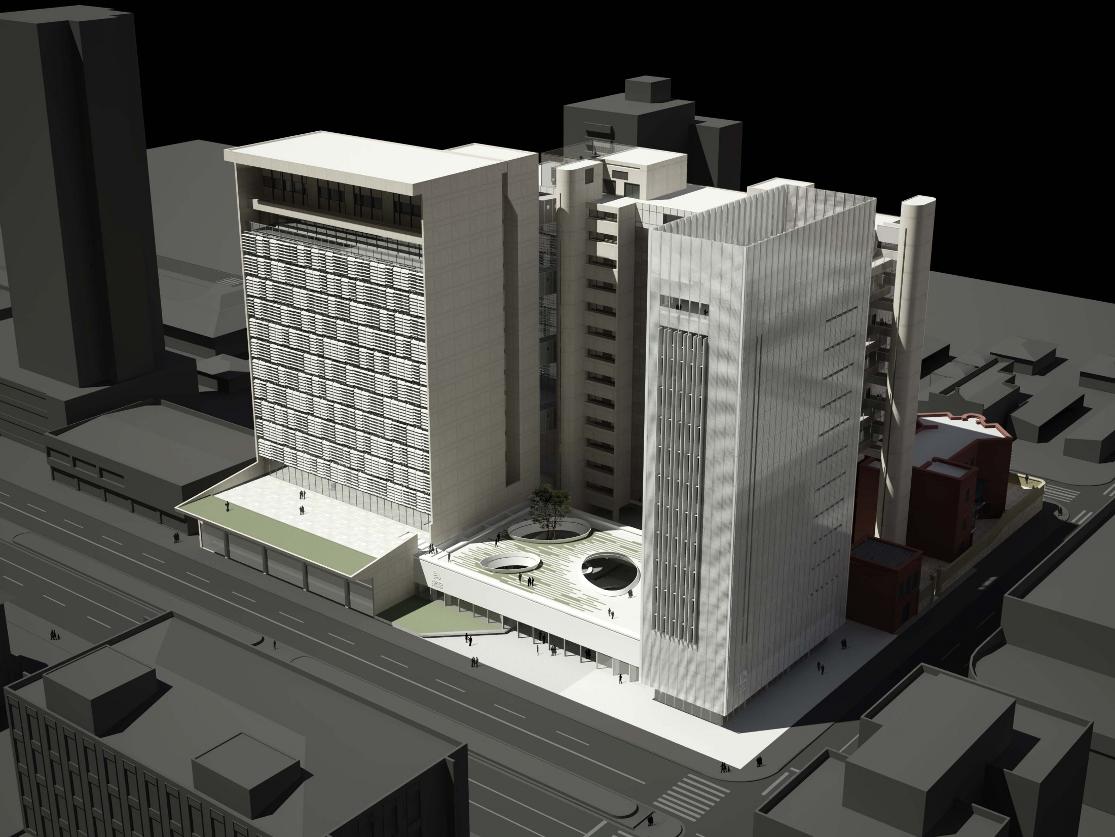 Criando a nova porta de entrada para o complexo, este eixo principal à Avenida Rio Branco se desenvolve pela nova praça, passando pelo edifício Guaianazes e culminando na praça elevada definida pelas edificações históricas. Refletindo as condições solicitadas, o edifício proposto gera a integração completa entre os edifícios bem como a articulação dos acessos e conexões de todo o complexo da Porto Seguro. Junto a isso, considerando a paisagem do centro paulistano e sua identidade reconhecida em suas construções, tornou-se fundamental revelar a presença da instituição em várias escalas. Primeiro na escala do pedestre, através do desenho de seu embasamento e praça de dimensões generosas. Depois na escala local, com a presença dos edifícios e de sua expressão arquitetônica. Por fim, na escala da cidade, através da criação de um marco vertical: um novo símbolo na Avenida Rio Branco e no skyline de São Paulo.