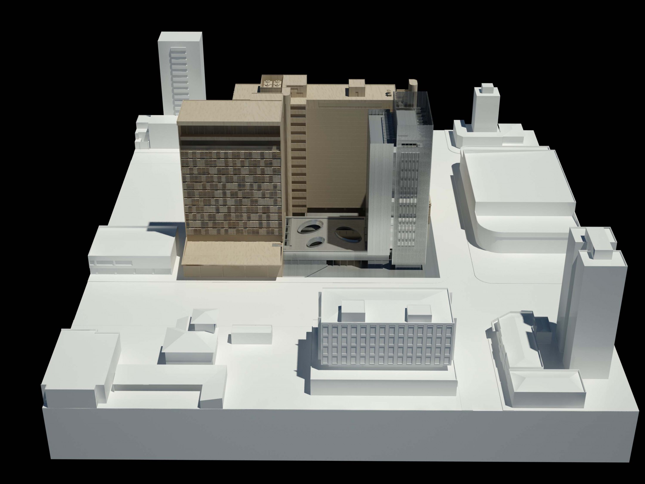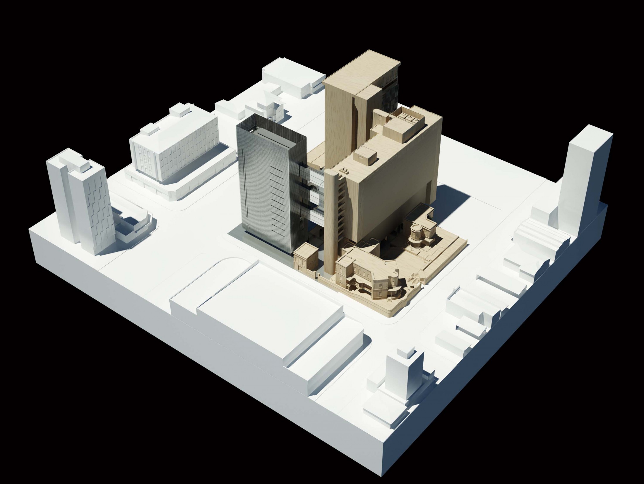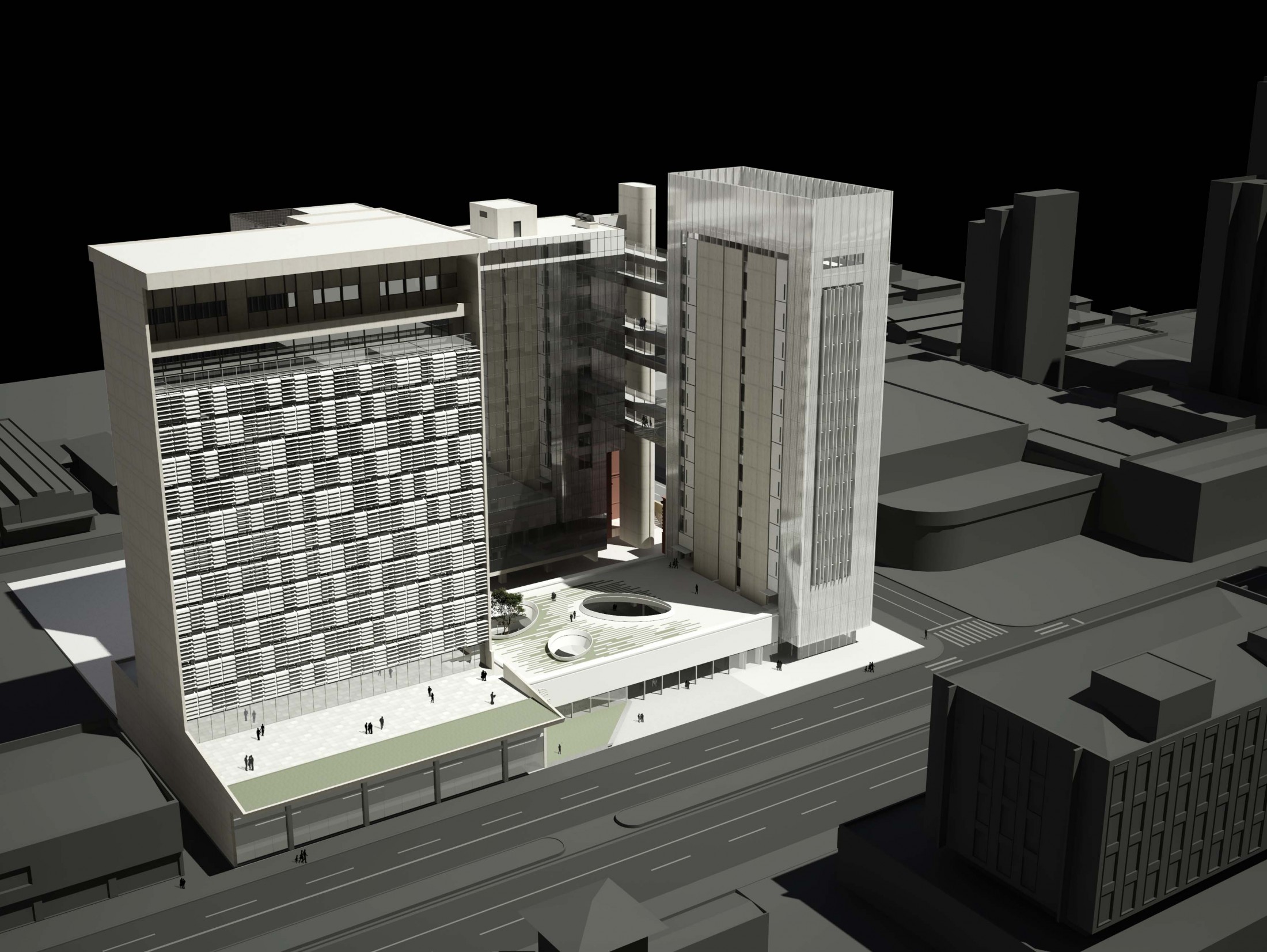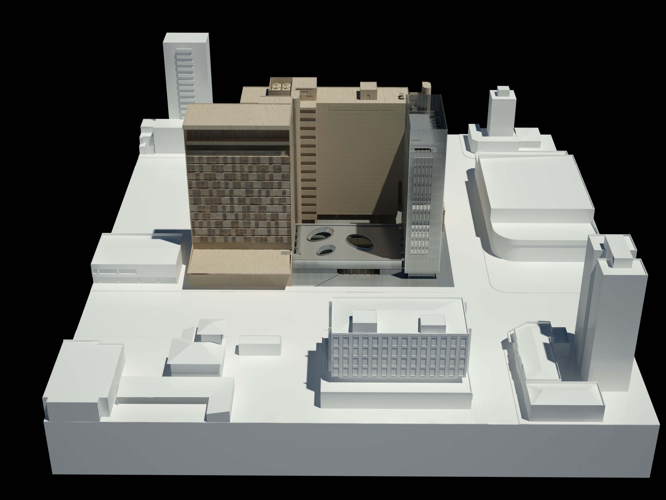 Criando a nova porta de entrada para o complexo, este eixo principal à Avenida Rio Branco se desenvolve pela nova praça, passando pelo edifício Guaianazes e culminando na praça elevada definida pelas edificações históricas. Refletindo as condições solicitadas, o edifício proposto gera a integração completa entre os edifícios bem como a articulação dos acessos e conexões de todo o complexo da Porto Seguro. Junto a isso, considerando a paisagem do centro paulistano e sua identidade reconhecida em suas construções, tornou-se fundamental revelar a presença da instituição em várias escalas. Primeiro na escala do pedestre, através do desenho de seu embasamento e praça de dimensões generosas. Depois na escala local, com a presença dos edifícios e de sua expressão arquitetônica. Por fim, na escala da cidade, através da criação de um marco vertical: um novo símbolo na Avenida Rio Branco e no skyline de São Paulo.