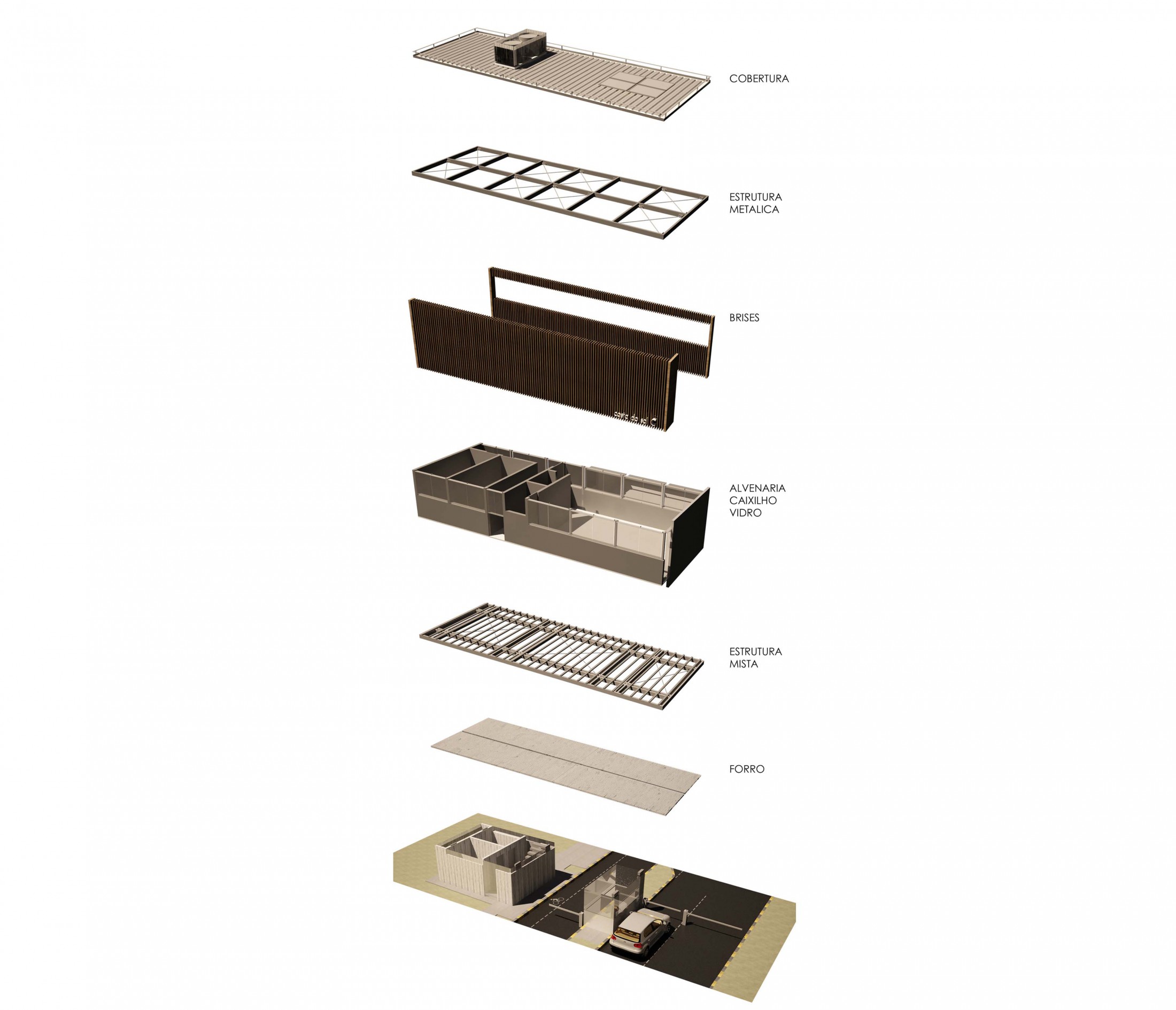 Para uma execução rápida e econômica da obra, a Nova Portaria da Quadra C do Costa do Sol se configura dentro dos limites das edificações existentes causando o mínimo de impacto possível no local onde se insere. Por essa razão é proposto um pavimento superior que acolhe o seu programa administrativo, ficando no térreo os controles de acesso e serviços. Sua construção se define por tecnologias e materiais de máxima industrialização. Concebida com sistema construtivo misto - concreto e alvenaria no térreo e metálica no nível superior - a estrutura permite uma grande flexibilidade de ocupação, também funcionando como infraestrutura para as instalações de energia, iluminação e hidráulica. As fachadas possuem proteção de brises verticais de madeira de reflorestamento e caixilhos de alumínio. Todos os demais elementos construtivos propostos possuem características de simples manipulação e manutenção, visando a exequibilidade do projeto e redução do impacto ambiental, além de evitar desperdícios ou gastos imprevistos com manutenção de longo prazo.