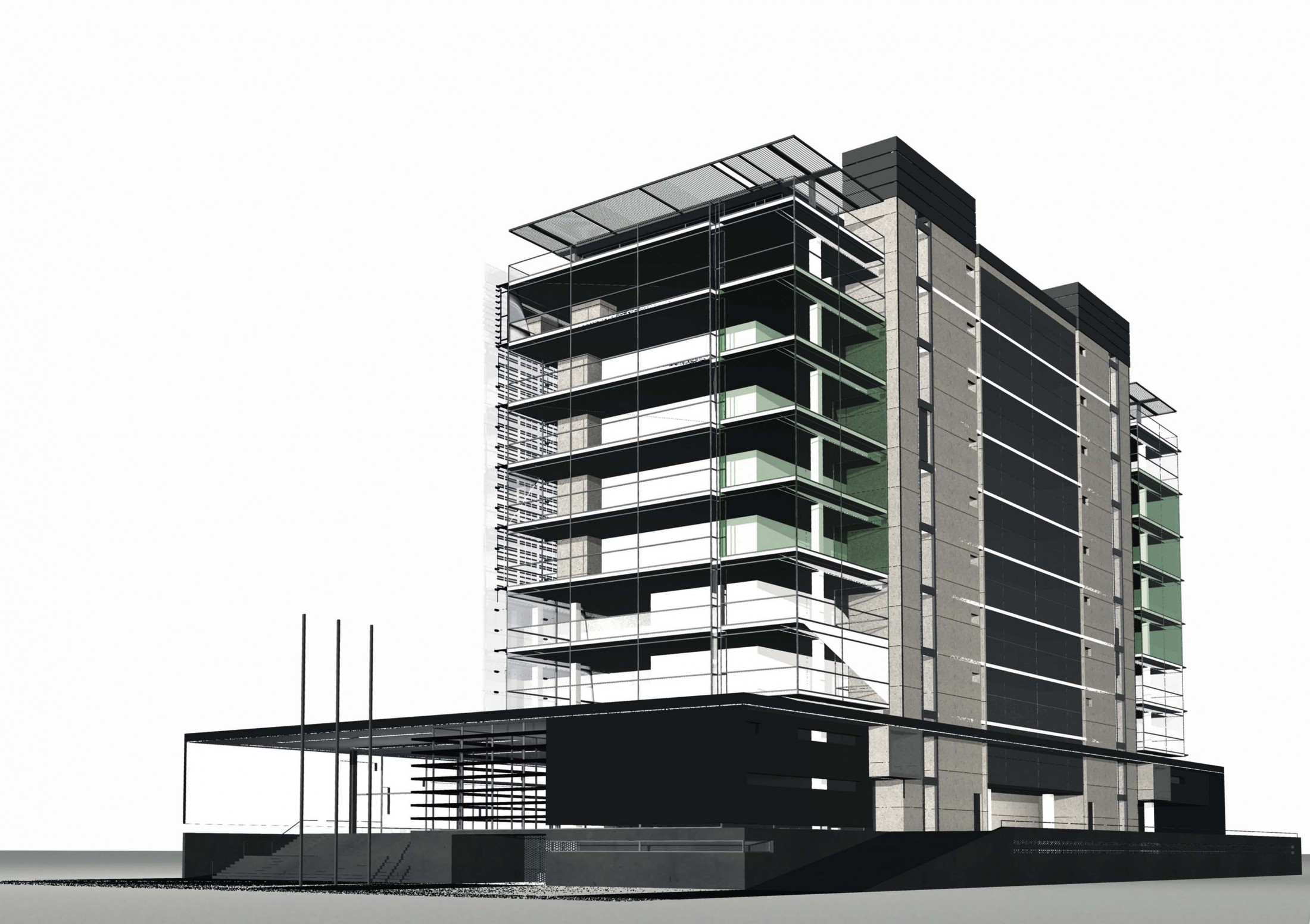 O volume vertical da Procuradoria se inicia a partir da cota +8.80m. Provido de uma planta simples e funcional, tem-se uma faixa que abriga toda a parte de circulação (vertical e horizontal) e serviços, possibilitando assim, que todo o resto do pavimento fique livre para o acolhimento das inúmeras atividades abrigadas. Sua organização funcional segue exatamente o requerido pelo programa, tomando o cuidado com a inter-relacionamento dos ambientes e das respectivas atividades. Desse modo, no 2º Pavimento e 3º pavimento estão abrigadas as dependências referentes ao Grupo 4 e Grupo 2 respectivamente. Do 4º ao 7º pavimento temos os andares do Procuradores Regionais, que contam com mais salas do que o requerido pelo programa, possibilitando futura expansão. No 8º pavimento temos as salas do Procuradores Chefe e Regional Eleitoral, providos da infra-estrutura do Grupo 3 e de uma organização distinta dos outros, com amplos espaços de circulação e jardins internos com aberturas zenitais. Na cobertura encontram-se as atividades de estar e apoio, como o restaurante, todas elas circundadas por um terraço que contempla toda a bela paisagem do Rio Guaíba.