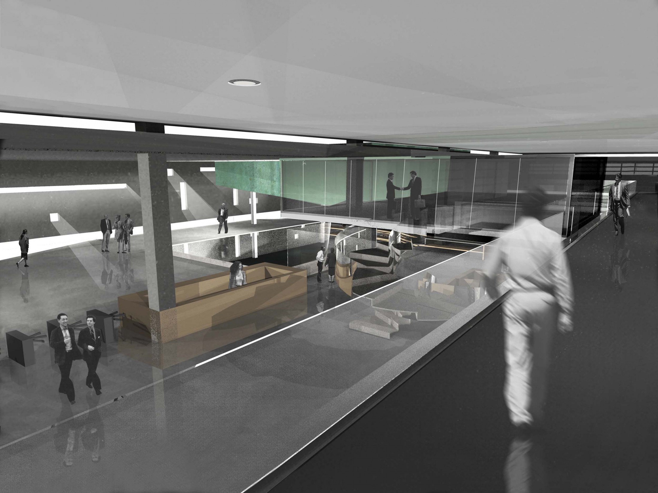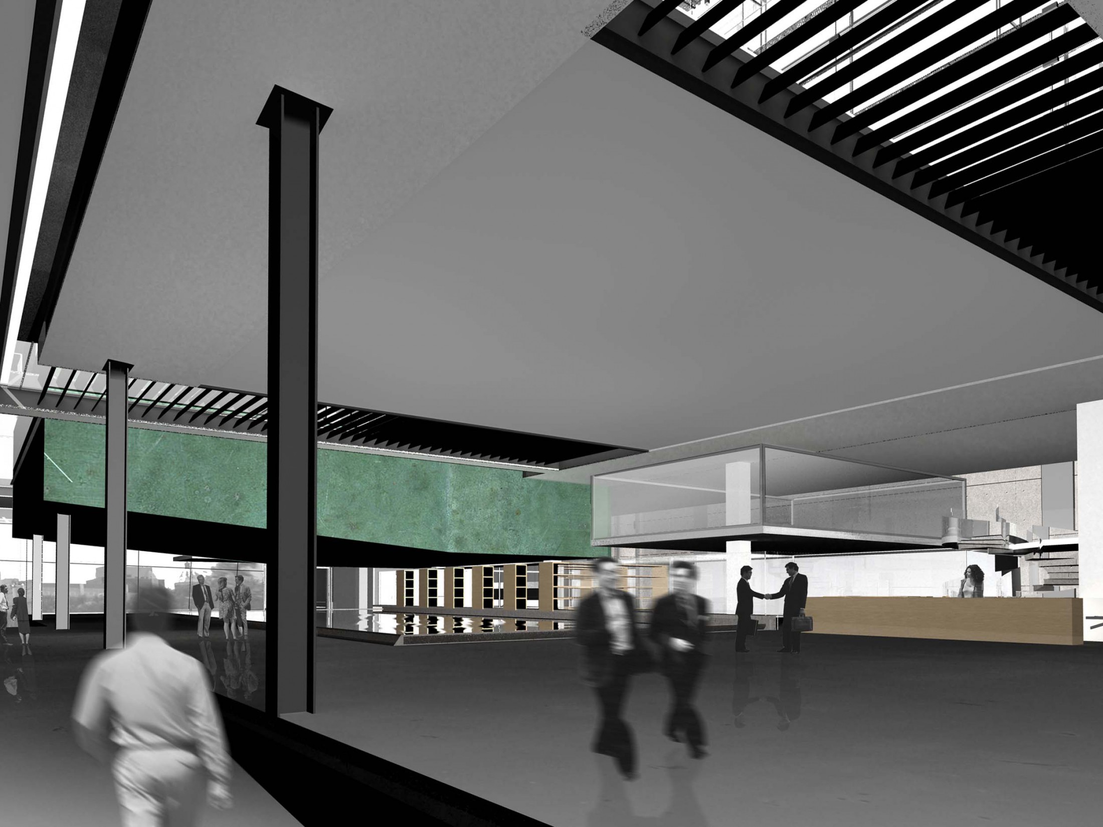 Na cota +2.50m temos efetivamente o pavimento térreo. Nele, a partir de uma circulação permeável e pública, também provida de devida segurança, temos uma transposição abrigada que leva da Rua Otávio Francisco Caruso da Rocha ao interior da grande quadra do Centro Administrativo Federal, onde se localizará futura Praça Cívica. Através de generosas escadarias e rampas, o usuário é convidado a cruzar o grande hall de acesso que se revela aos poucos com os grandes beirais e com a iluminação natural, que preenche o espaço interno onde preconiza o volume revestido de chapas de cobre do auditório, localizado no mezanino, sobre o espelho d'água. Nessa mesma cota, estão situadas todas as áreas de recebimento e protocolo (Coordenadoria de Controle Processual), de fácil acessibilidade e comunicação com todo o edifício e com as vagas de estacionamento rápido para recebimento e restituição de processos e visitantes. A biblioteca é privilegiada pela centralidade delimitada por uma caixa de vidro aparente e estendida pelo espelho d'água encimada por insolação zenital. Também estão aí localizadas as áreas de serviço terceirizado, existindo a possibilidade de acesso independente. No mezanino, cota +5.10m, encontram-se o auditório, salas de apoio e sala vip, que contempla todo o hall e os ambientes vazados com pé direito duplo. O foyer defini-se na ampla passagem que se estende até às salas de apoio, possibilitando sua transformação num grande espaço para exposições, e permitindo fácil acesso ao público.