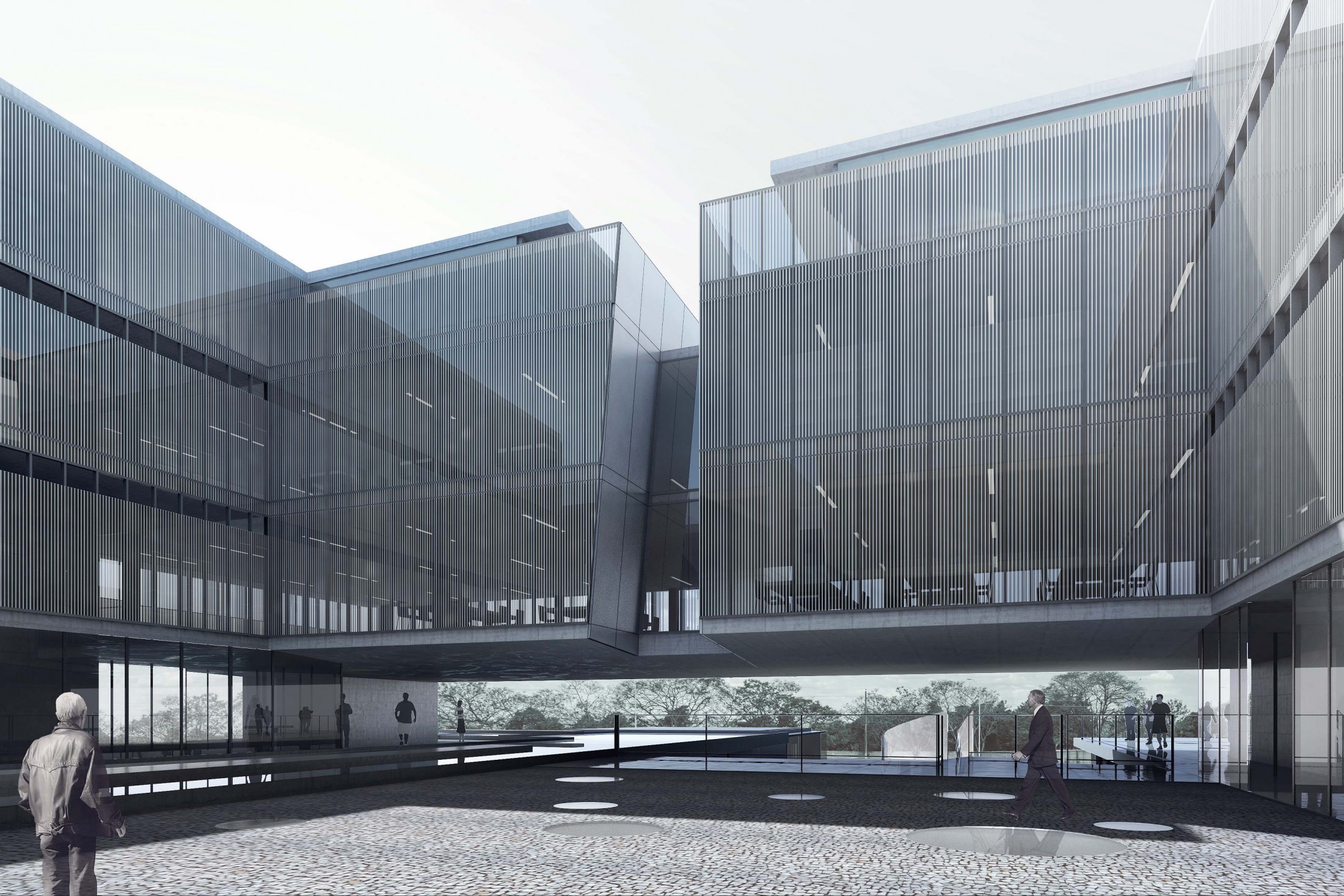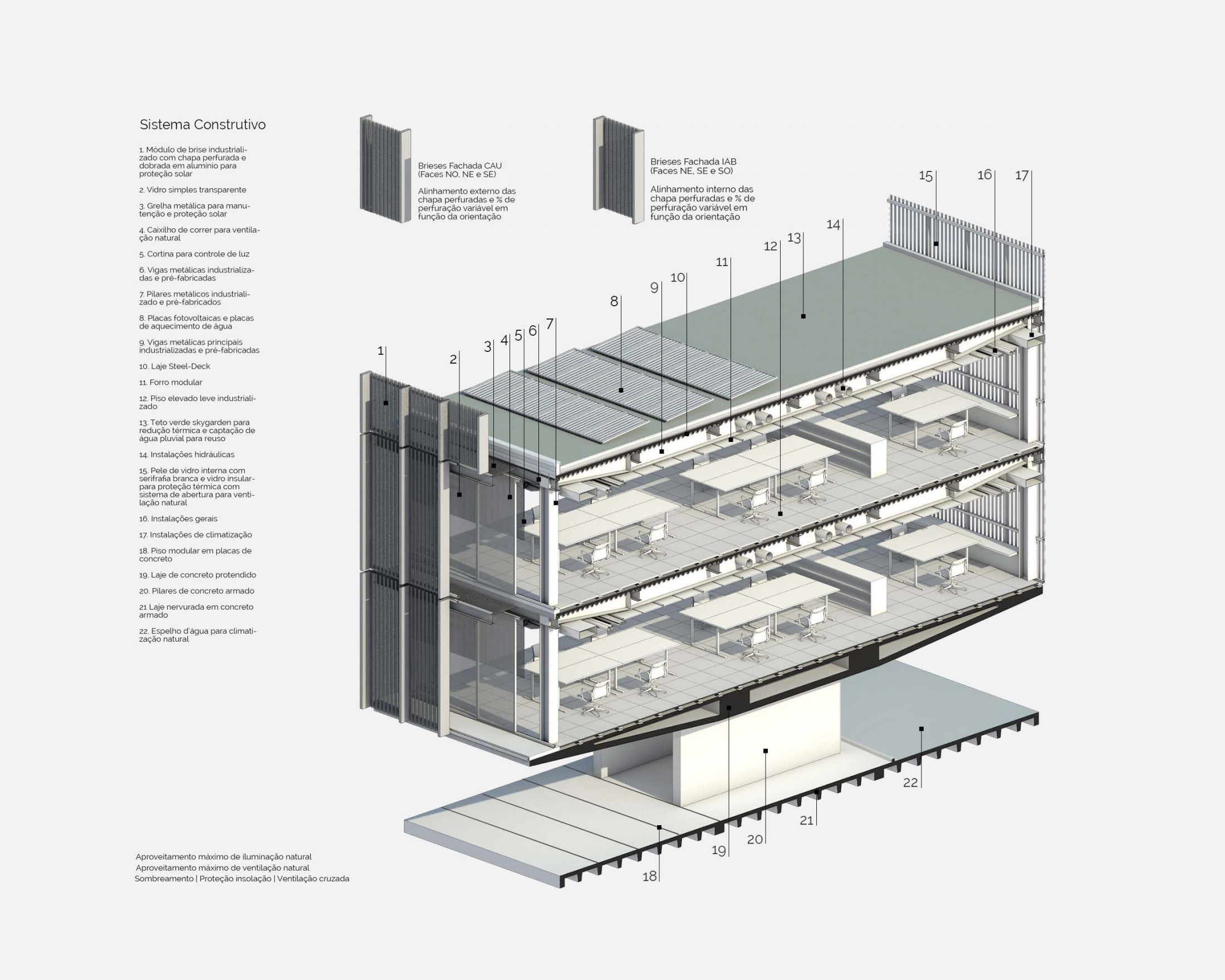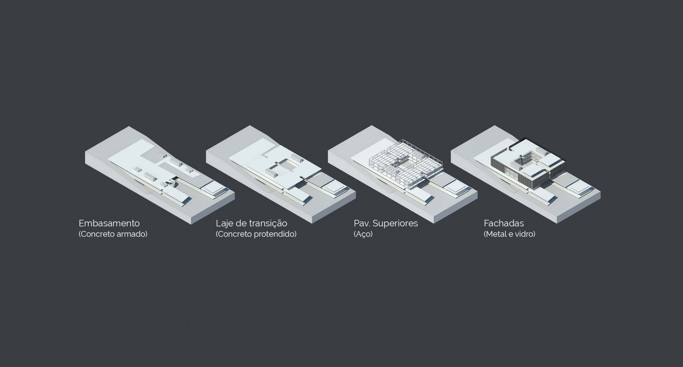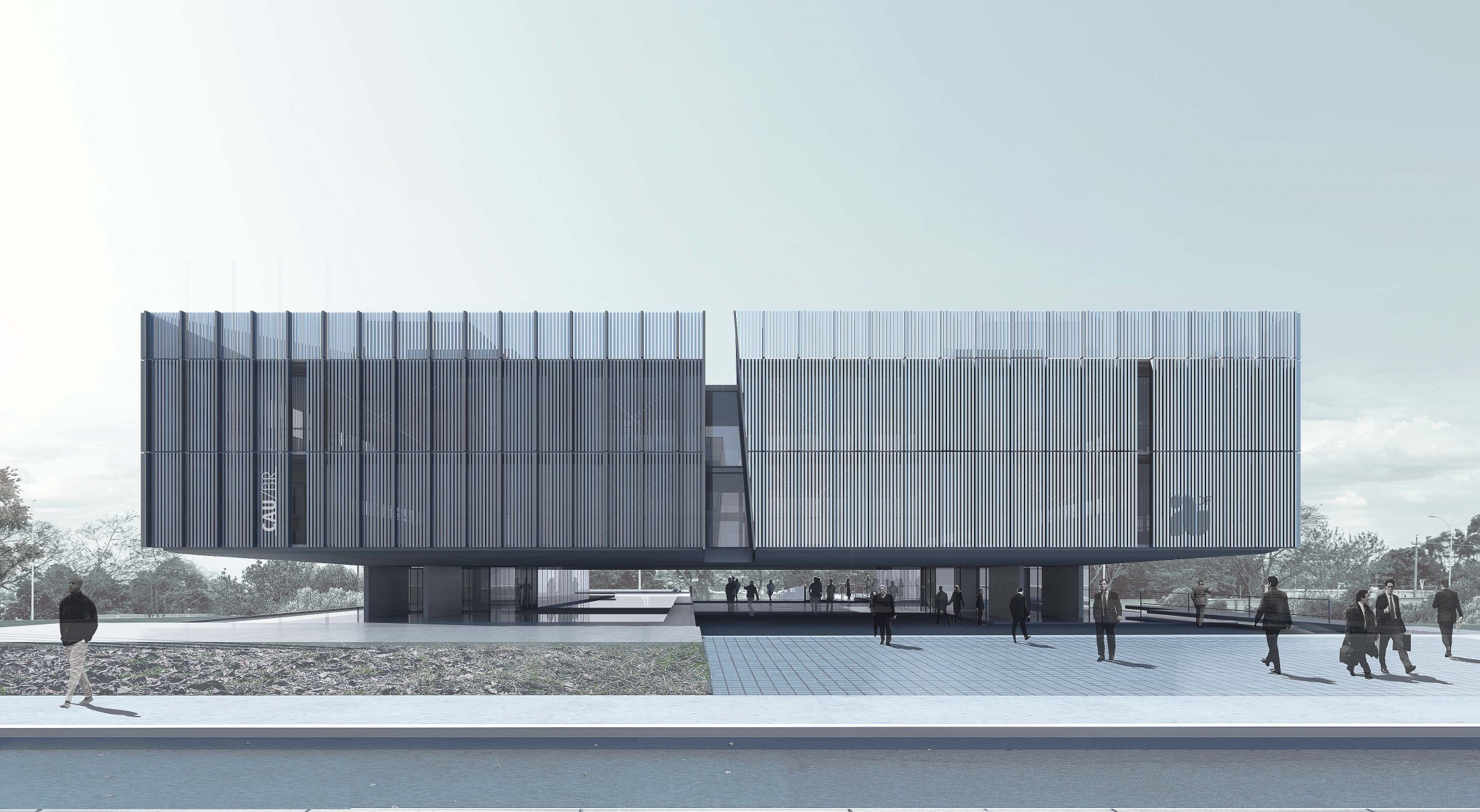 Duas instituições equipotentes determinam aqui a origem de algo maior: a própria Arquitetura. Se esta deve promover o encontro, fazê-lo entre aqueles que a representam é primordial. Trata-se, em suma, de se erigir um monumento que, diante de sua sólida presença, seja capaz de nos emocionar e nos conduzir a uma compreensão precisa do significado de convivência e do sentimento que nos evoca a força dessa construção social. Consciente da responsabilidade simbólica deste conjunto, buscamos alcançar a estatura de suas dimensões éticas e estéticas, propondo uma Arquitetura que, por meio da expressão das instituições que abriga, conduza-nos a uma vivência verdadeira de seus valores fundamentais. A Arquitetura se ergue plenamente quando consolida uma síntese dos princípios que a conceberam e que seguirão sustentando a sua permanência. Assim, a noção de unidade nos confere um juízo contundente para a construção deste novo marco: como um amálgama – com absoluta autonomia – unem-se no conjunto arquitetônico das Sedes do IAB/DF (Instituto de Arquitetos do Brasil - Departamento do Distrito Federal) e do CAU/BR (Conselho de Arquitetura e Urbanismo do Brasil), os valores das entidades, do urbanismo do lugar, da integridade, da tradição arquitetônica, da pesquisa tecnológica, da consciência temporal, do exercício digno das funções, das dimensões públicas de acolhimento e da promoção cultural. A proposta se estrutura segundo a premissa de plena autonomia das instituições, garantindo a independência necessária de suas presenças e funções. Por conseguinte, duas entidades originam dois edifícios que se fundem num único ato: partes complementares de um todo que, a partir dessa união, pode transmitir o autêntico preceito que compartilham: o significado da Arquitetura para a cidade e a sociedade. Essa condição é inaugurada por um eixo longitudinal definidor da independência funcional das entidades e, principalmente, do espaço público que permeia o conjunto, abrindo-o para a paisagem de Brasília. Este mesmo eixo se expande verticalmente numa incisão precisa no volume aéreo que abriga parte do programa e define o acesso e a sombra do lugar: um corte revelador do interior para onde ambas convergem, um mesmo lugar, um vazio unificador. A grande porta urbana que se torna o edifício acontece por meio de uma clássica atitude da Arquitetura Brasileira: a presença do vão. A estrutura se torna espaço ao solidificar a construção mútua das instituições que, com seus estritos apoios, passam sustentar uma à outra. O projeto define de modo incisivo a identidade de cada instituição através de concepções equilibradas de linguagem, de setorização espacial do programa em diferentes níveis e de sistemas de circulações independentes. Sempre de modo equivalente, ambas desfrutam da implantação de eficiente proteção solar e de apropriação da bela paisagem, trazida para seu interior com praças e espelhos d’agua. Uma construção que se principia vigorosa com o concreto armado e que vai se tornando mais leve com o predomínio de elementos metálicos na estrutura superior e sistemas de fachadas. Soluções que tem por objetivo o bem-estar dos usuários, o uso inteligente dos recursos e expressões inovadoras. O encontro entre IAB/DF e CAU/BR é anunciador: edifícios, expressões e especificidades preservadas definem uma precisa autonomia compartilhada e respeitosa. Uma Arquitetura única que busca consolidar os princípios comuns nos quais acreditamos. Se a Arquitetura pode unir as pessoas, pode também as reunir em instituições que a representam num lugar onde toda e cada parte é um só.