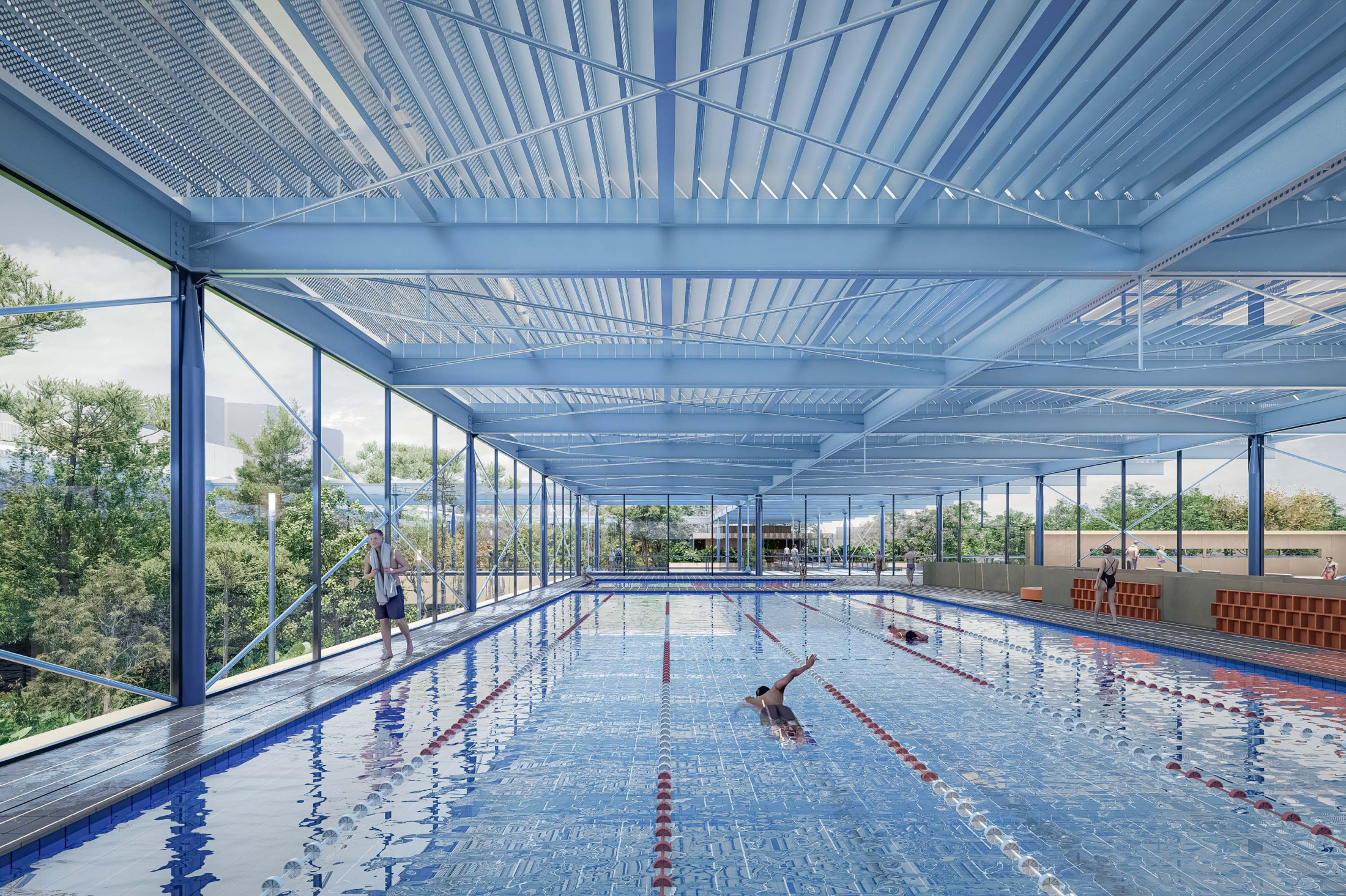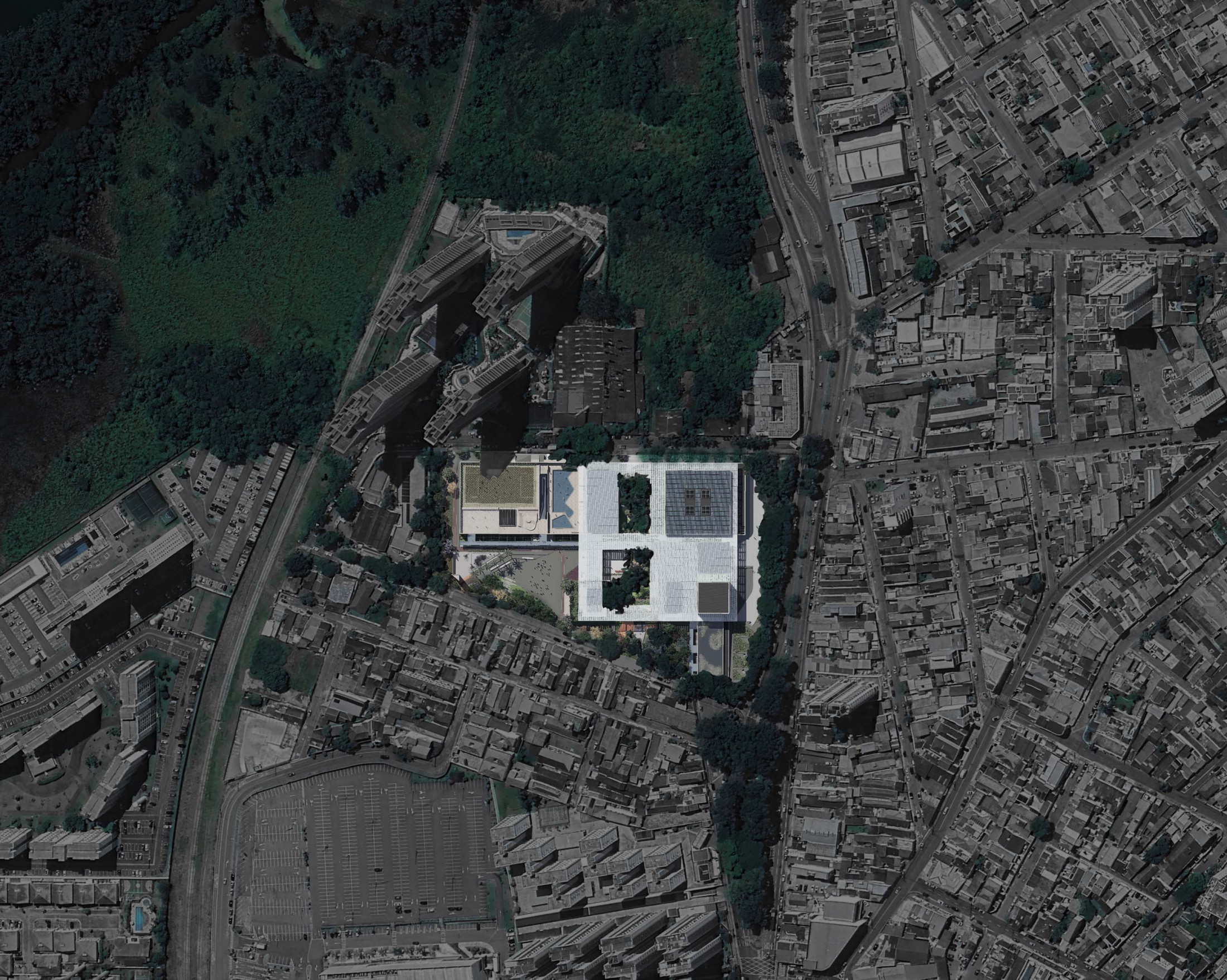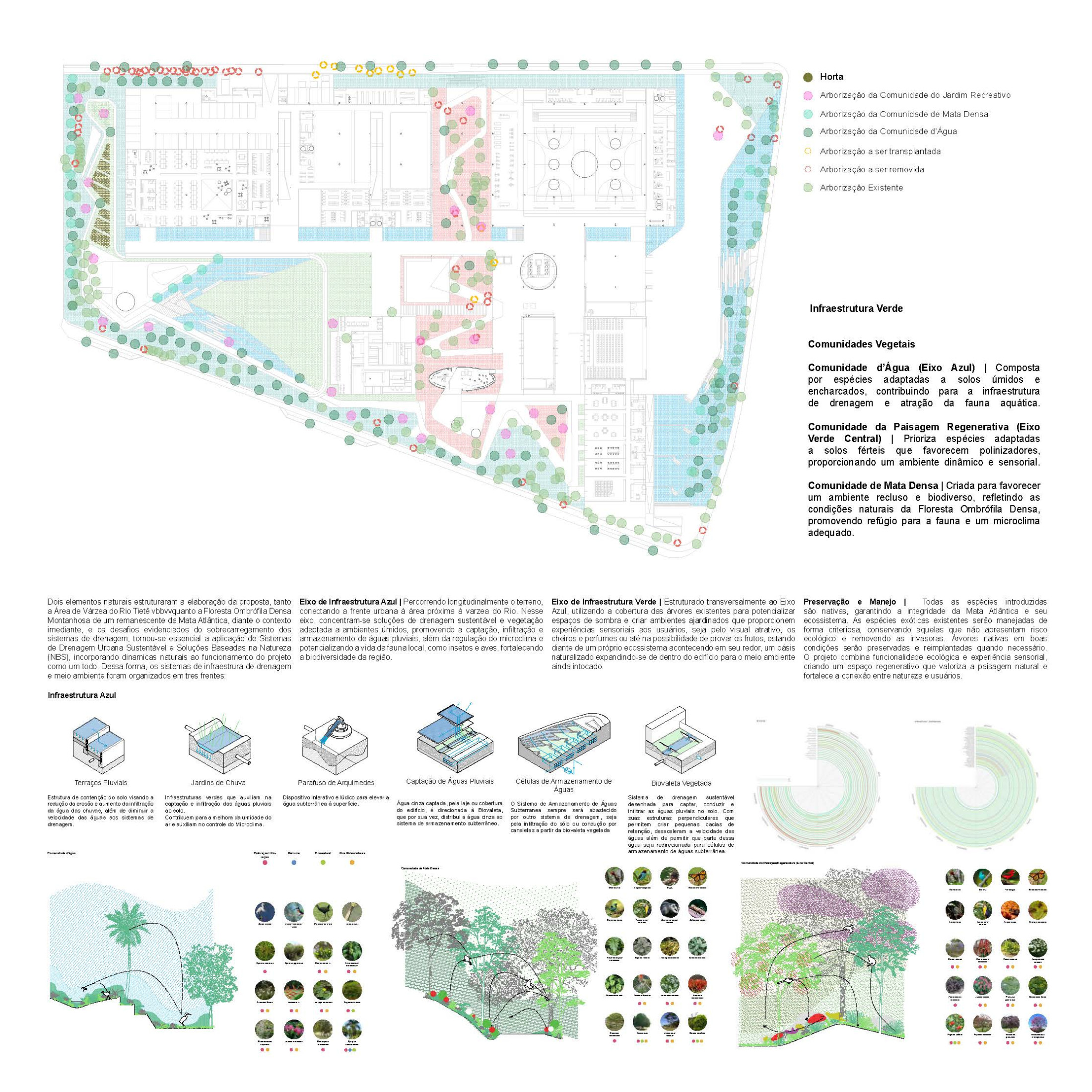 O projeto da nova unidade do SESC em Mogi das Cruzes busca refletir os princípios éticos da instituição, abraçando sua responsabilidade social, cultural e ambiental. A arquitetura foi pensada como um agente ativo nas transformações sociais, propondo espaços que contribuam para o bem-estar dos usuários e para o desenvolvimento humano. A unidade busca contribuir com a tradição inovadora da arquitetura do SESC a partir de uma experiência única, promovendo uma relação de convivência entre os elementos arquitetônicos e o ambiente urbano e natural ao redor. Situado nos limites da malha urbana, a proposta entende o SESC como um elo entre a cidade e a natureza. O terreno amplo foi aproveitado para criar um espaço aberto que integra Arquitetura e Paisagismo como uma unidade indissociável, construindo uma relação harmoniosa entre os edifícios e o lugar, respeitando a topografia do terreno e minimizando o impacto ambiental. Além de preservar a vegetação existente, o projeto busca enriquecer a diversidade ecológica e integrar-se ao verde da região, além de utilizar estratégias como drenagem sustentável, captação de água da chuva e uso racional de recursos hídricos e energéticos.