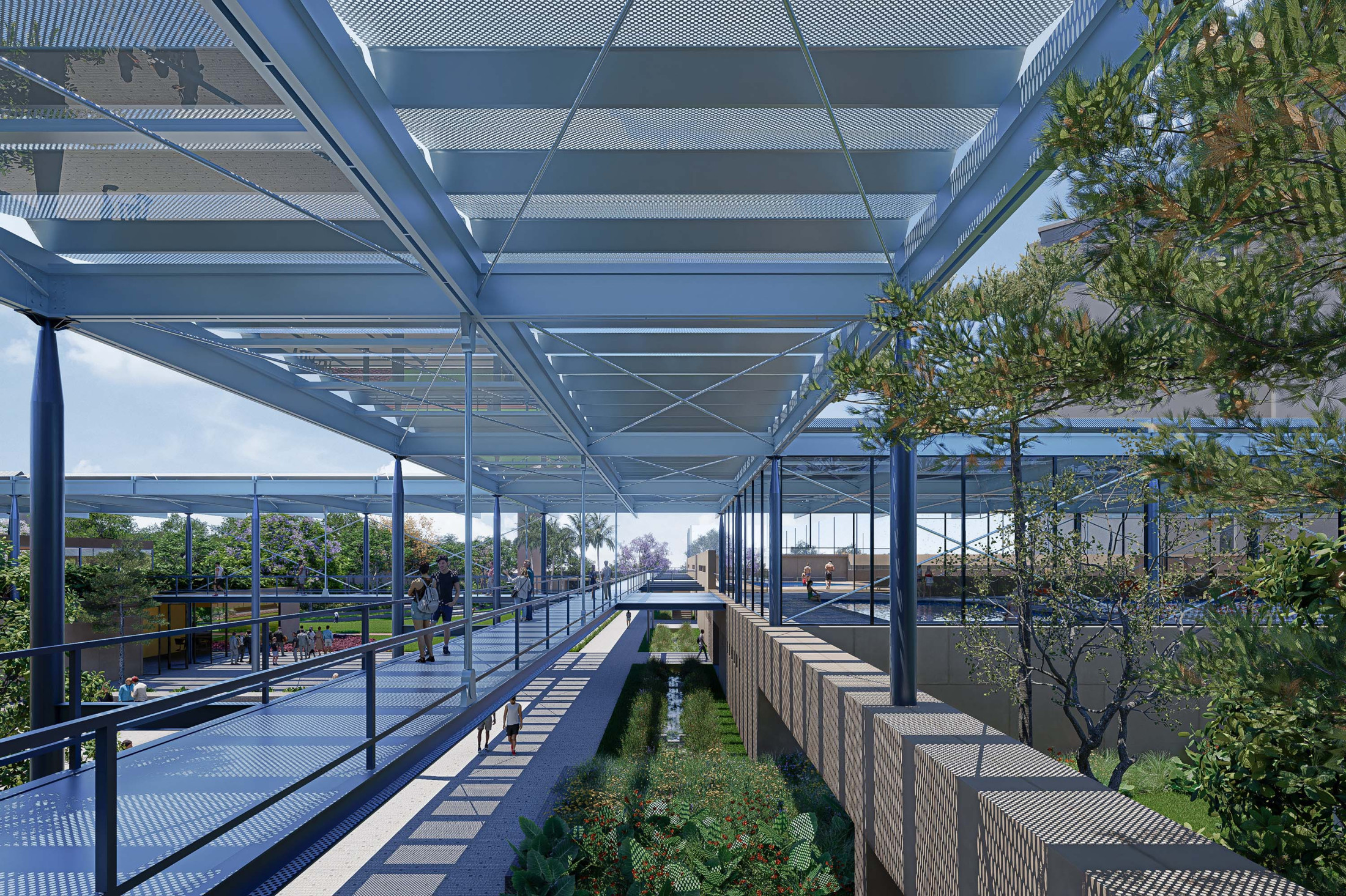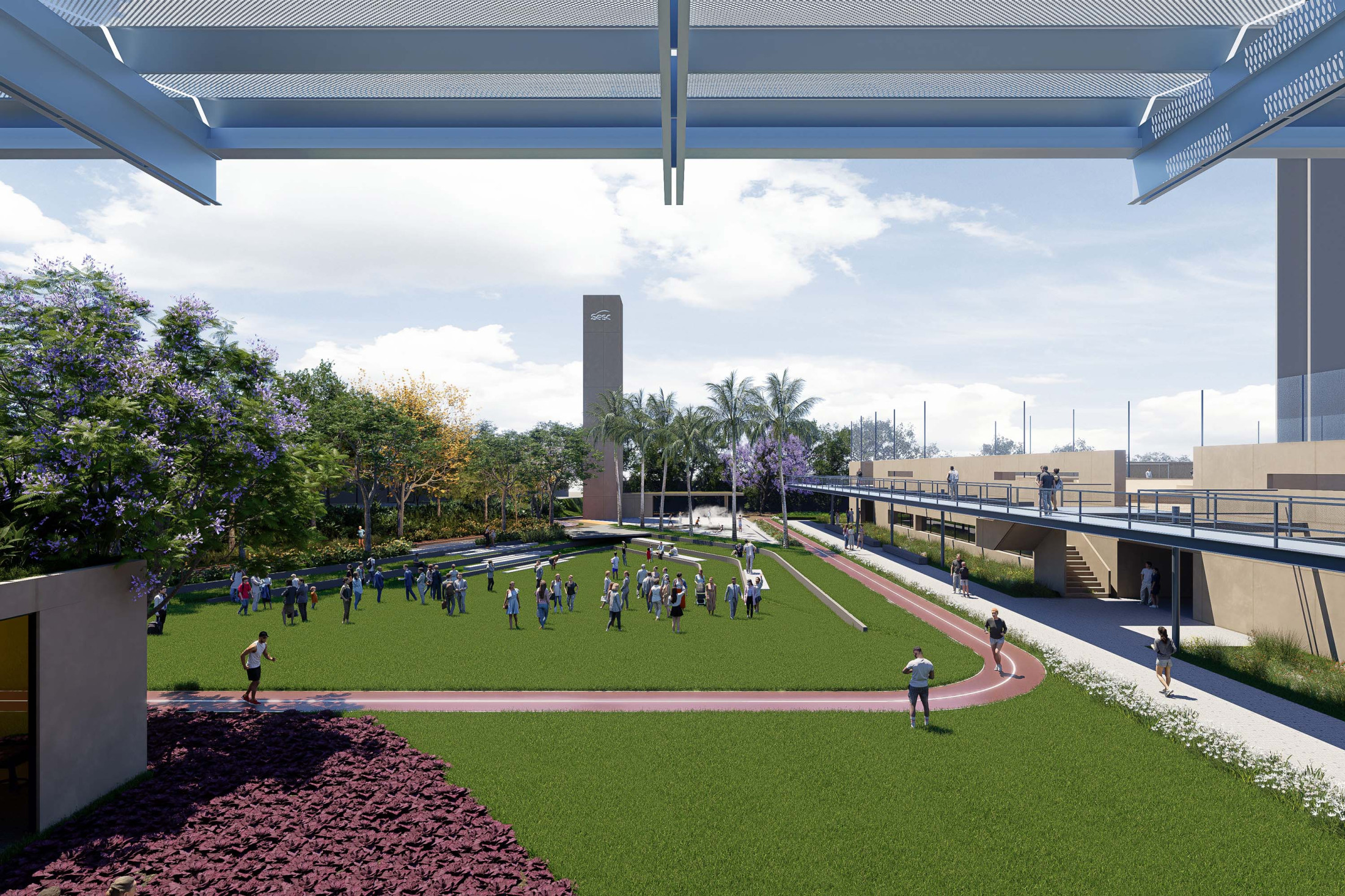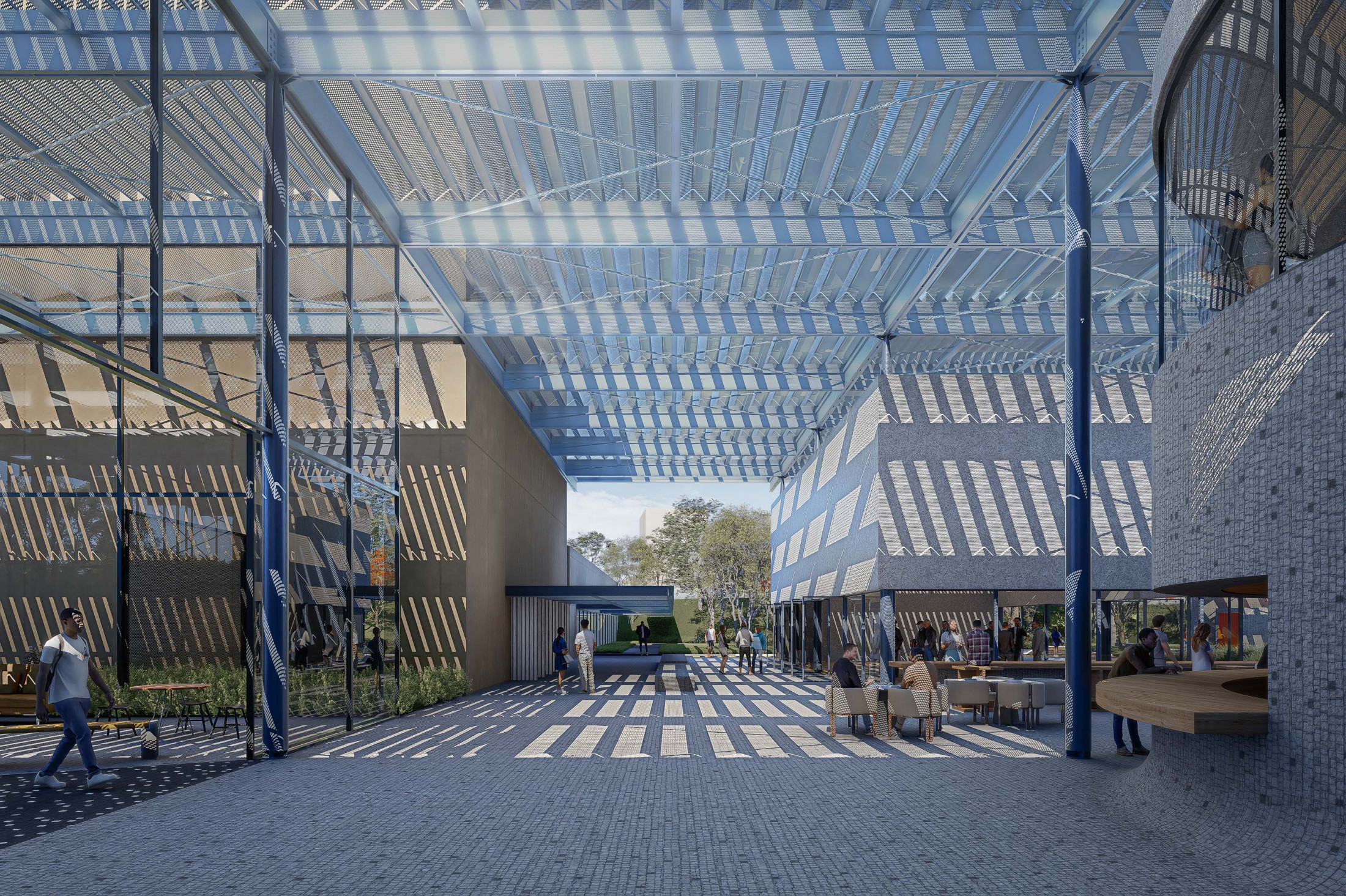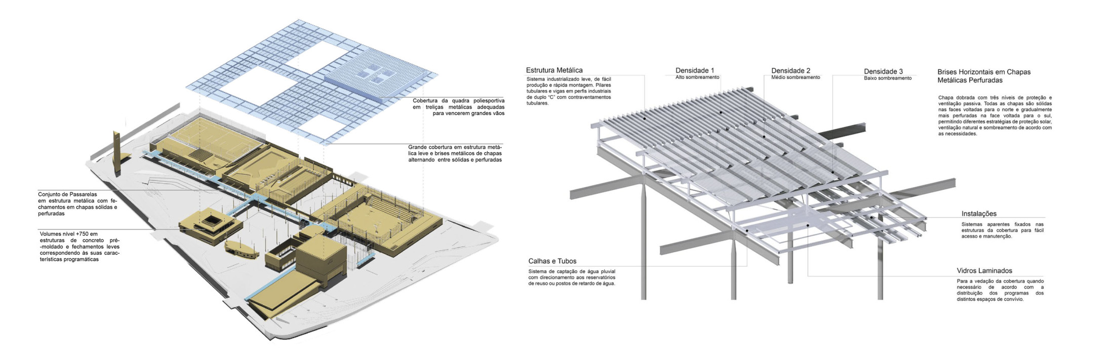 A sustentabilidade e a tecnologia desempenham papel central no projeto. A arquitetura é concebida como uma ‘máquina sustentável’, com soluções que minimizam o impacto ambiental e priorizam a eficiência energética. A grande cobertura do complexo é projetada como proteção do calor excessivo e geradora da sombra que contribui para o conforto térmico dos espaços internos e externos. O projeto integra sistemas de captação de energia solar, reutilização de águas pluviais e iluminação e ventilação natural, garantindo o uso racional de recursos. A escolha de materiais, como estruturas metálicas e concreto pré-moldado, visa à durabilidade e rapidez na construção, coordenados como sistemas racionais, compatíveis e imprescindíveis para uma construção dessa complexidade de escala.