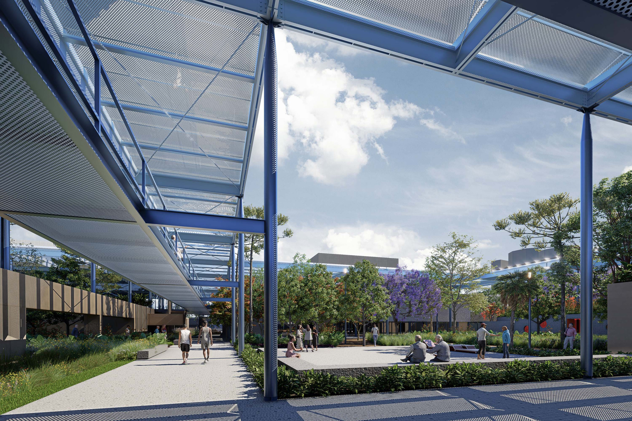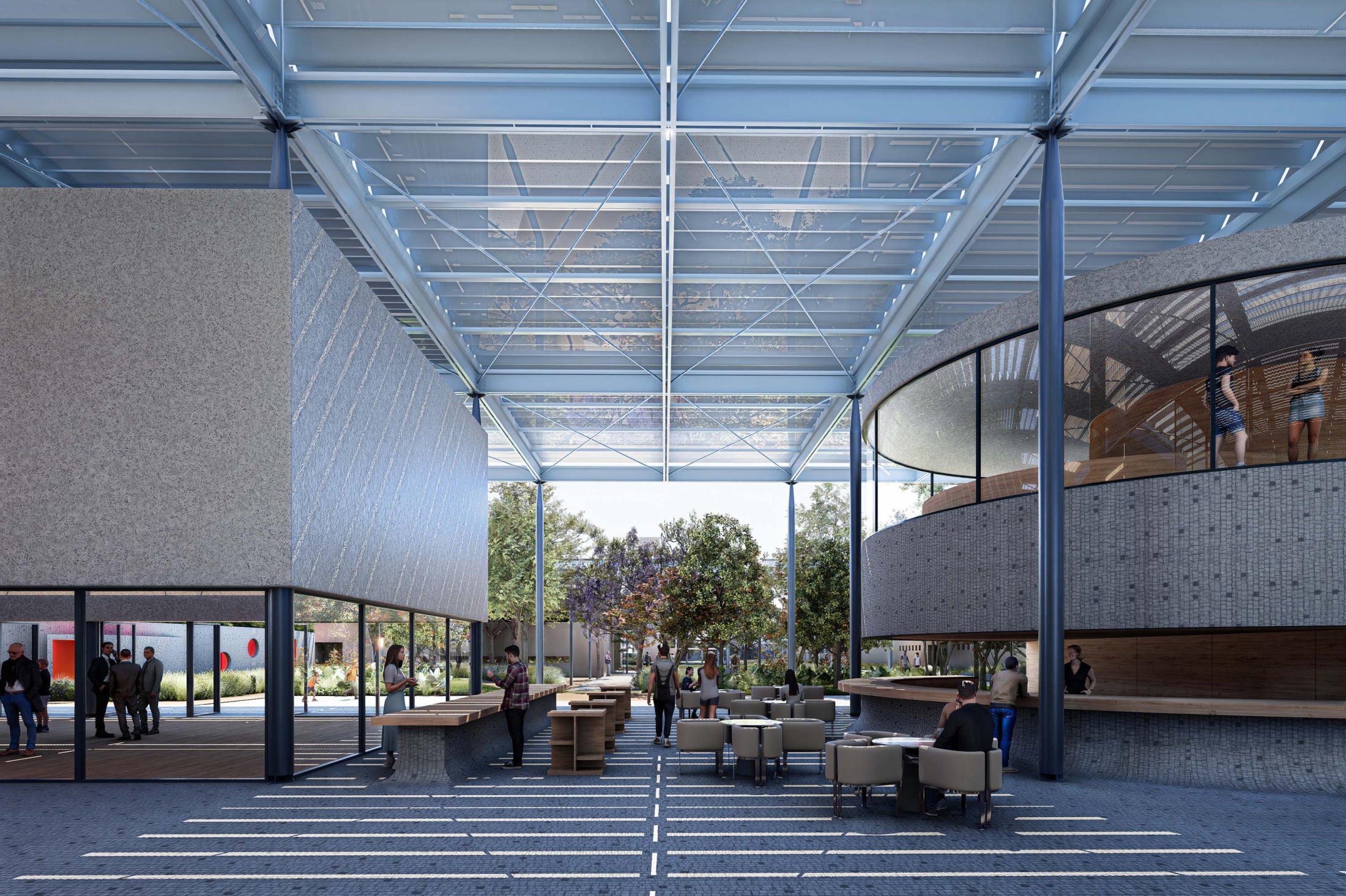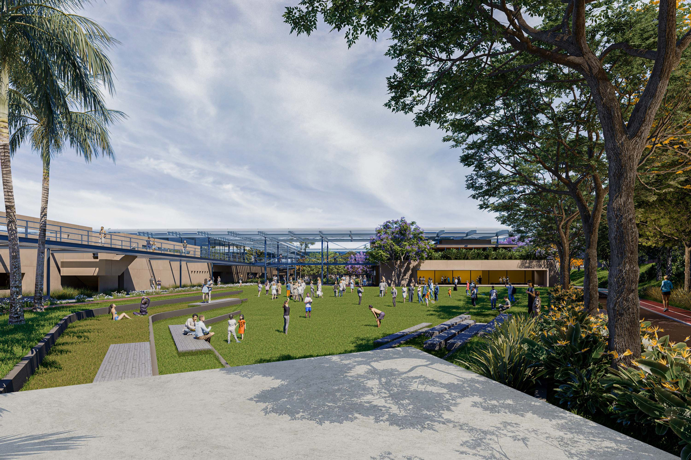 A sustentabilidade e a tecnologia desempenham papel central no projeto. A arquitetura é concebida como uma ‘máquina sustentável’, com soluções que minimizam o impacto ambiental e priorizam a eficiência energética. A grande cobertura do complexo é projetada como proteção do calor excessivo e geradora da sombra que contribui para o conforto térmico dos espaços internos e externos. O projeto integra sistemas de captação de energia solar, reutilização de águas pluviais e iluminação e ventilação natural, garantindo o uso racional de recursos. A escolha de materiais, como estruturas metálicas e concreto pré-moldado, visa à durabilidade e rapidez na construção, coordenados como sistemas racionais, compatíveis e imprescindíveis para uma construção dessa complexidade de escala.