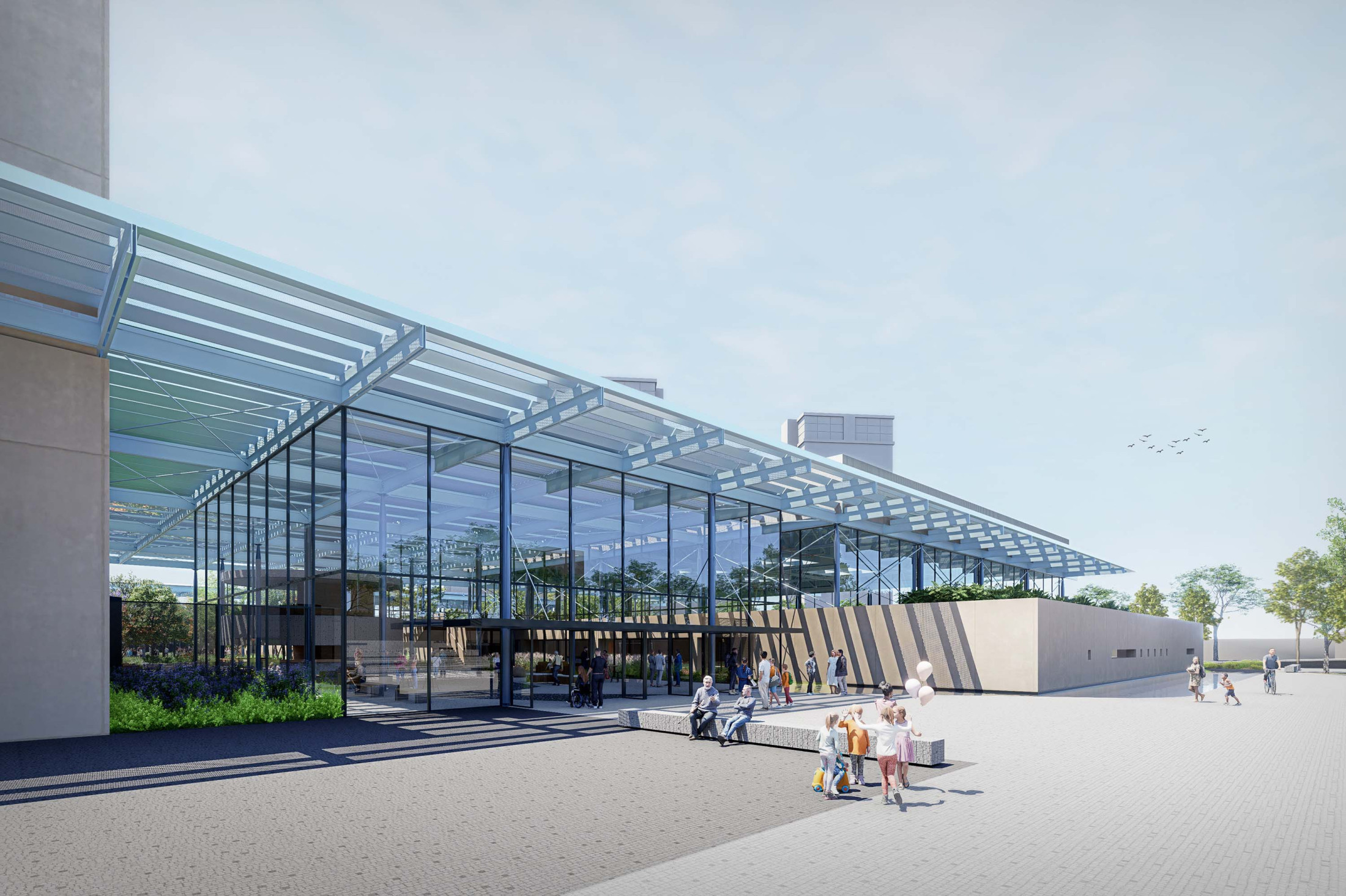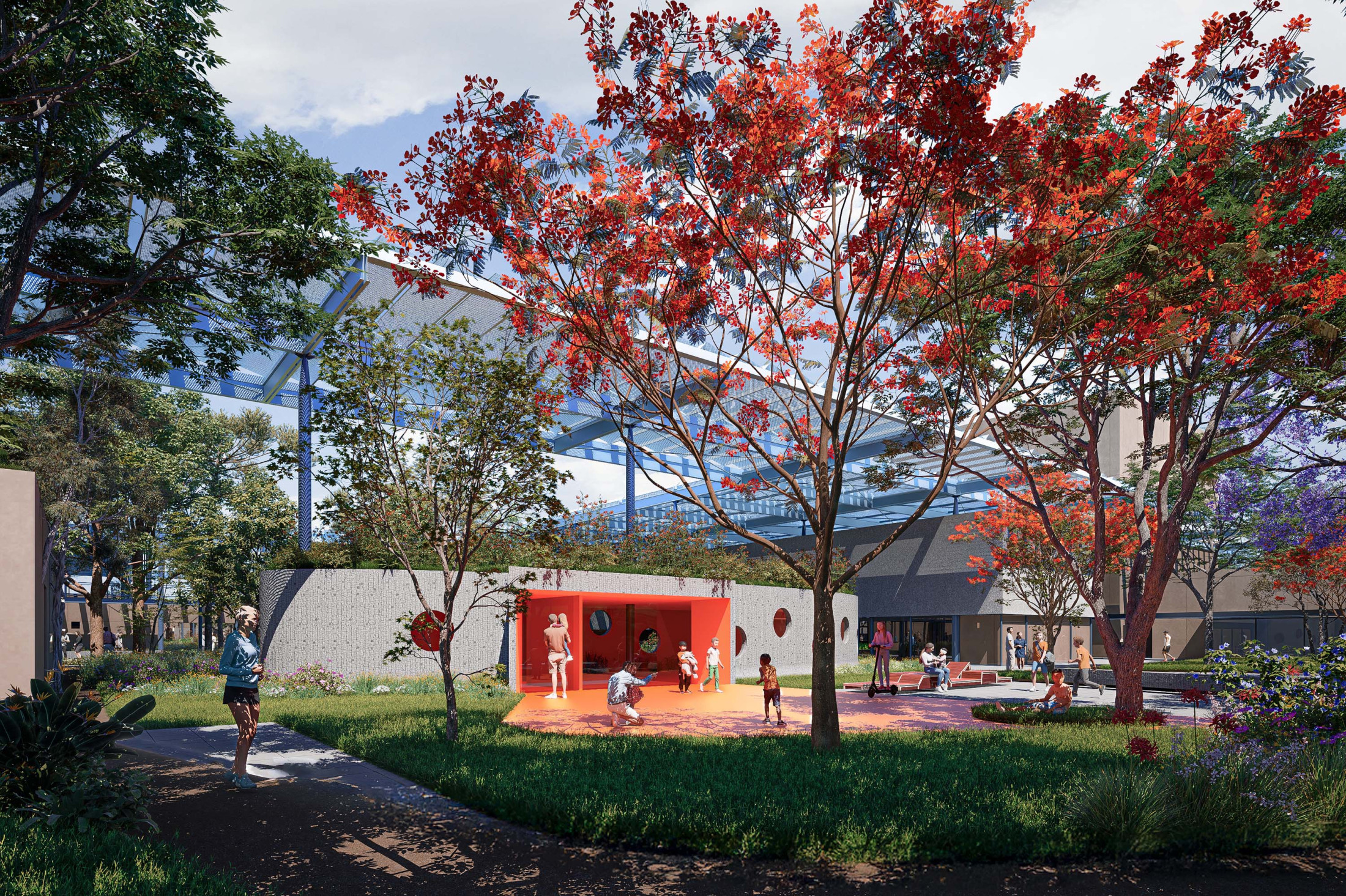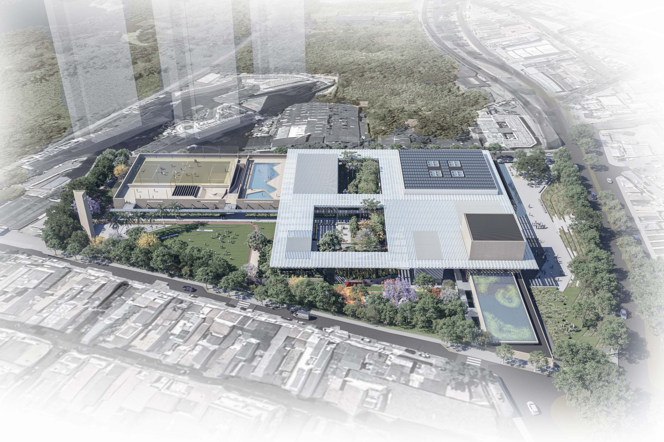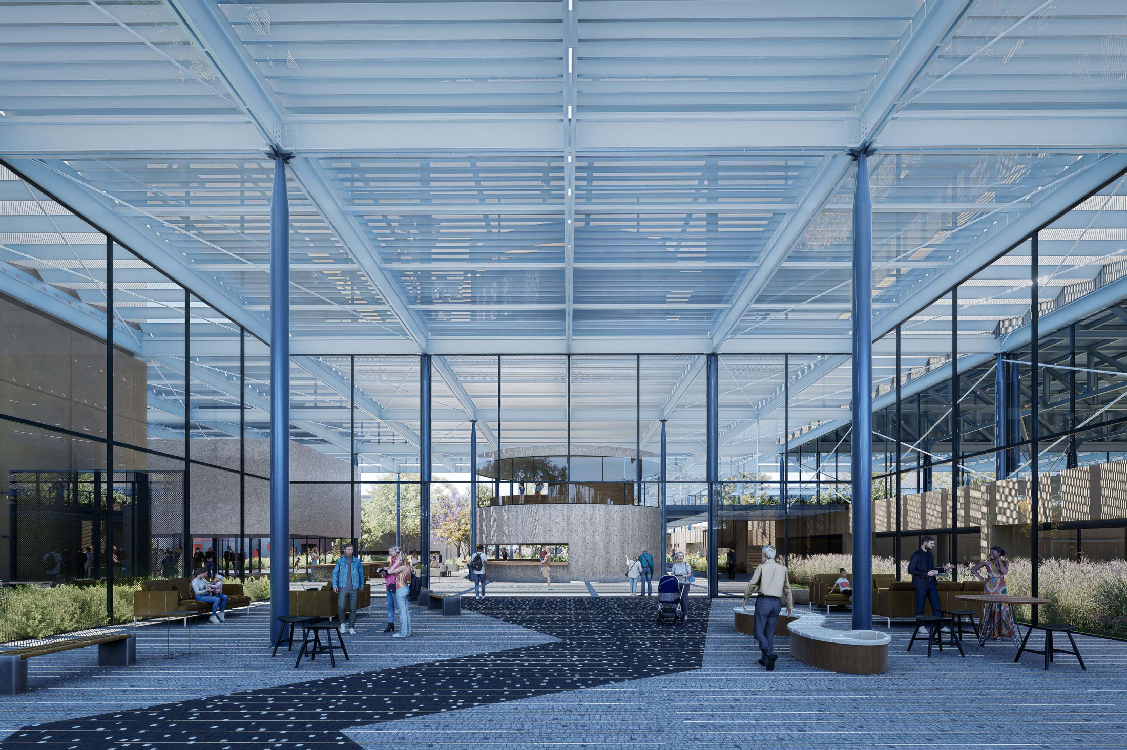 A sustentabilidade e a tecnologia desempenham papel central no projeto. A arquitetura é concebida como uma ‘máquina sustentável’, com soluções que minimizam o impacto ambiental e priorizam a eficiência energética. A grande cobertura do complexo é projetada como proteção do calor excessivo e geradora da sombra que contribui para o conforto térmico dos espaços internos e externos. O projeto integra sistemas de captação de energia solar, reutilização de águas pluviais e iluminação e ventilação natural, garantindo o uso racional de recursos. A escolha de materiais, como estruturas metálicas e concreto pré-moldado, visa à durabilidade e rapidez na construção, coordenados como sistemas racionais, compatíveis e imprescindíveis para uma construção dessa complexidade de escala.