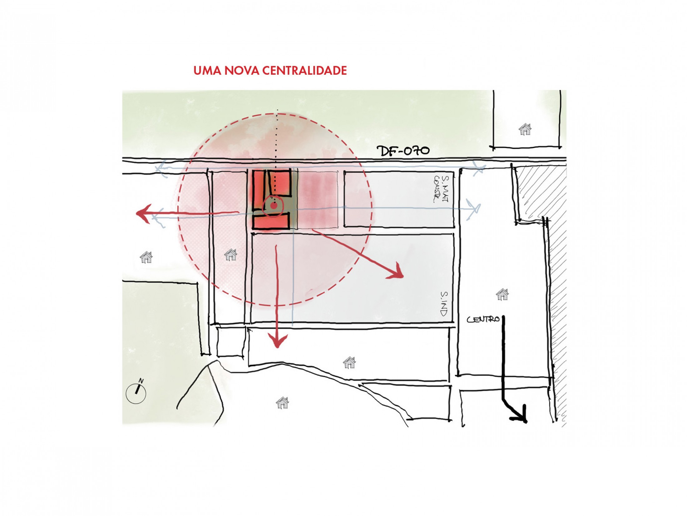 A proximidade da rodovia (BR-070), por exemplo, oferece a possibilidade de escoamento da produção agrícola para outras áreas, incluindo o Plano Piloto e as cidades vizinhas. Para isso, a implantação de um galpão voltado à logística, armazenamento e reciclagem, conectado ao complexo prático de qualificação e ao Mercado é oportuna. Essa rodovia é também um importante eixo para o posicionamento da UBS, pela facilidade de acesso, bem como para implantação de áreas comerciais de grande porte, edifícios de serviços e centros de distribuição.